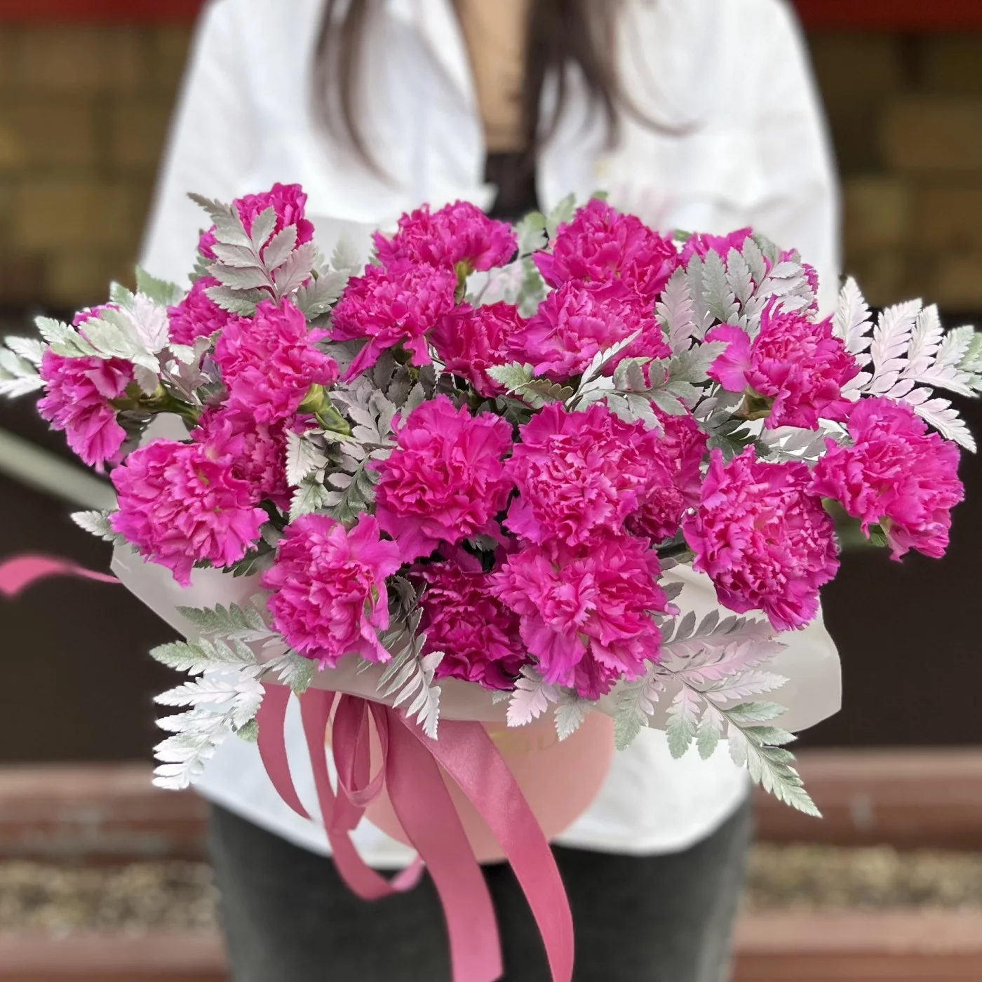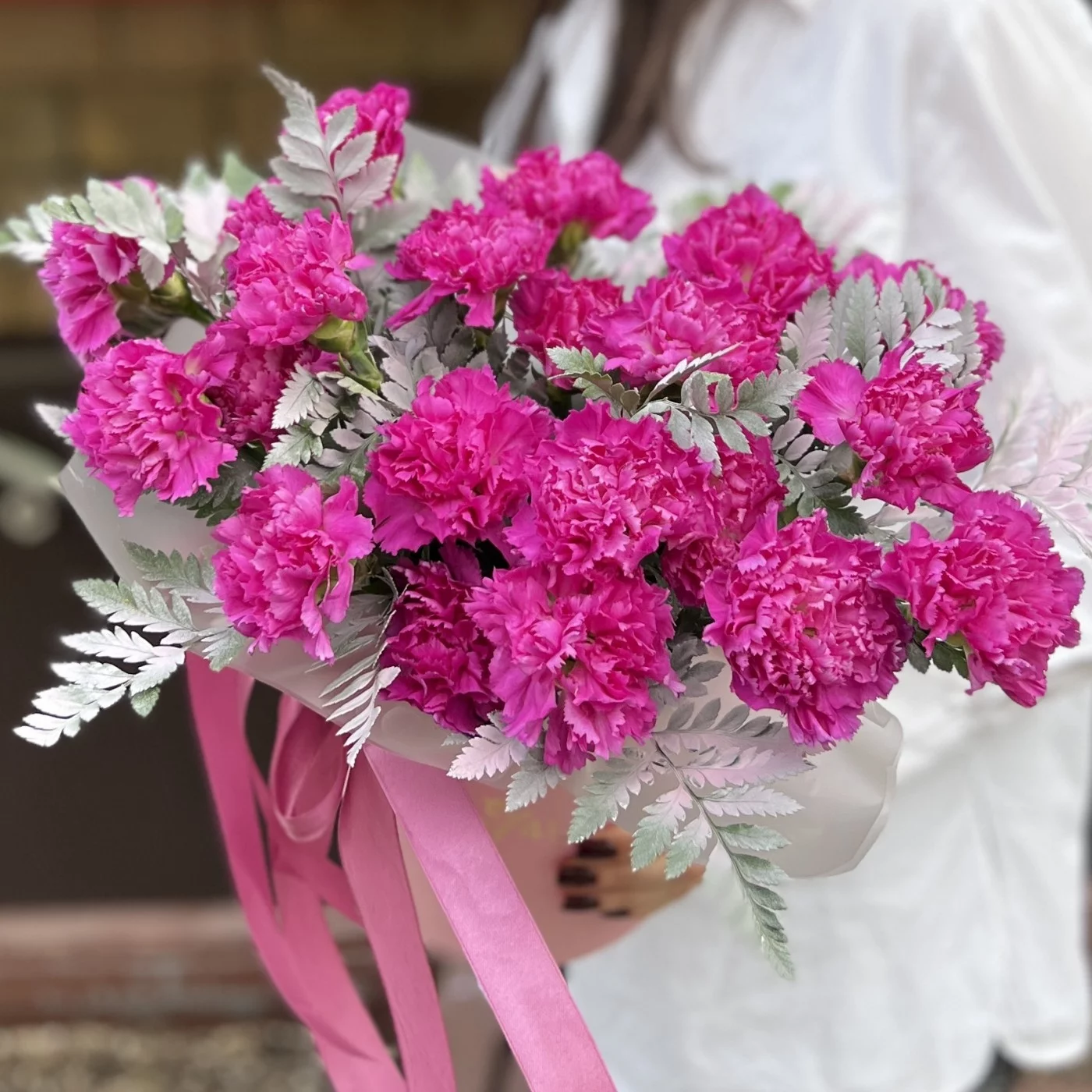 Фиолетовые гвоздики символизируют восхищение, уважение и загадочность, делая такой букет идеальным для выражения искренних чувств и особого внимания.
