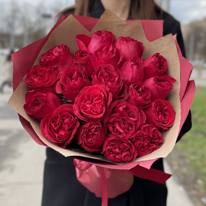 Яркий букет из пионовидных роз сорта Роуж Рояль. Прекрасный букет для подарка на свидание, юбилей или день рождения. Роза имеет крупный бутон и красивое раскрытие.