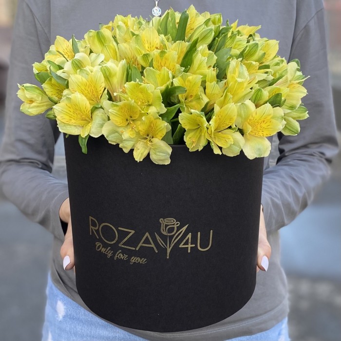 Подарочная коробка с красивыми альстромериями желтого цвета. Прекрасный презент на любое мероприятие. Альстромерии очень стойкие и красивые цветы. Такая коробка будет оригинально смотреться в интерьере. Цветы в коробке очень удобный подарок, за ними легко ухаживать. Не требует вазы и замены воды. Нужно просто поливать раз в два дня по небольшому количеству воды.