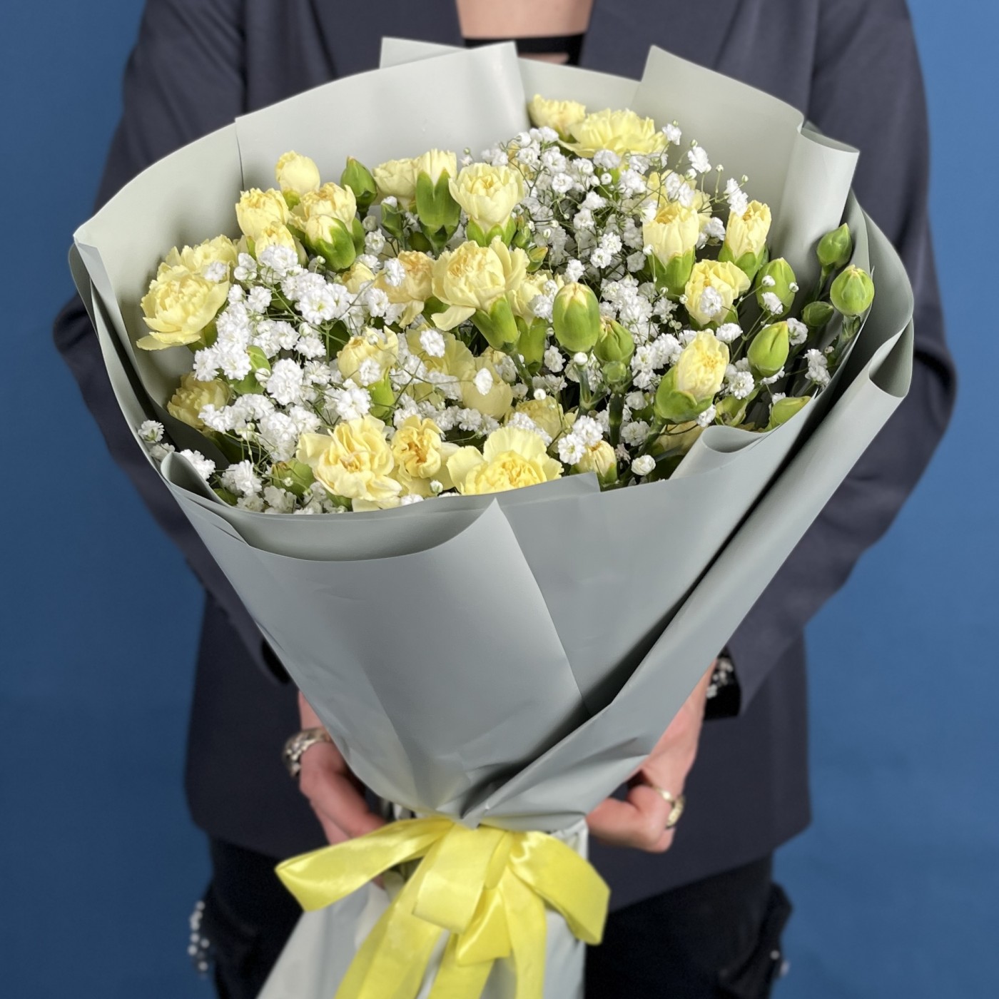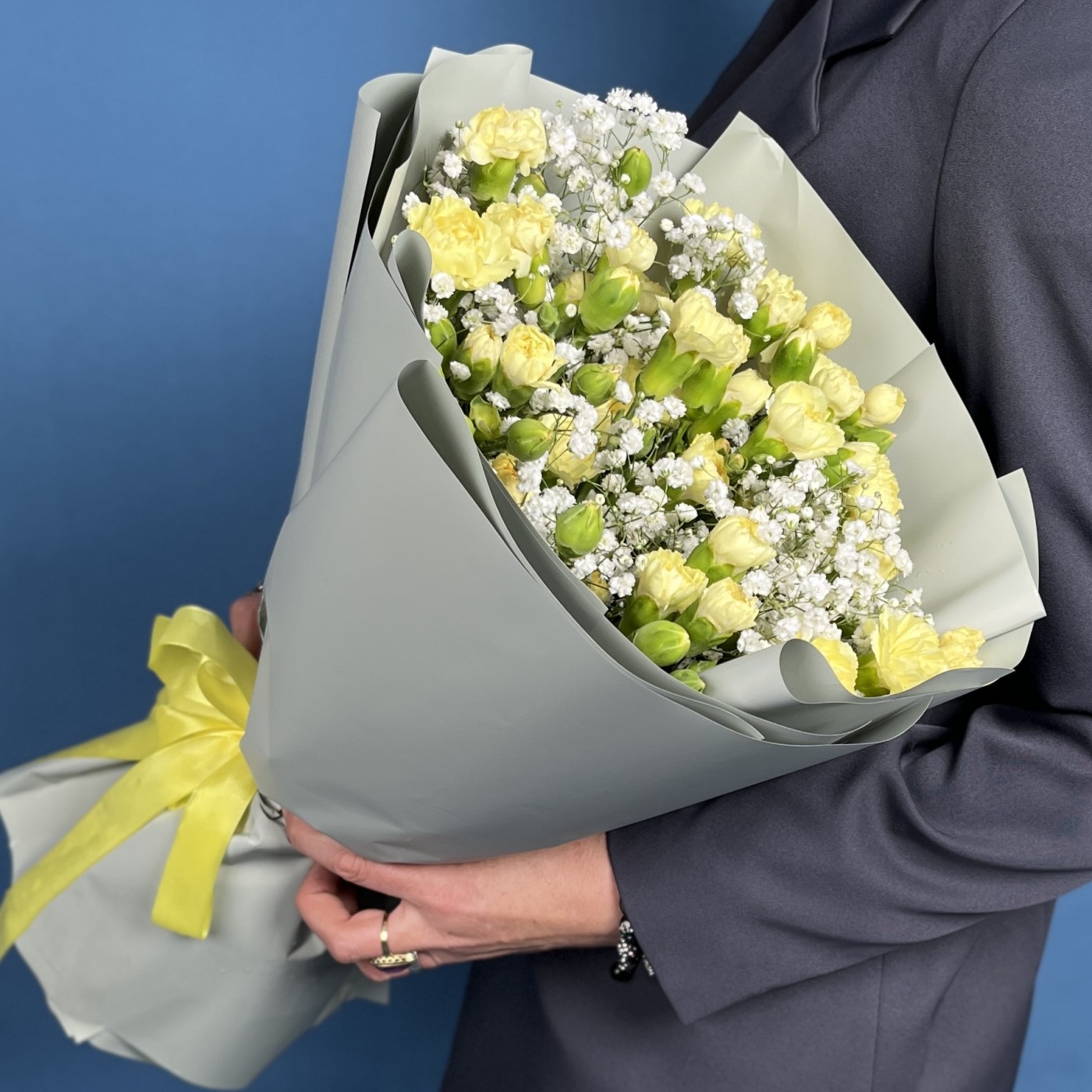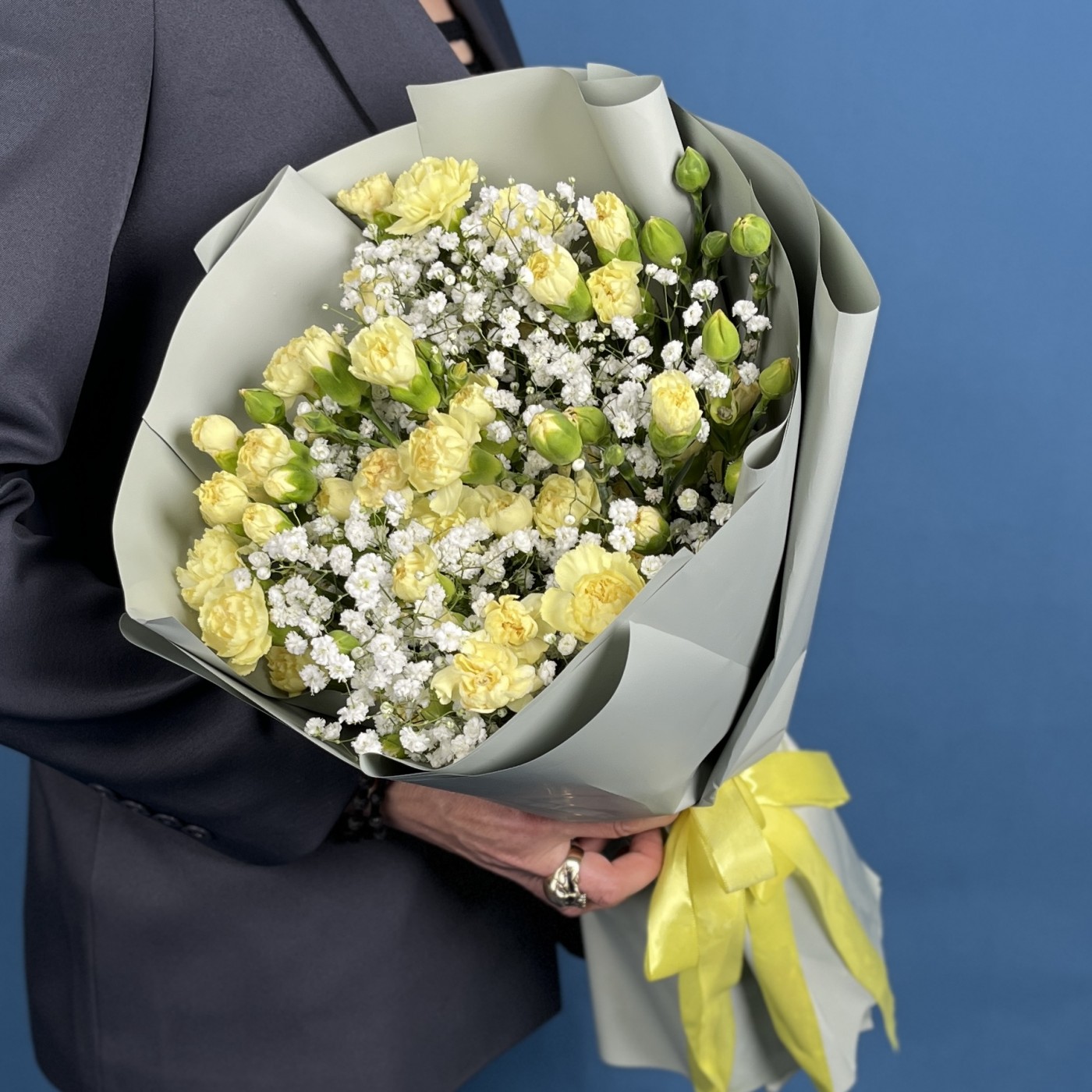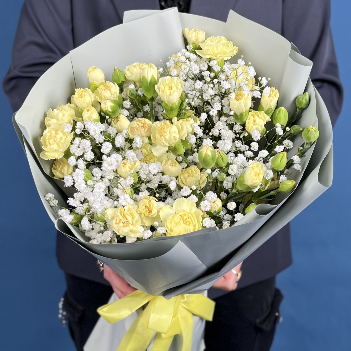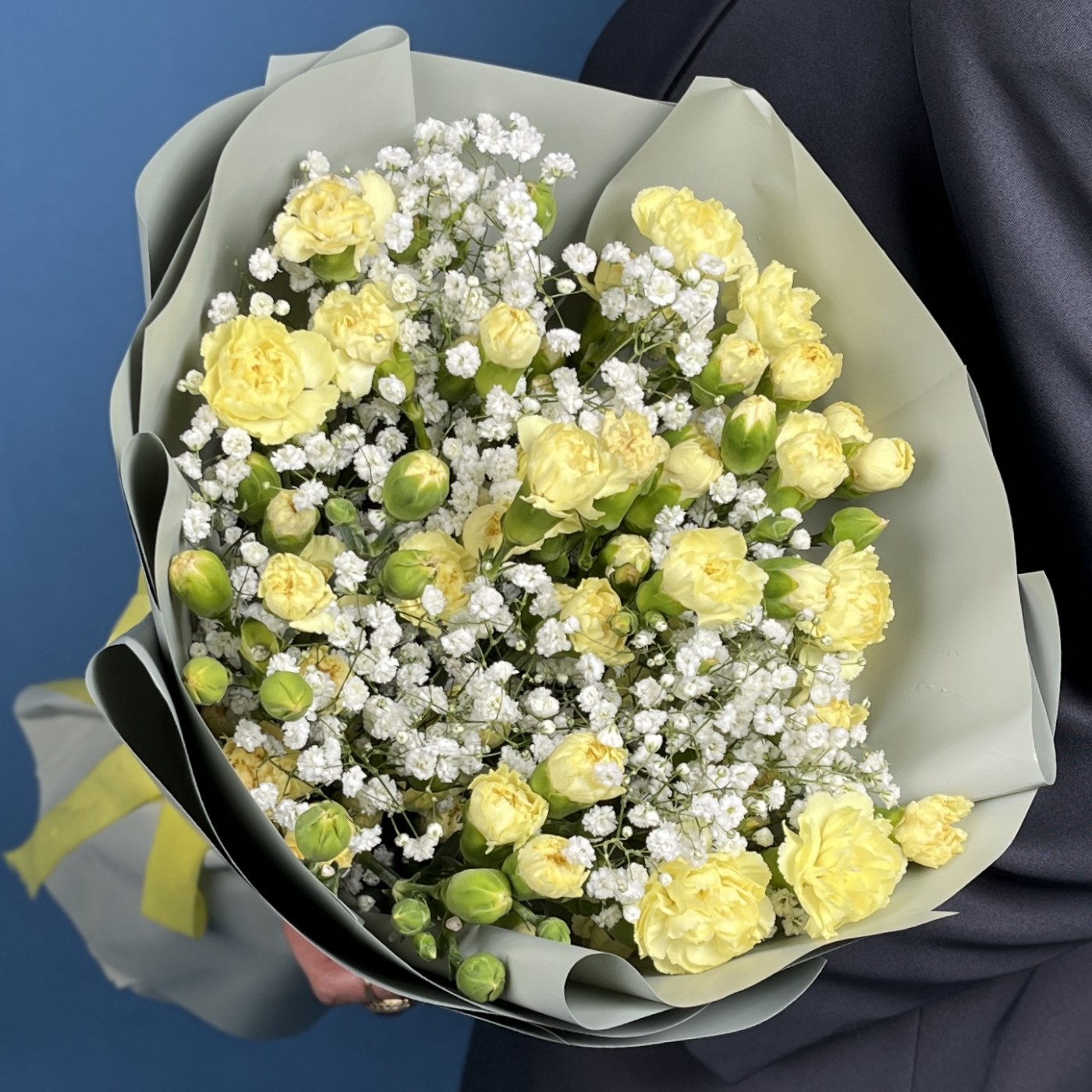 Желтая гвоздика символизирует дружбу, счастье и светлые моменты, а гипсофила добавляет нежности и воздушности.