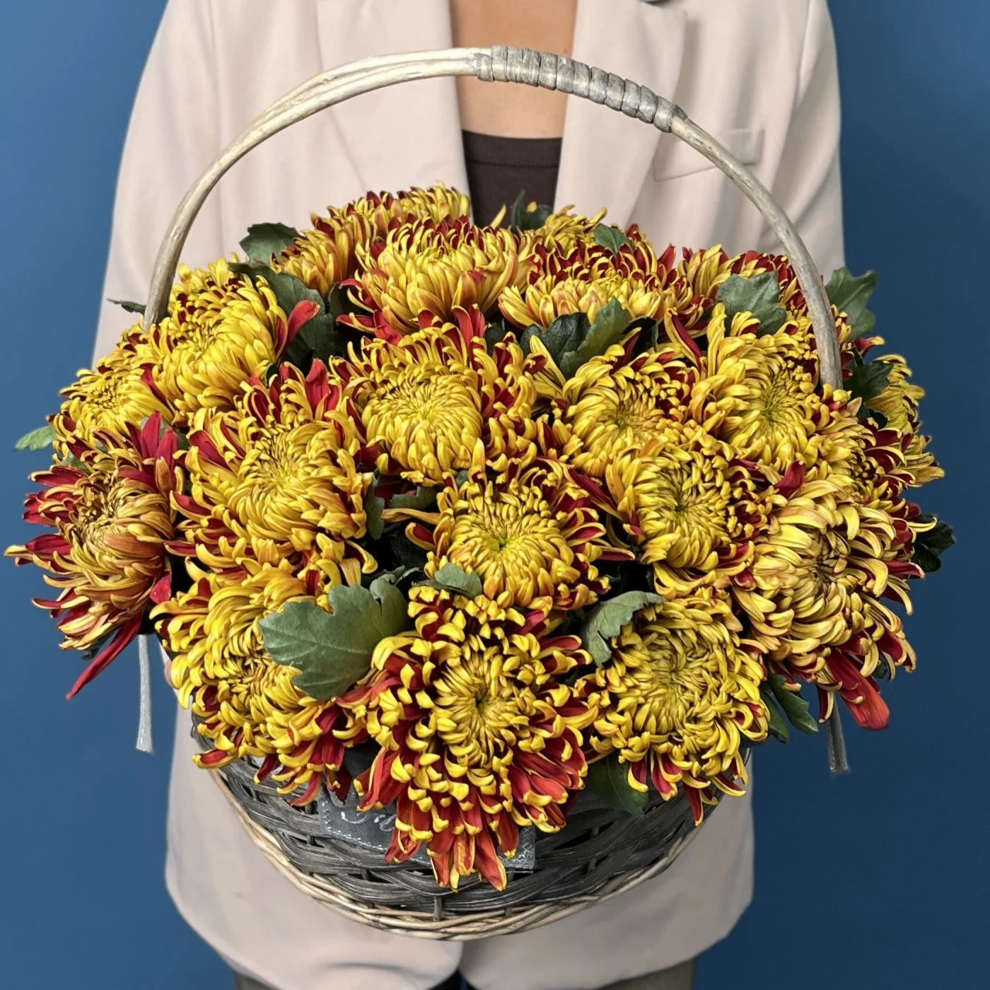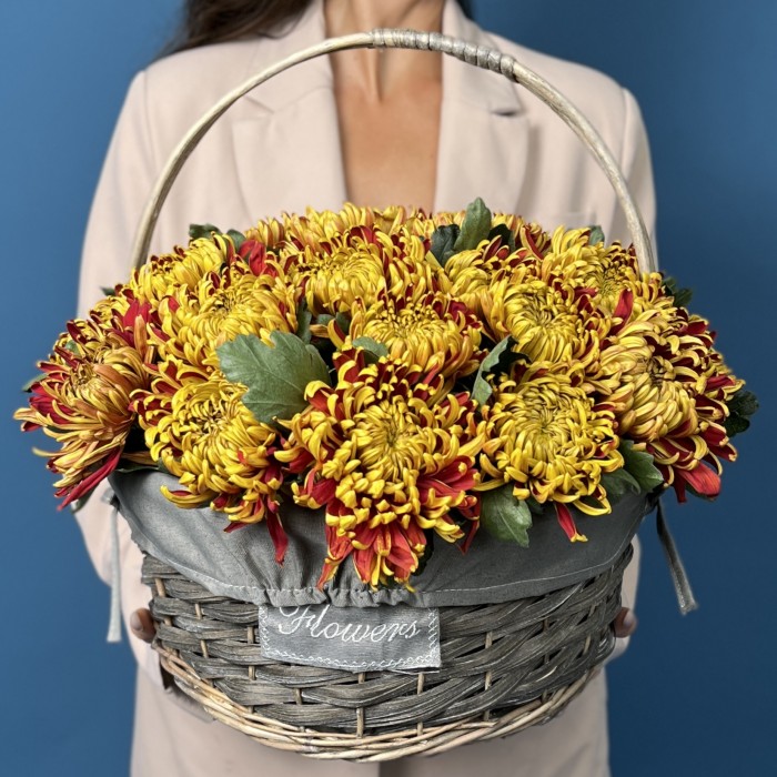 Яркая и эффектная композиция из 25 желто-красных хризантем сорта Том Пирс, гармонично оформленных в стильную корзину. Этот букет принесёт тепло, радость и атмосферу праздника, станет прекрасным украшением интерьера или запоминающимся подарком.
