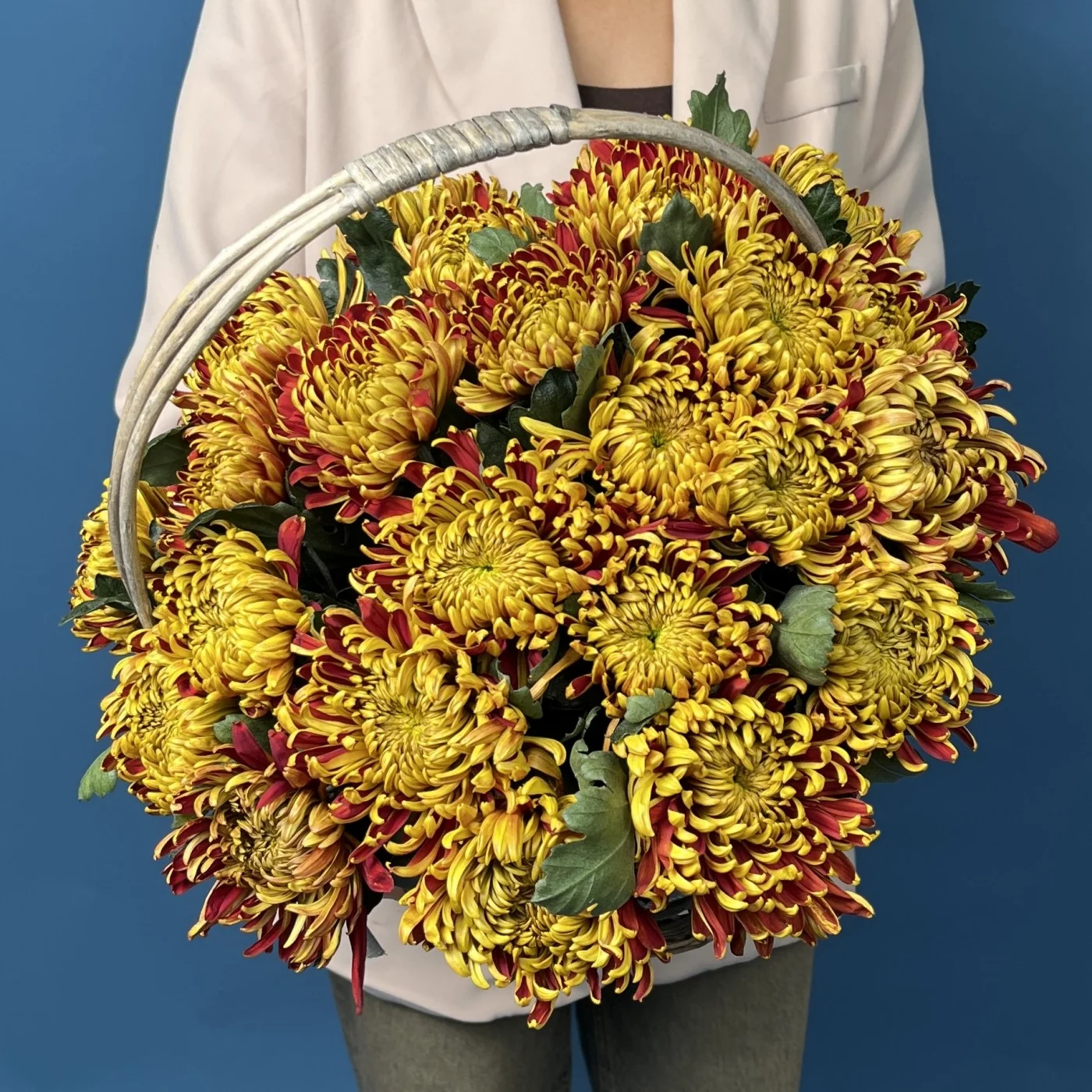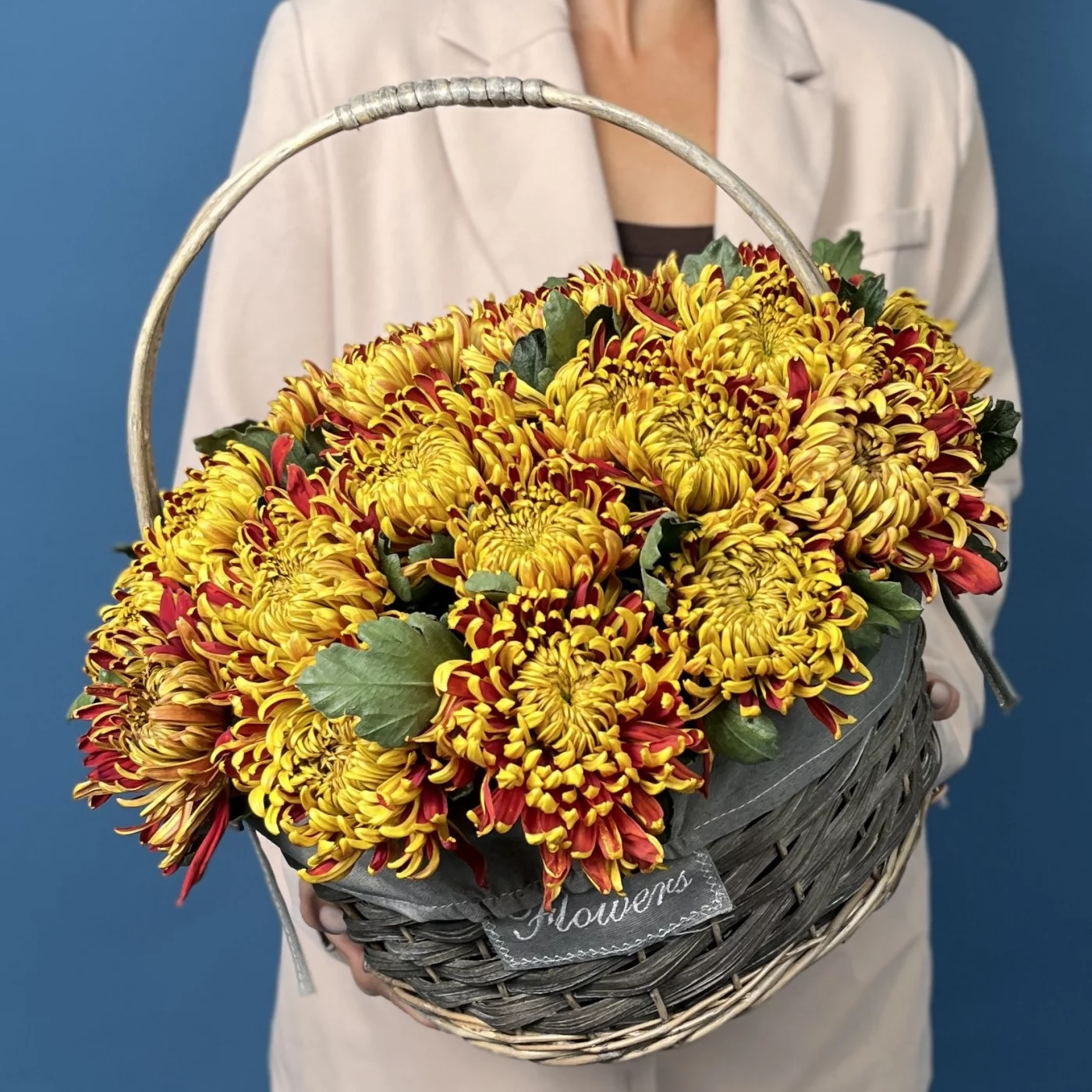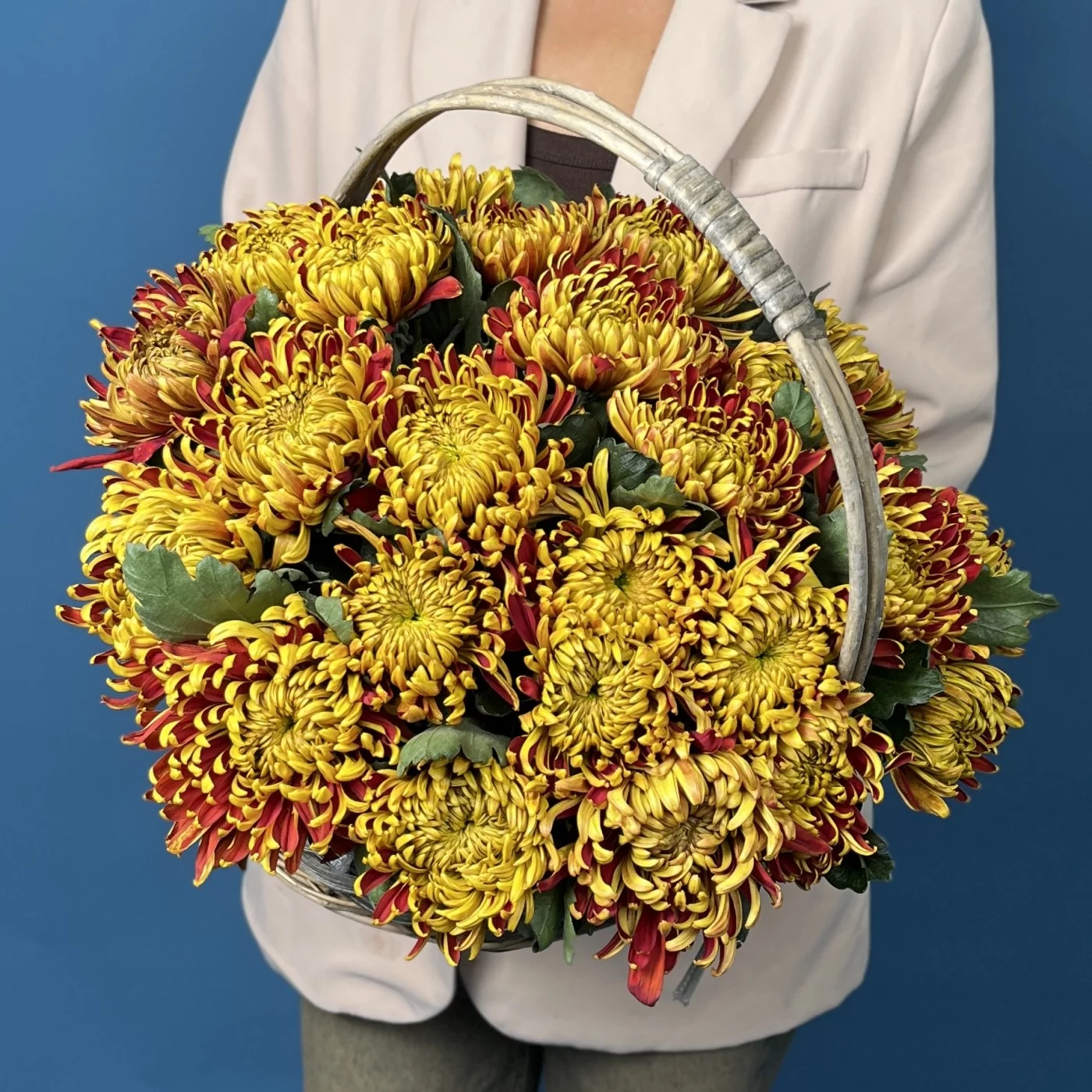 25 желто-красных хризантем Том Пирс в корзине