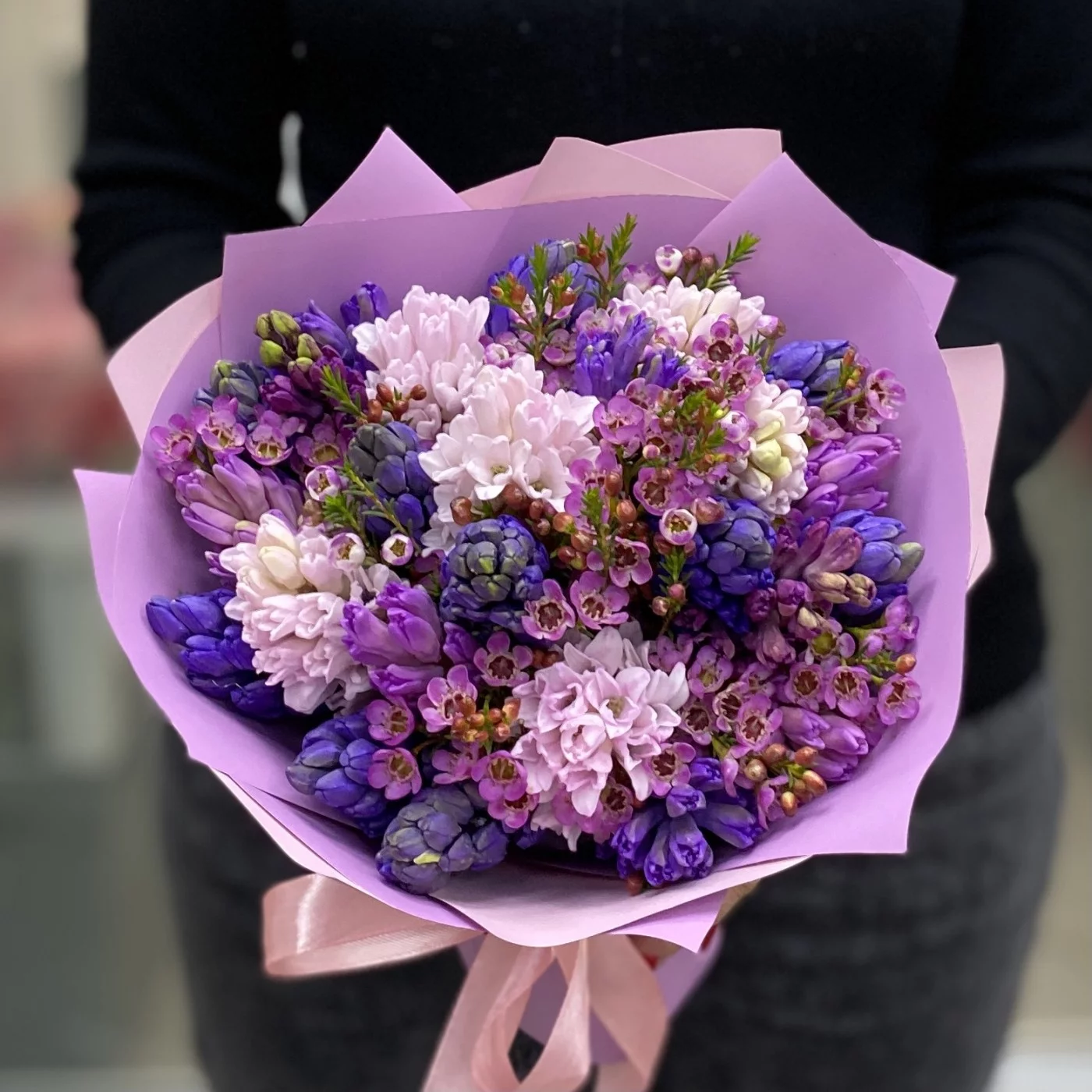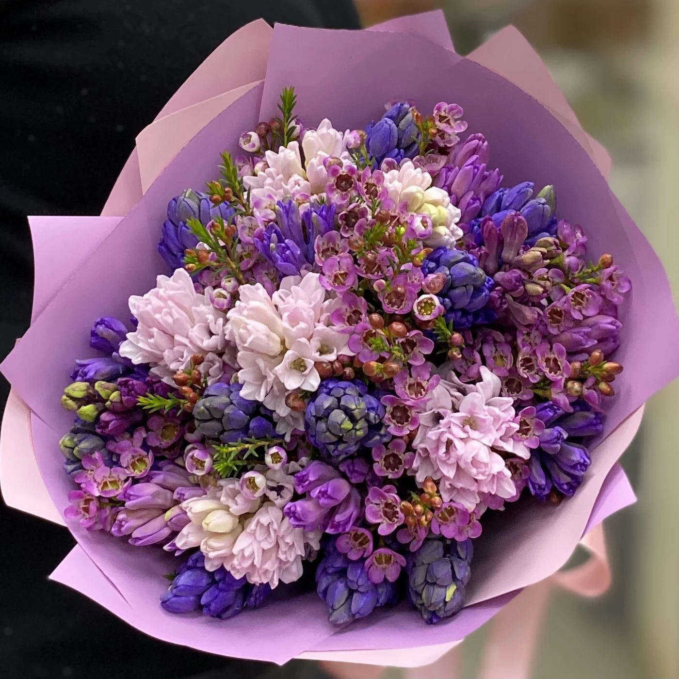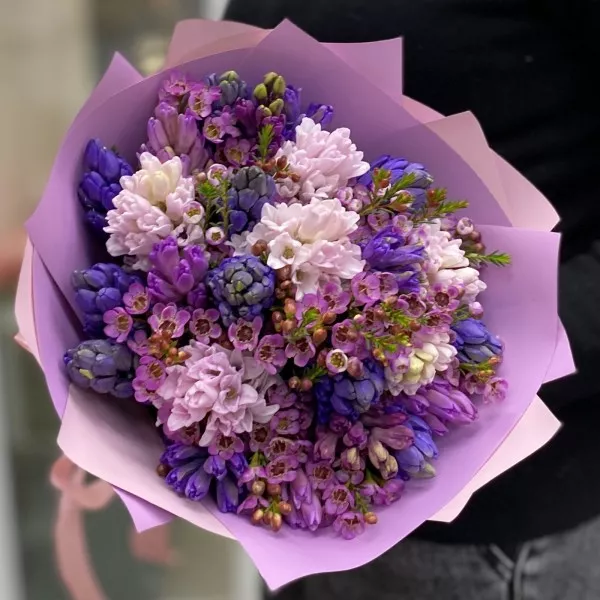 Ароматные долгоиграющие и завораживающие своим раскрытием гиацинты в дуэте с душистым и фактурным ваксфлауэром не оствят равнодушным ни одного любителя весенних запахов и красок.