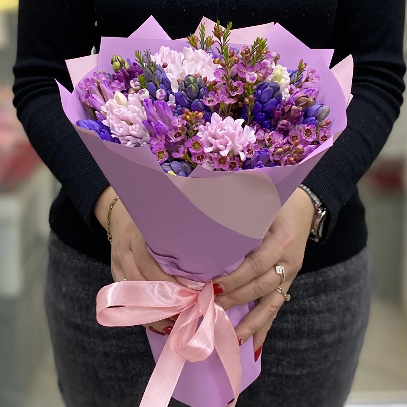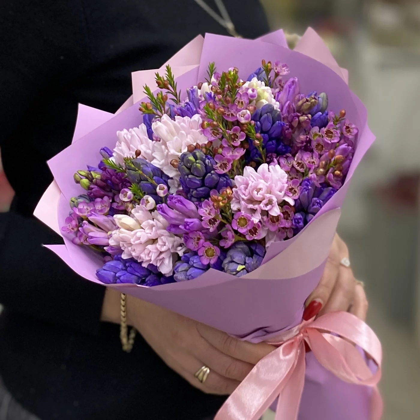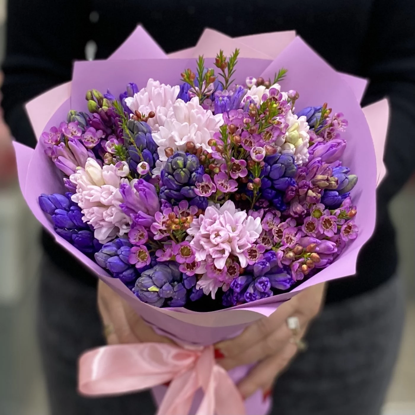 Ароматные долгоиграющие и завораживающие своим раскрытием гиацинты в дуэте с душистым и фактурным ваксфлауэром не оствят равнодушным ни одного любителя весенних запахов и красок.