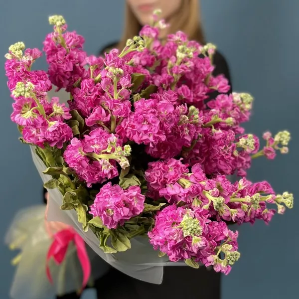Букет из 25 ароматных малиновых маттиол — это не просто цветы, а настоящее произведение искусства, которое способно поднять настроение и украсить любой интерьер.