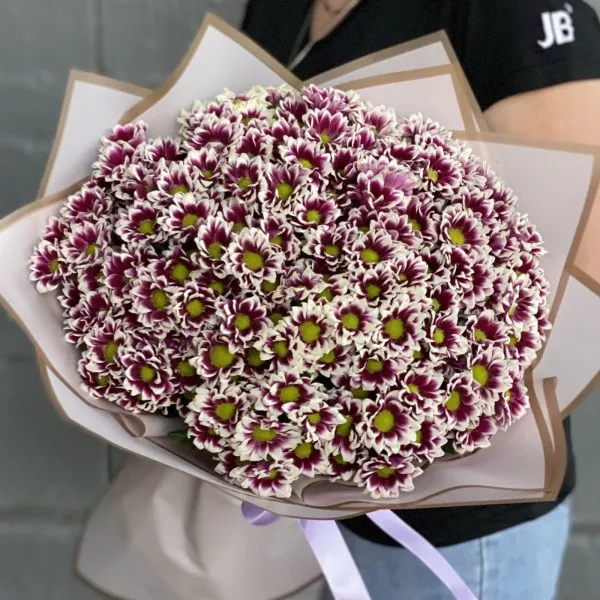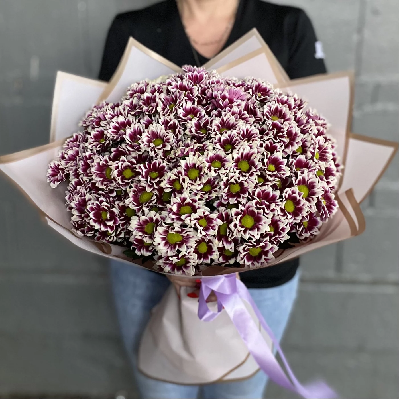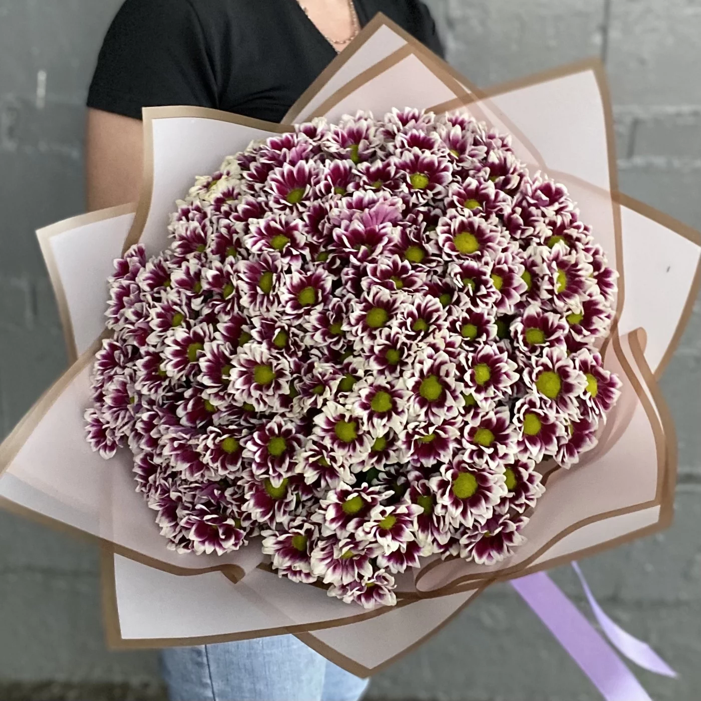 25 бело-фиолетовых хризантем Сантини — это отличный вариант подарка девушке или женщине по любому поводу.