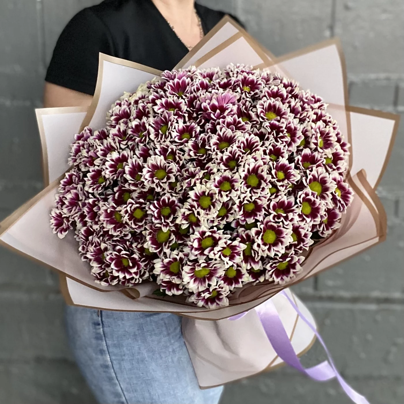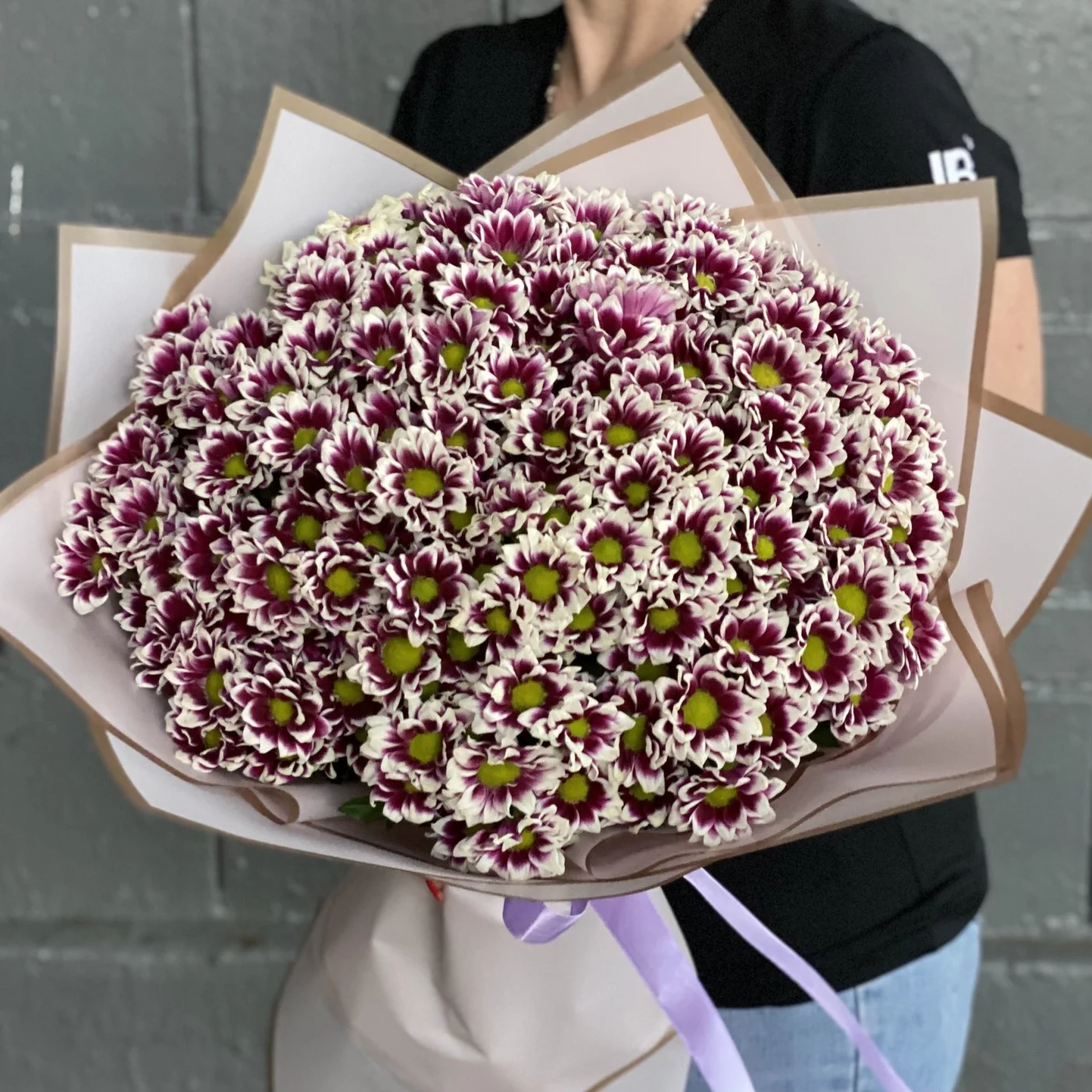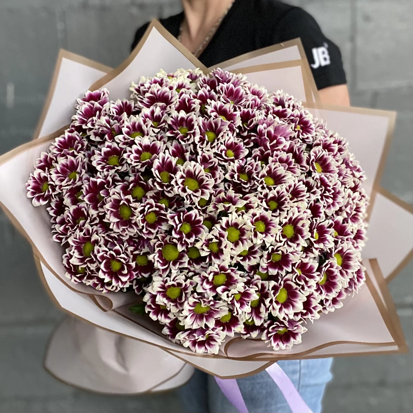 25 бело-фиолетовых хризантем Сантини — это отличный вариант подарка девушке или женщине по любому поводу.