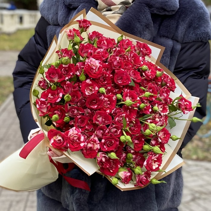 Роскошный букет из 25 кустовых роз является отличным подарком для любимой девушки, матери, близкой подруги.