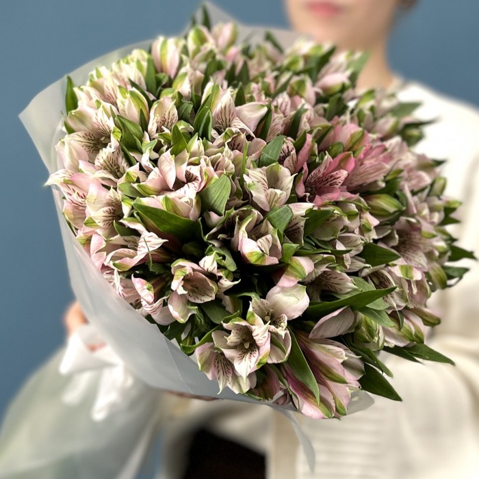 25 бело-розовых альстромерий — прекрасный и выразительный букет, который сочетает в себе нежность и торжественность, подчёркивая глубину и искренность ваших чувств.