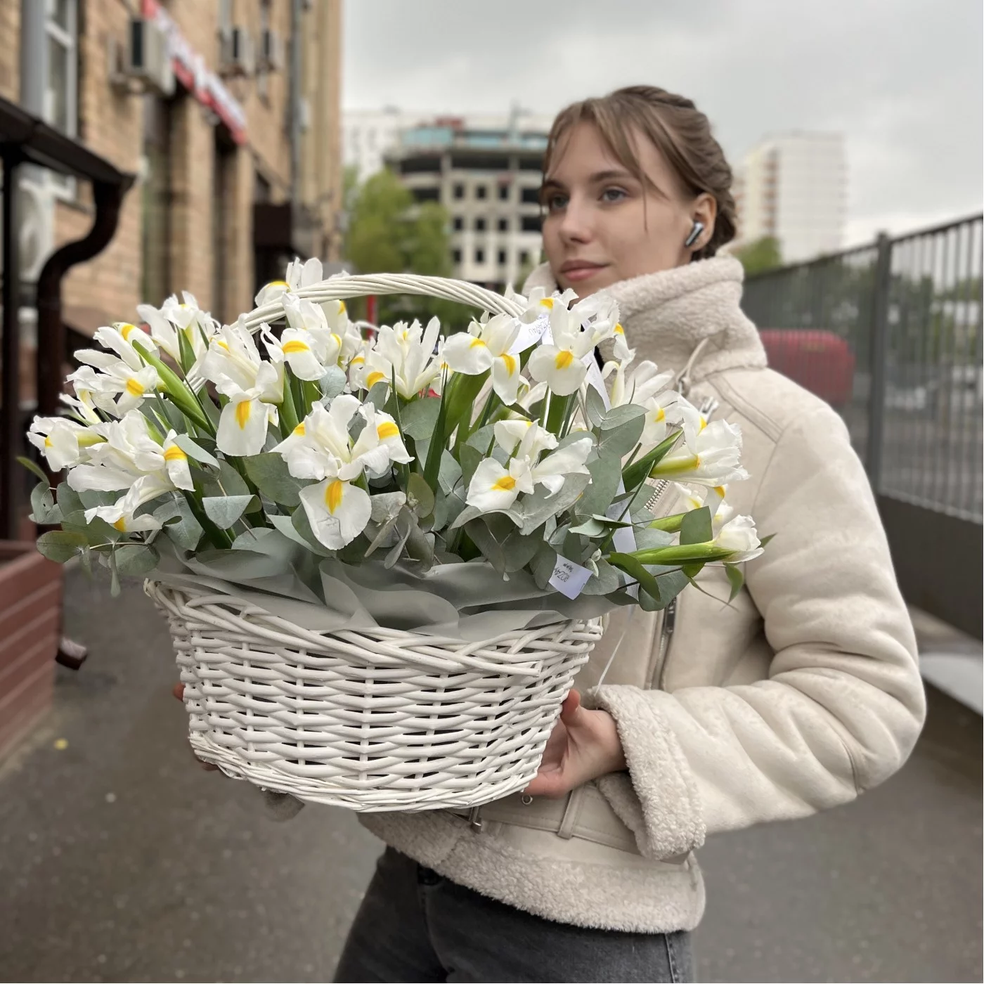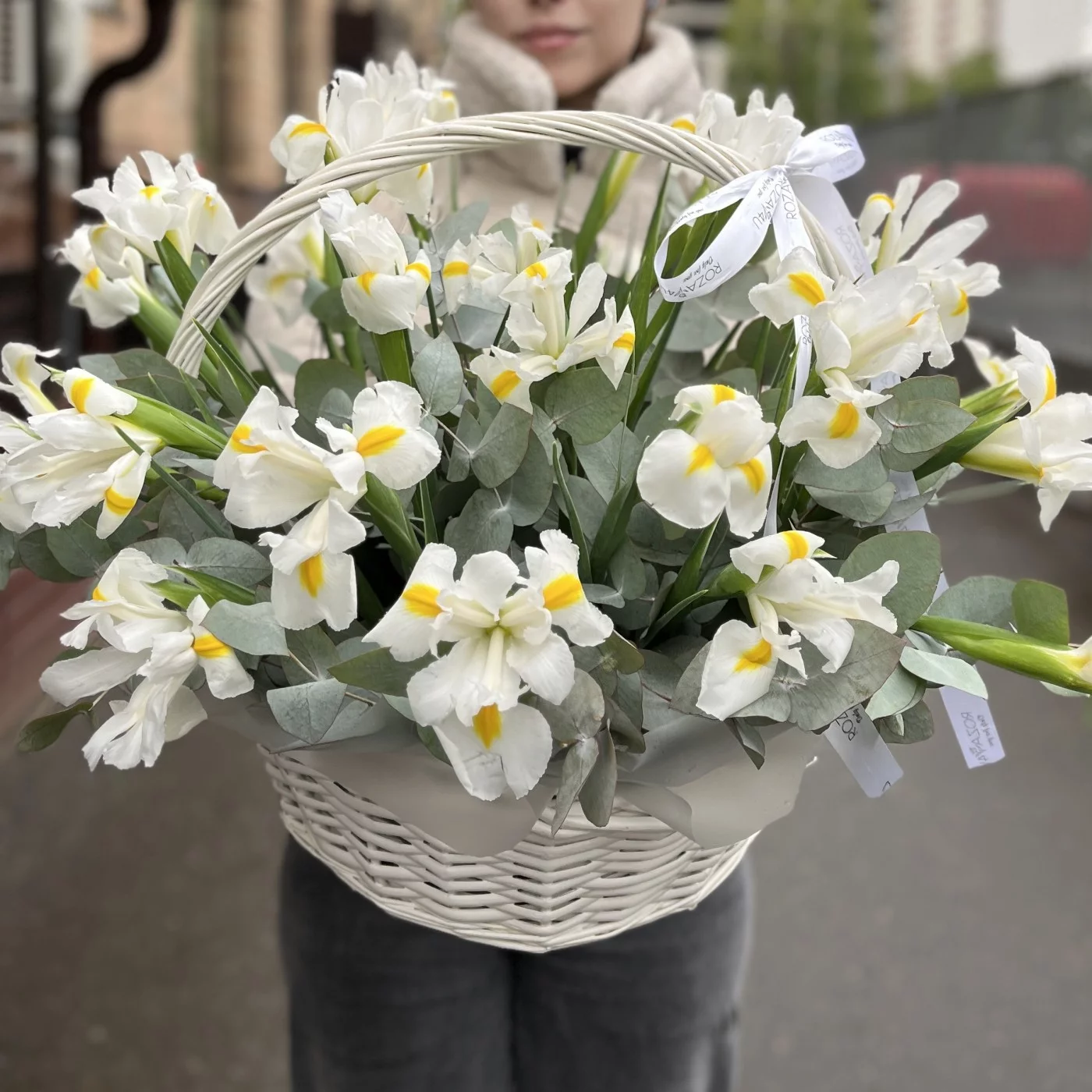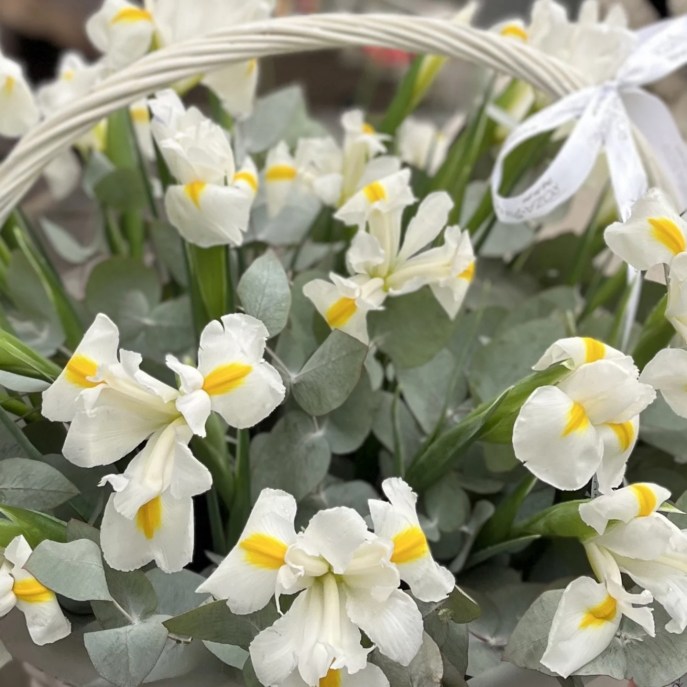 25 белых ирисов в корзине