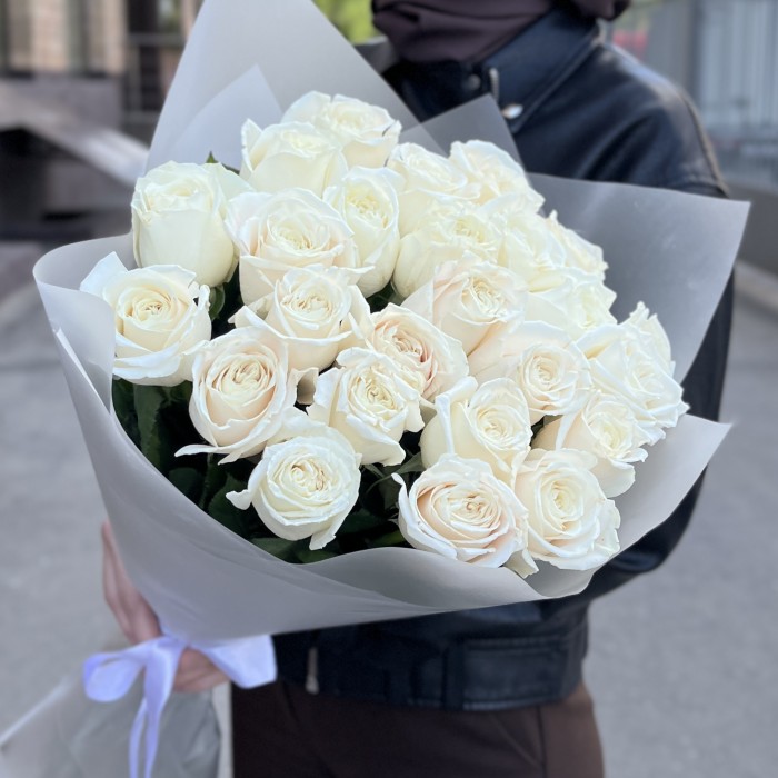 Букет из 25 белых роз Проуд высотой 60 см — это роскошное выражение чувств. Каждая роза с бархатистыми лепестками добавляет изысканности и свежести. Идеален для свадеб, юбилеев или как знак уважения, этот букет не оставит никого равнодушным.