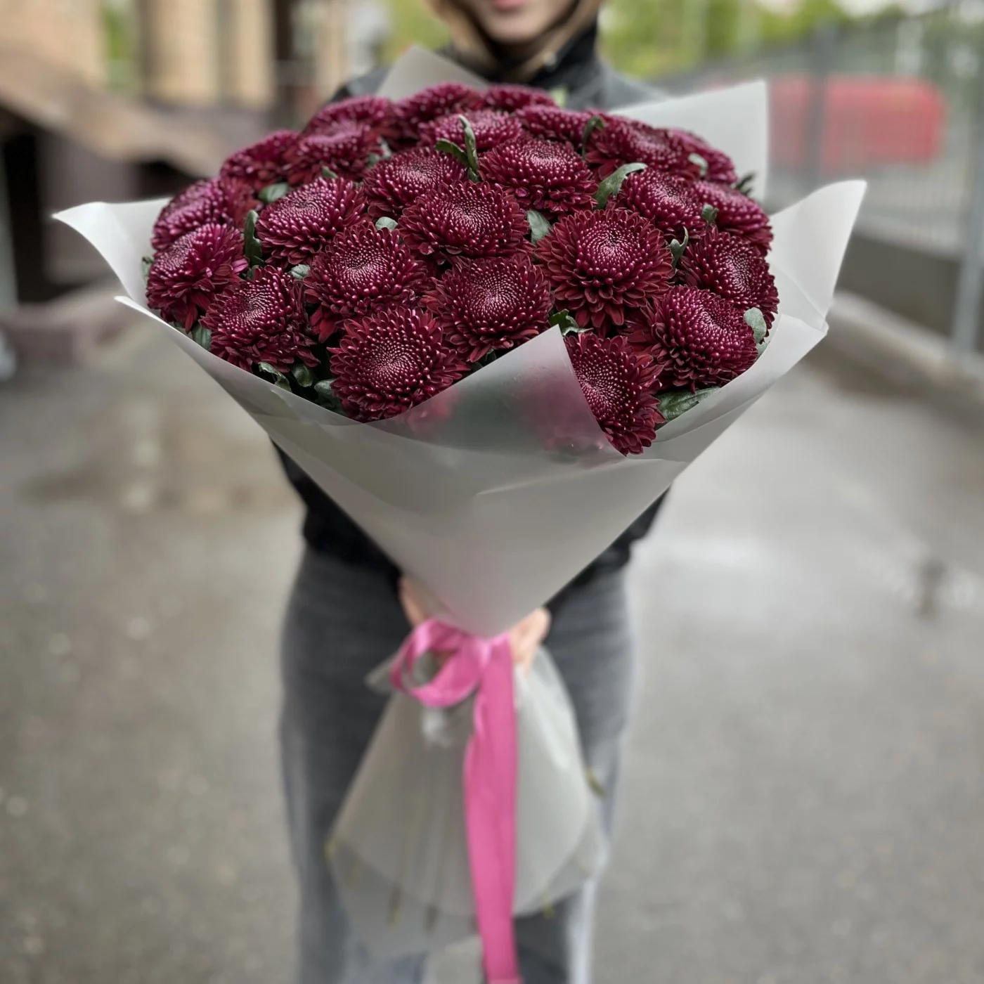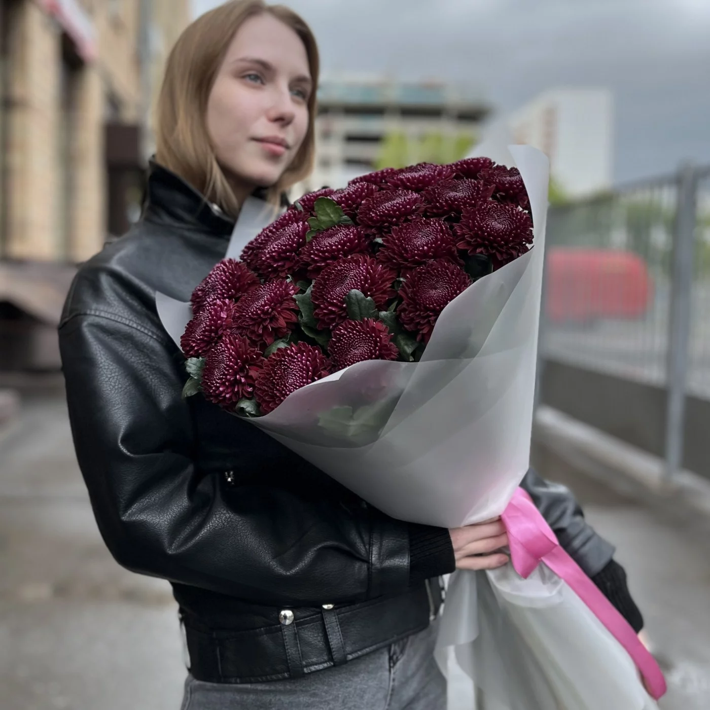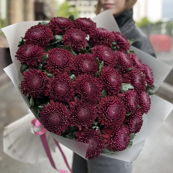 25 бордово-фиолетовых хризантем сорта Покер. Их насыщенные, глубокие оттенки бордового и фиолетового придают композиции благородство и таинственность, а крупные цветы создают эффектный визуальный акцент.