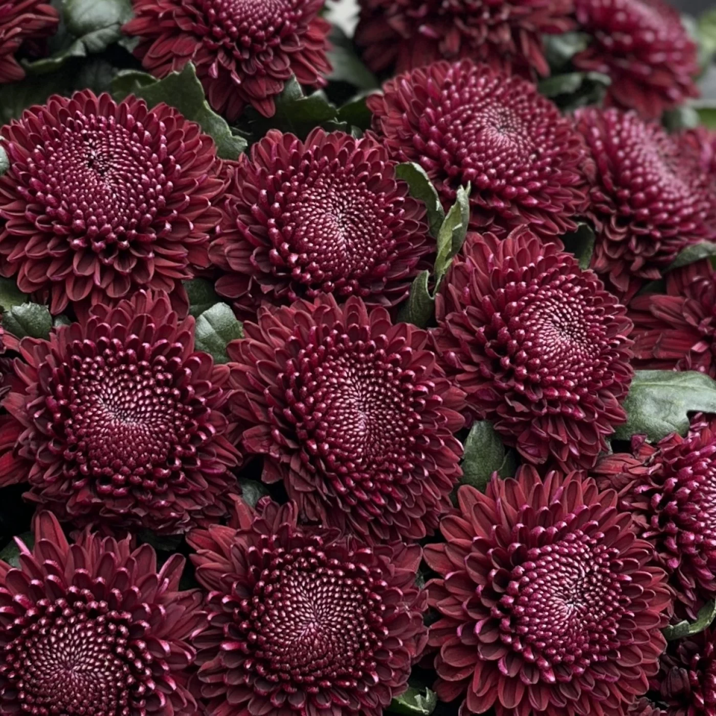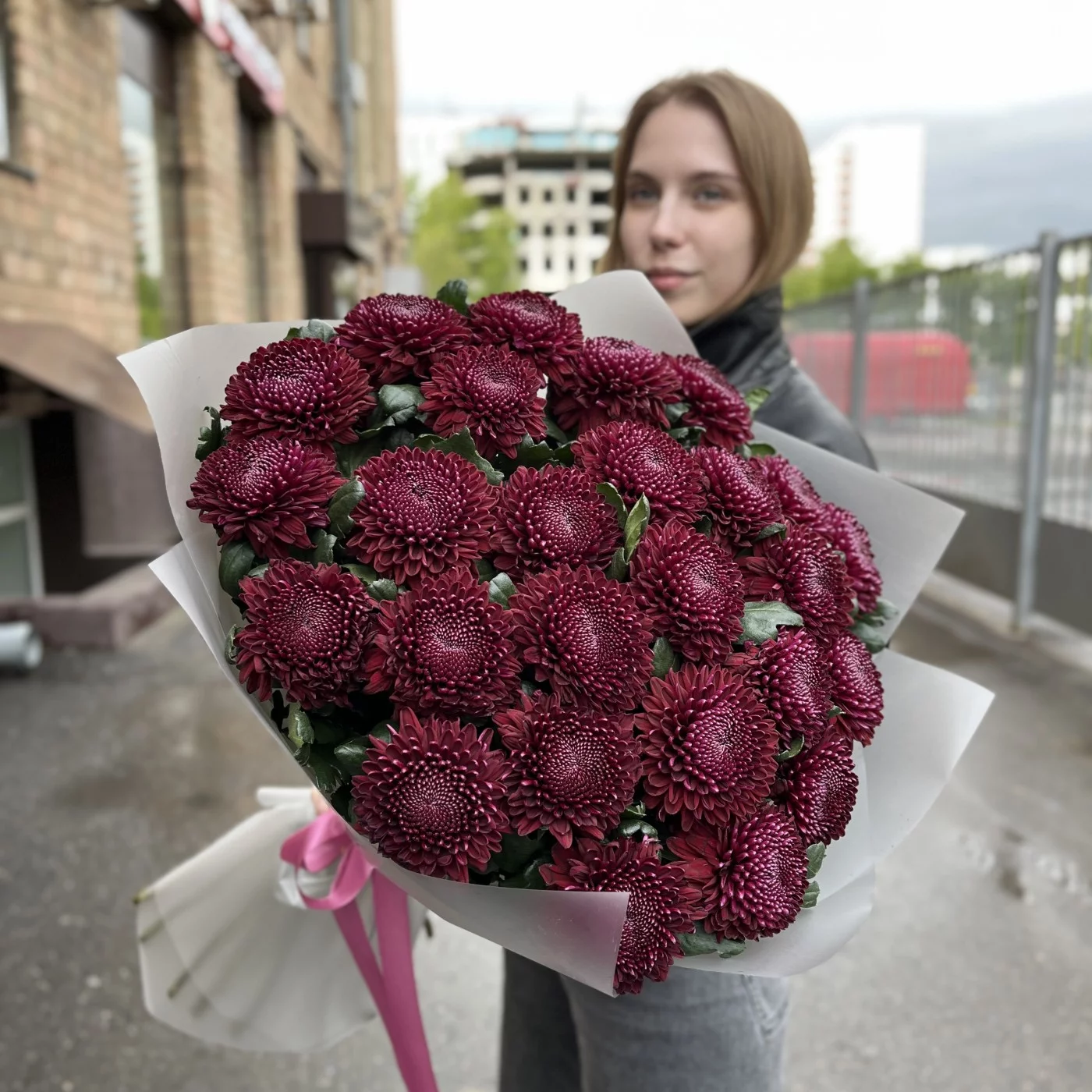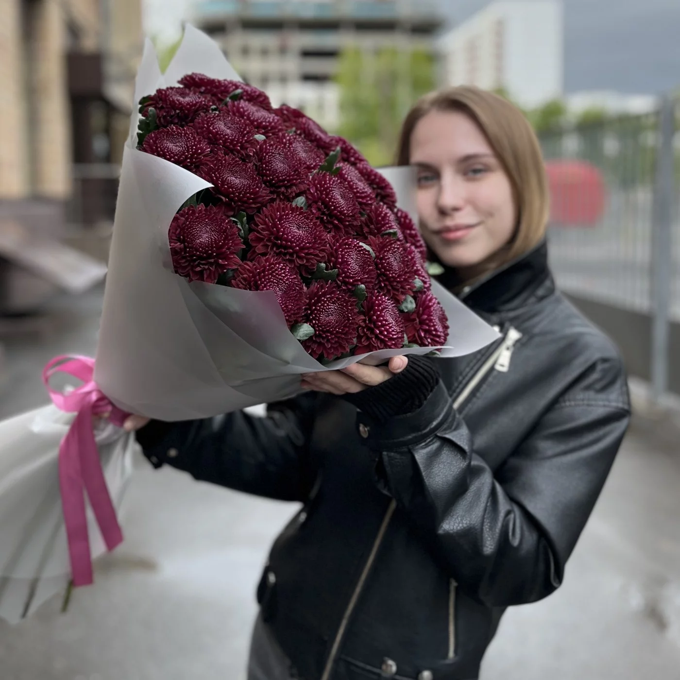 25 бордово-фиолетовых хризантем сорта Покер. Их насыщенные, глубокие оттенки бордового и фиолетового придают композиции благородство и таинственность, а крупные цветы создают эффектный визуальный акцент.
