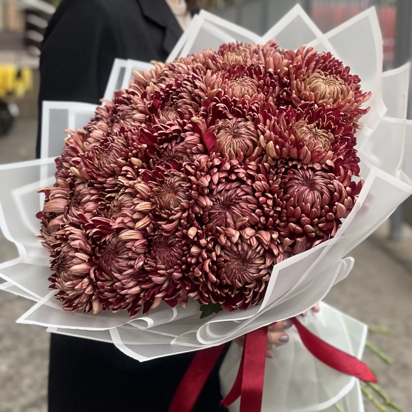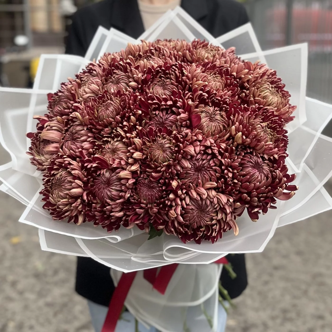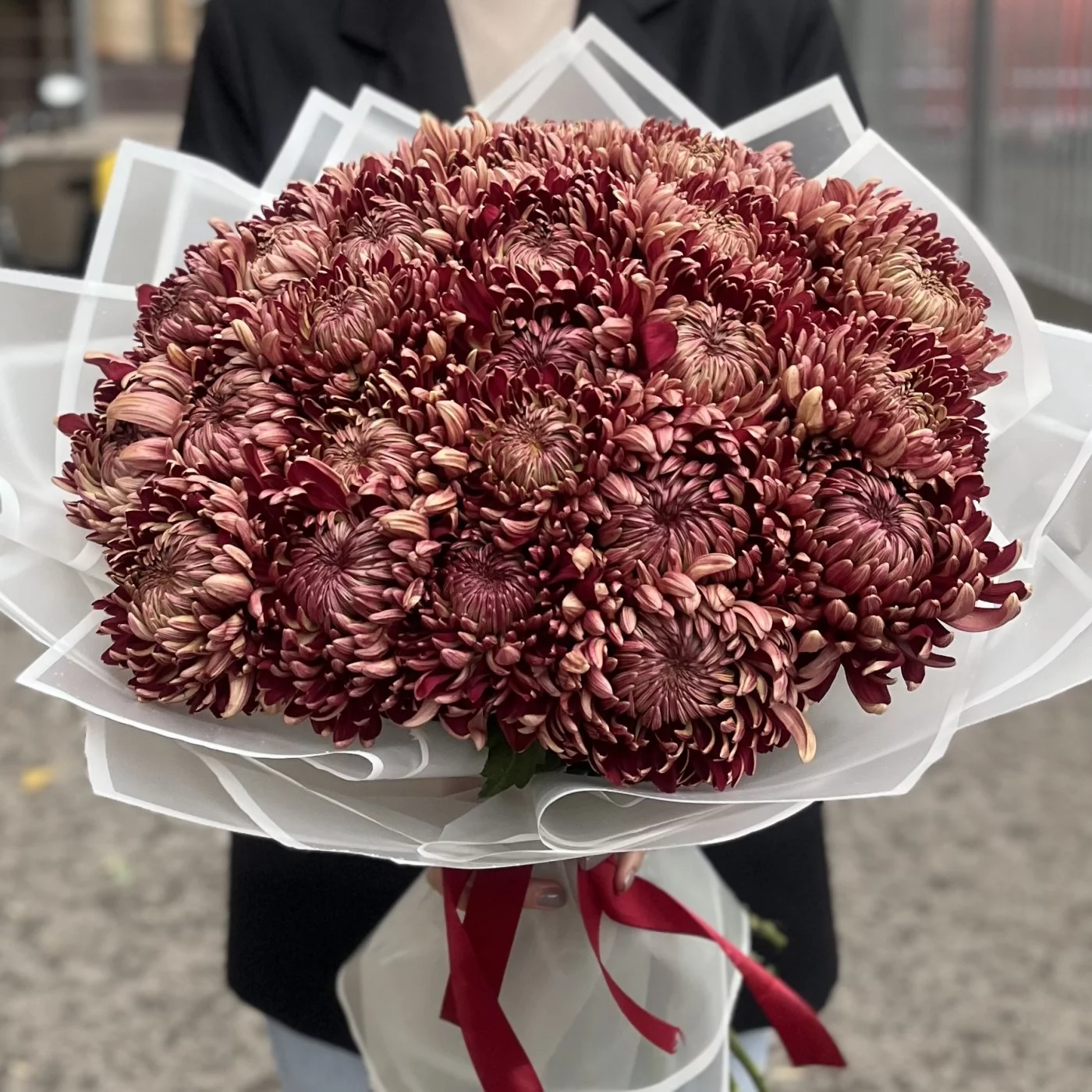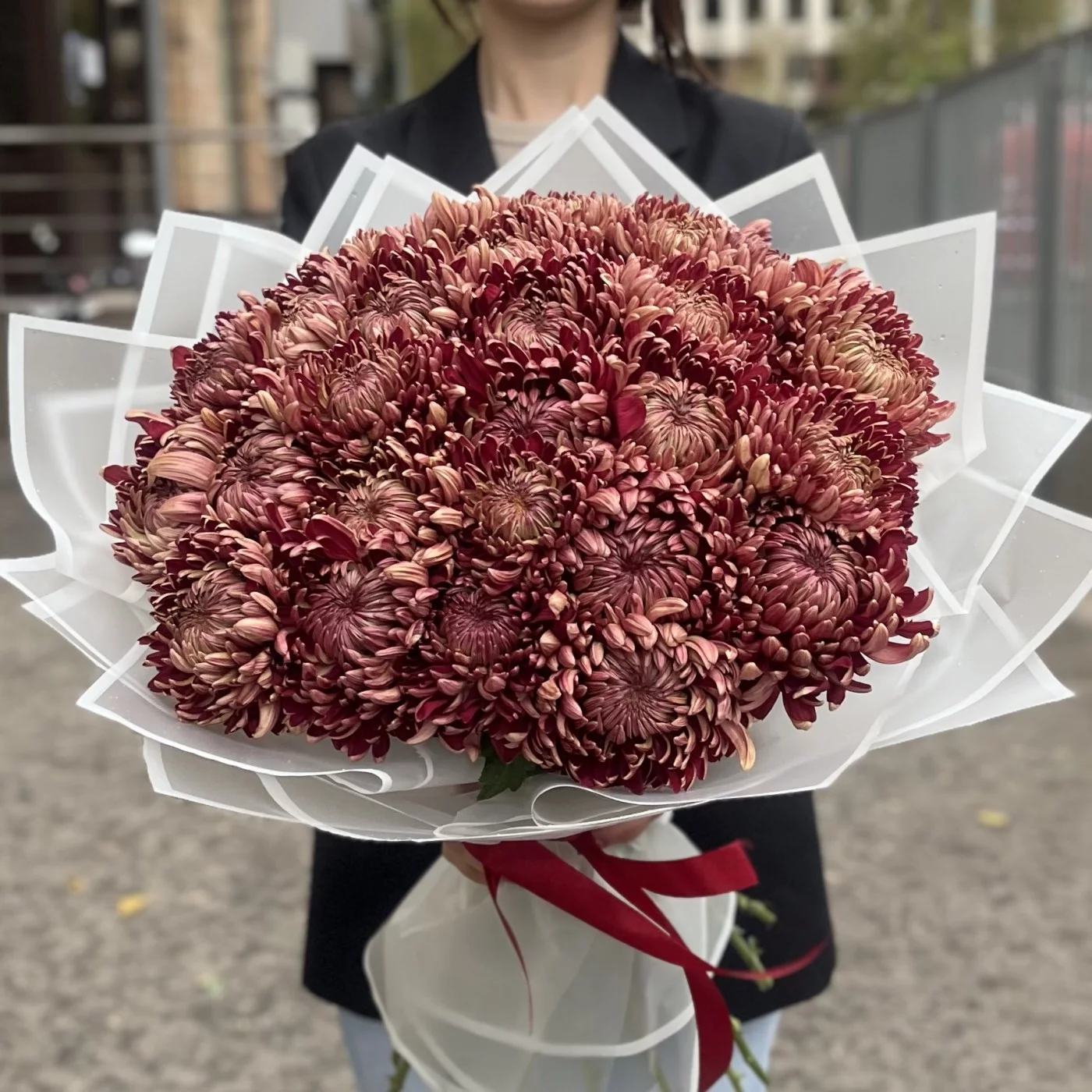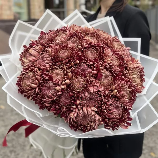 Букет из 25 крупных бордовых хризантем не оставит свою получательницу равнодушной.