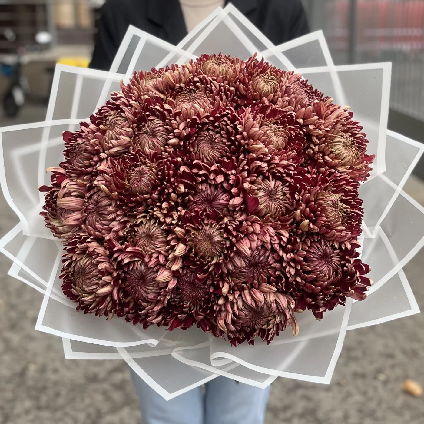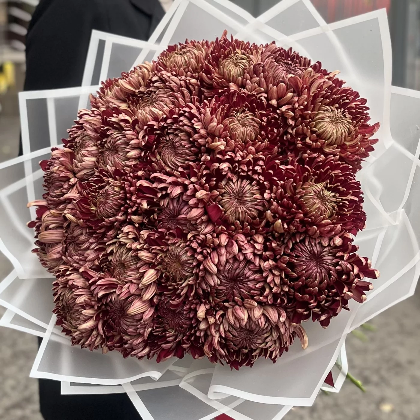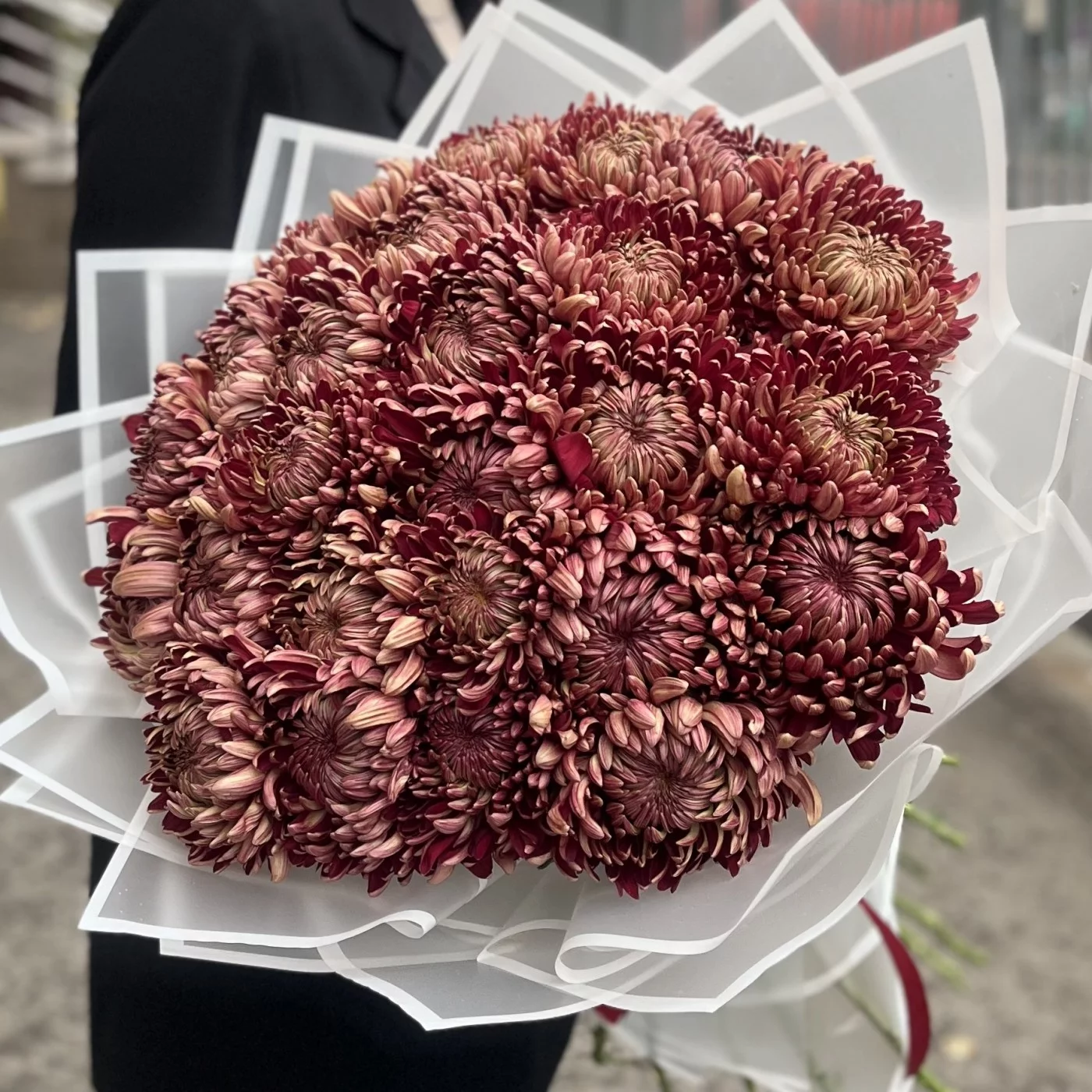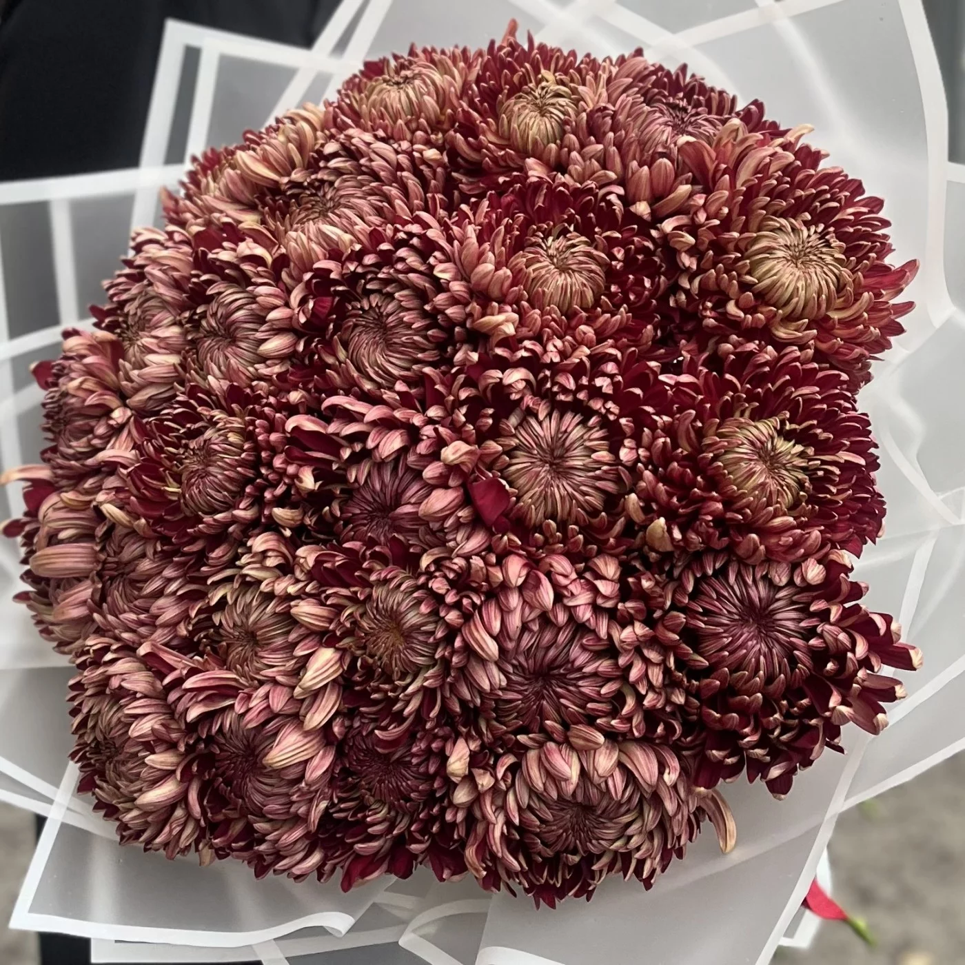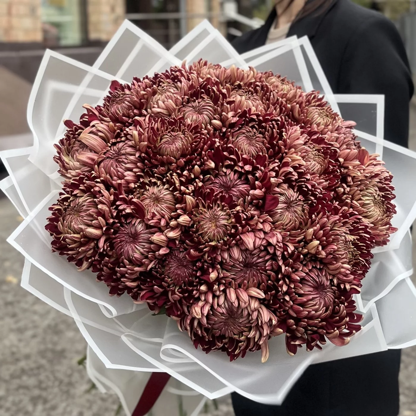 Букет из 25 крупных бордовых хризантем не оставит свою получательницу равнодушной.