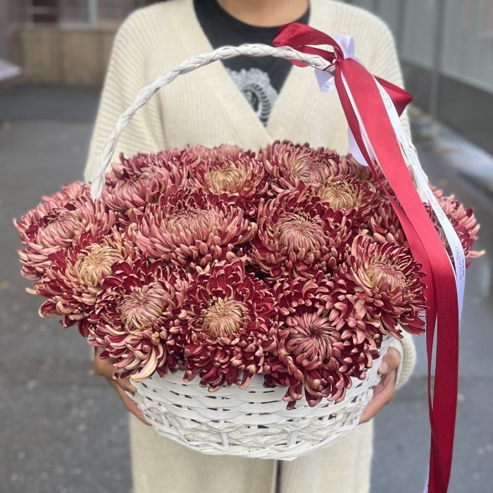 Корзина из 25 крупных бордовых хризантем не оставит свою получательницу равнодушной.