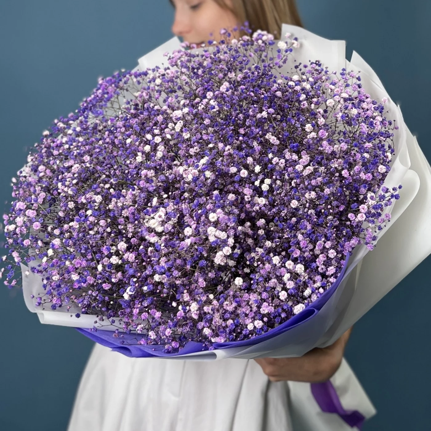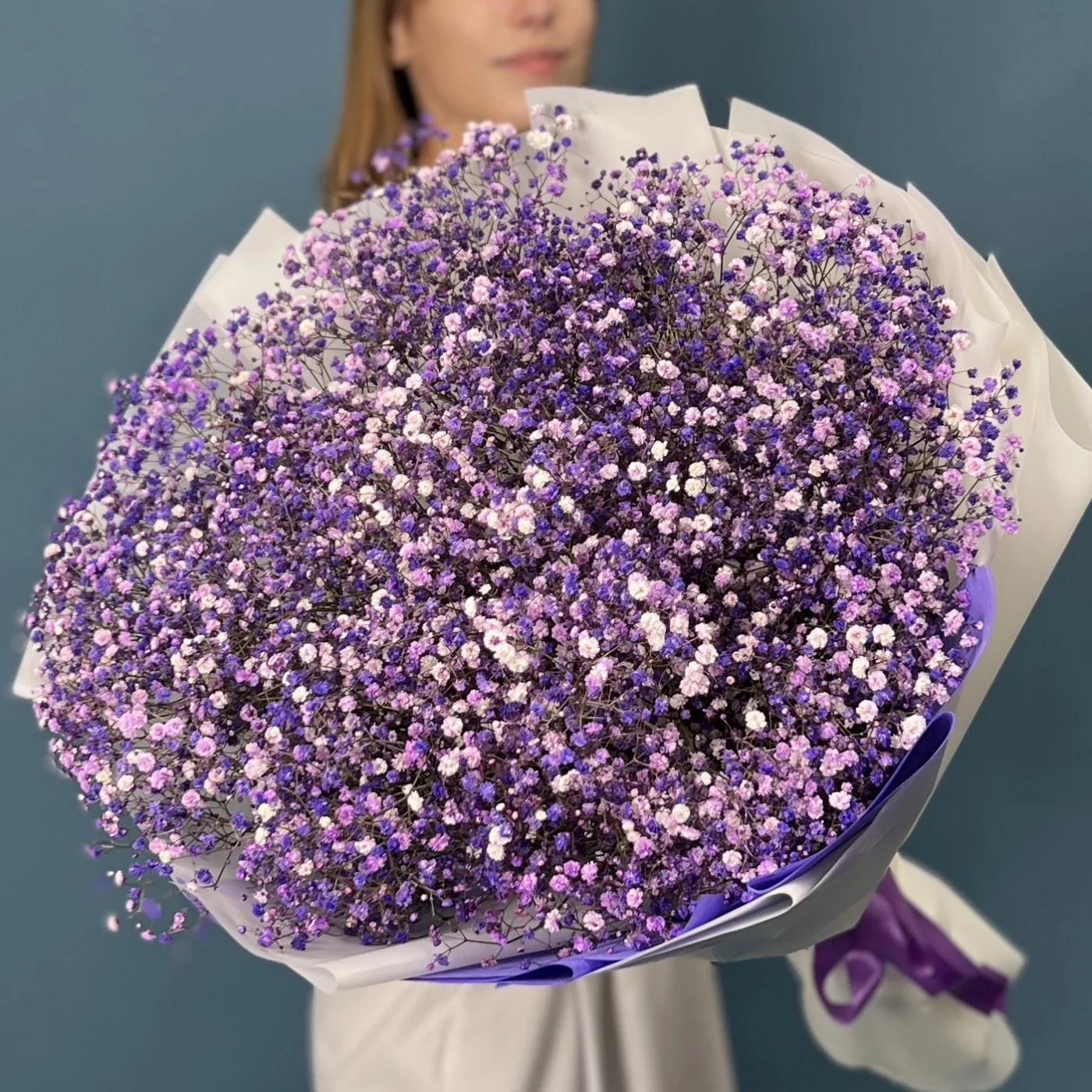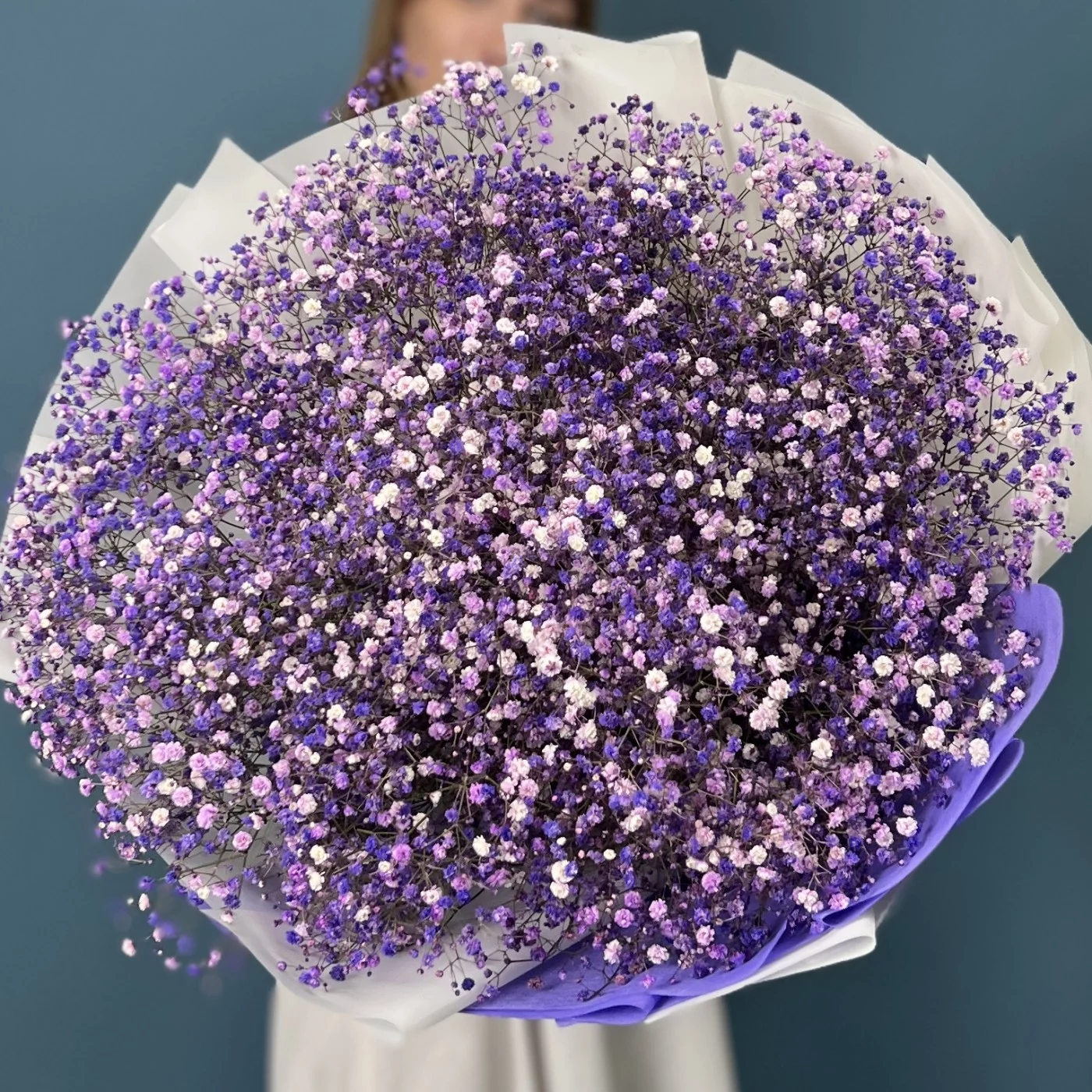 Букет из 25 фиолетовых гипсофил — это нежное и воздушное сочетание, которое придаёт композиции лёгкость и романтичность.