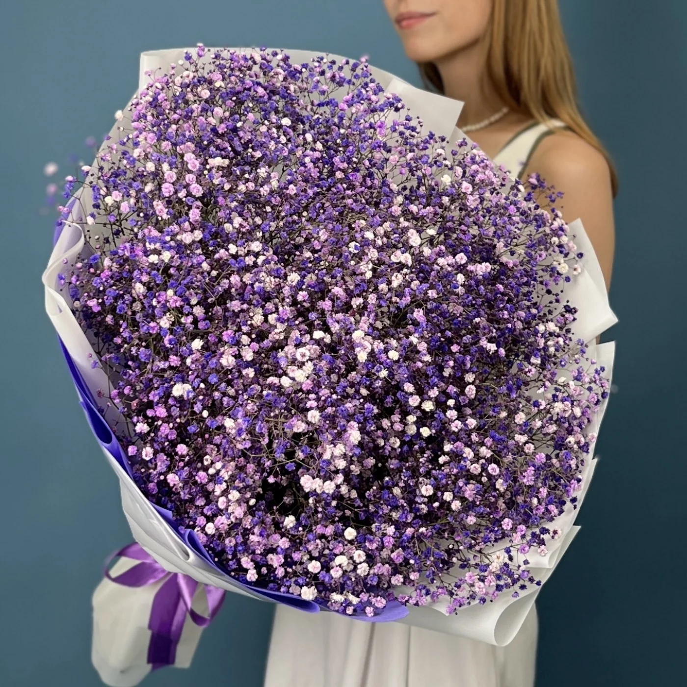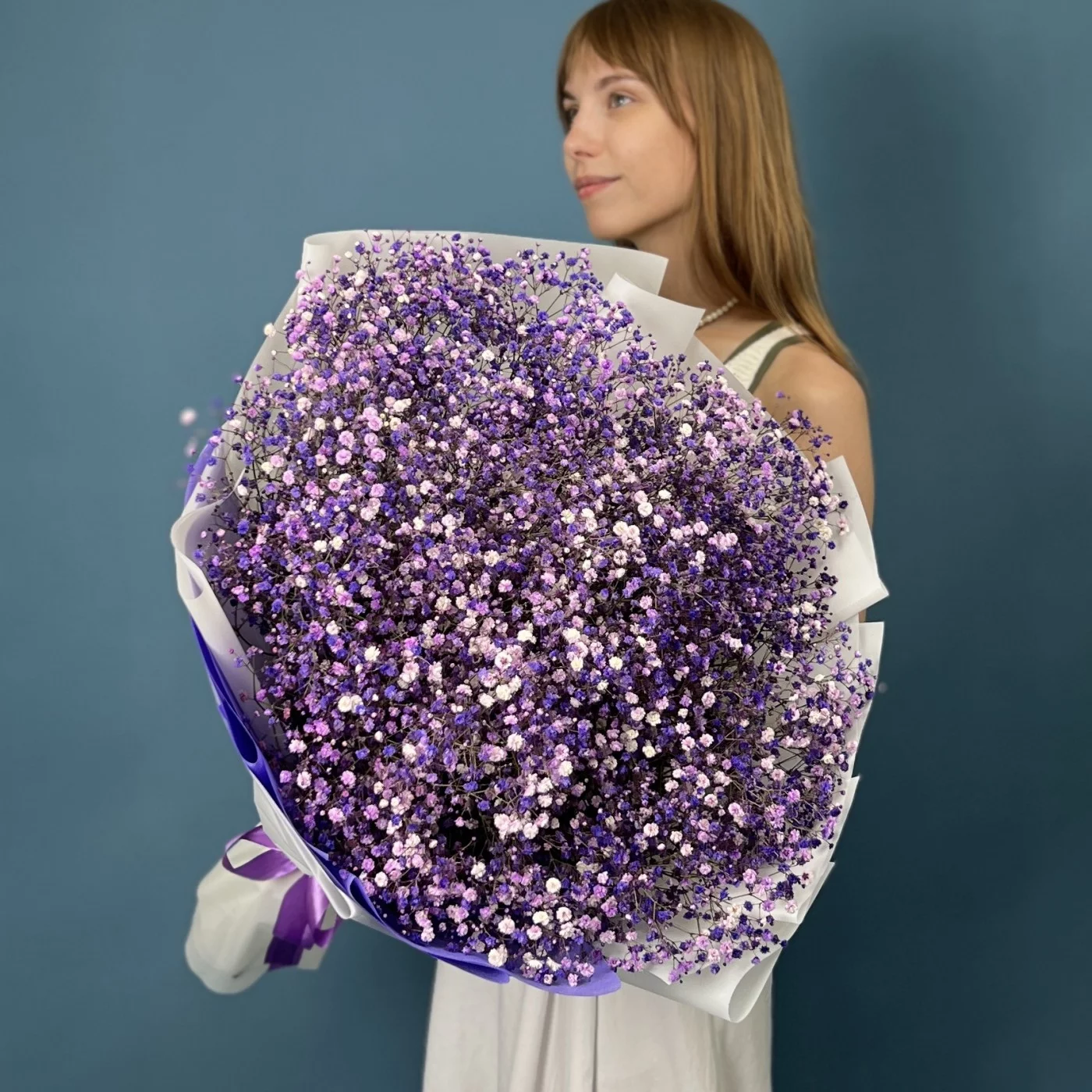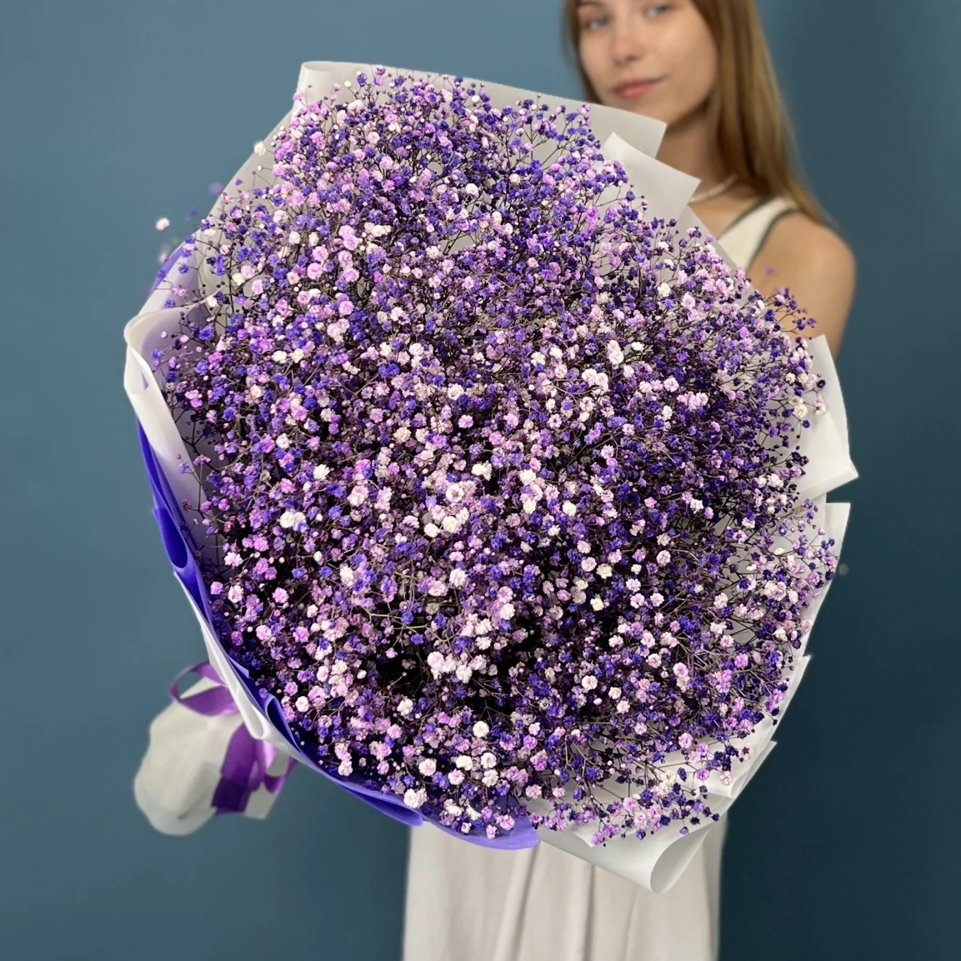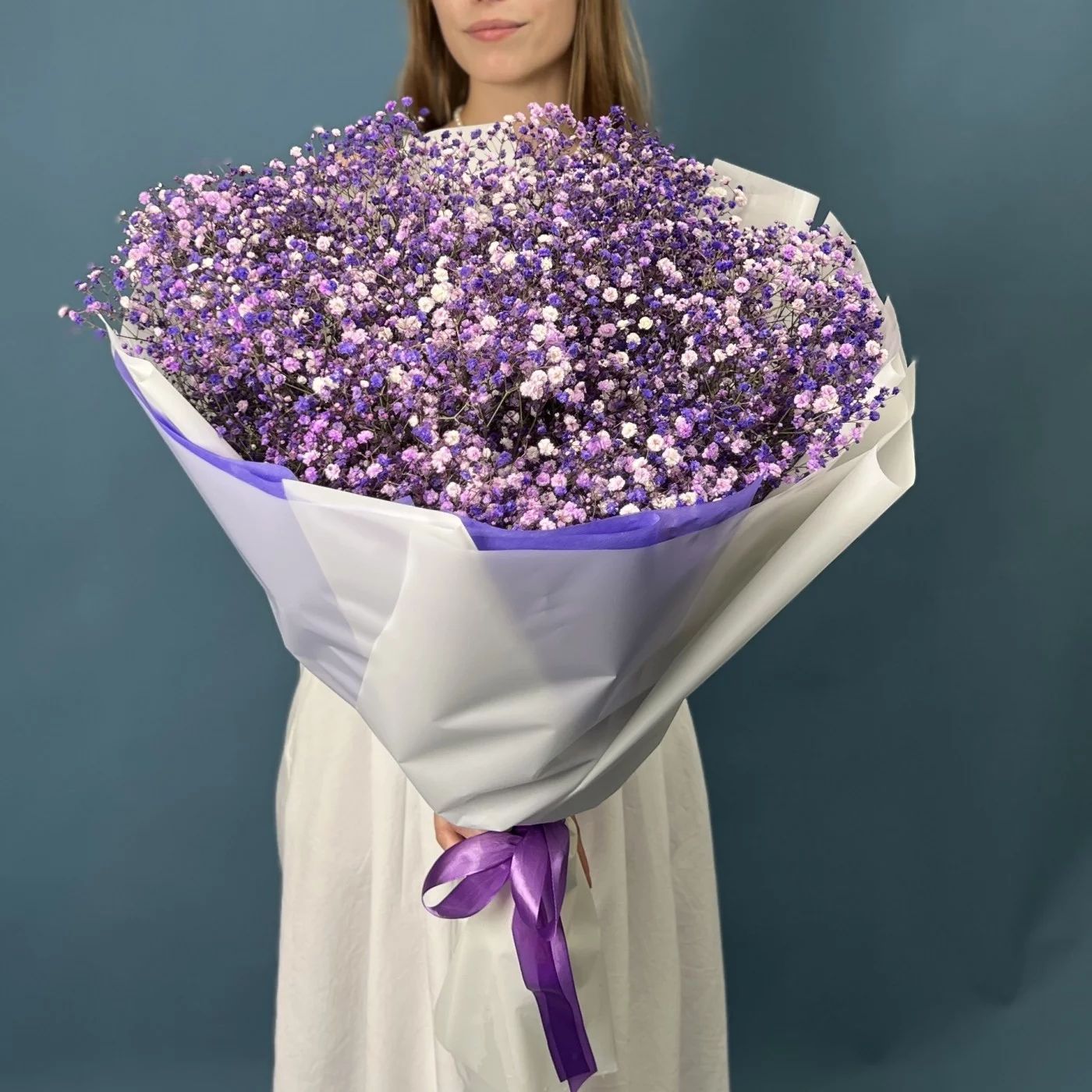 Букет из 25 фиолетовых гипсофил — это нежное и воздушное сочетание, которое придаёт композиции лёгкость и романтичность.