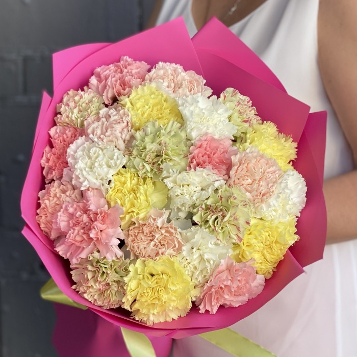 Букет из 25-ти сортовых гвоздик микс нежных и необычных оттенков. Воздушные гвоздики выглядят очень эффектно в монобукете. Такой цветовой тандем сделал этот букет по-настоящему особенным!