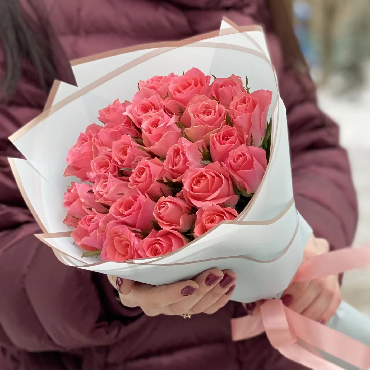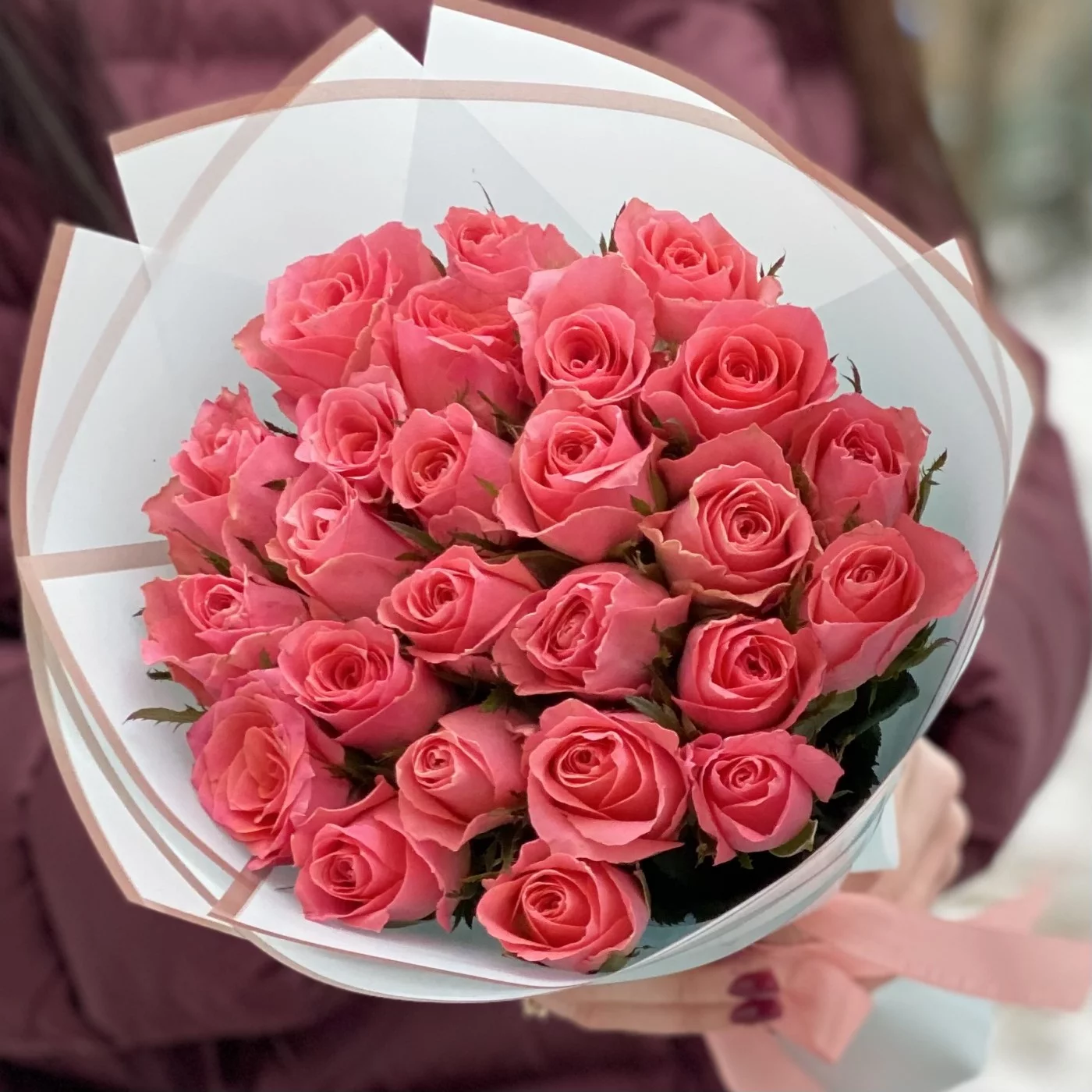 . Такой букет непременно понравится каждой женщине, будь то мама, супруга, сестра, подруга, коллега. Также букет из роз Ace-Pink подойдёт в качестве комплимента юной девушке. Приобрести его можно с круглосуточной доставкой по Москве и Московской области. Наш курьер аккуратно доставит композицию по нужному адресу. Предварительно мы сфотографируем цветы и вышлем вам фото.