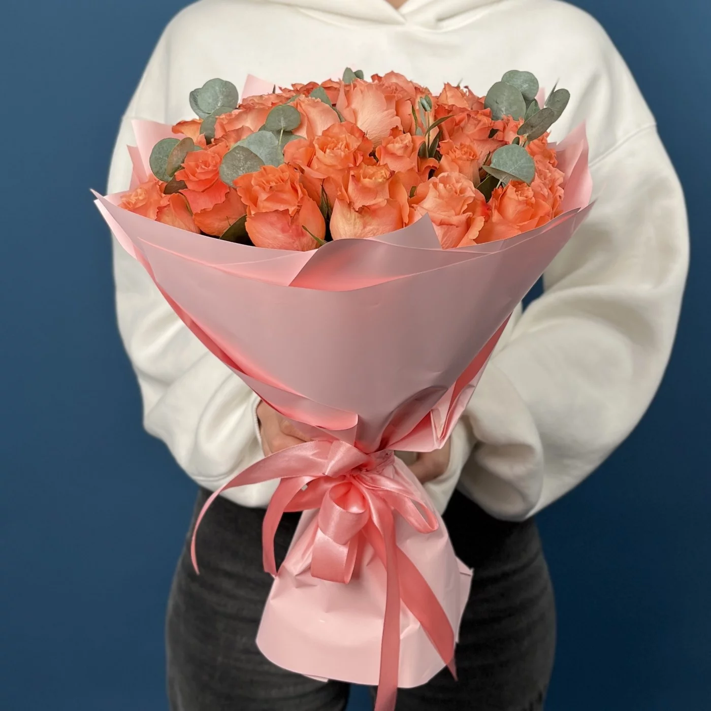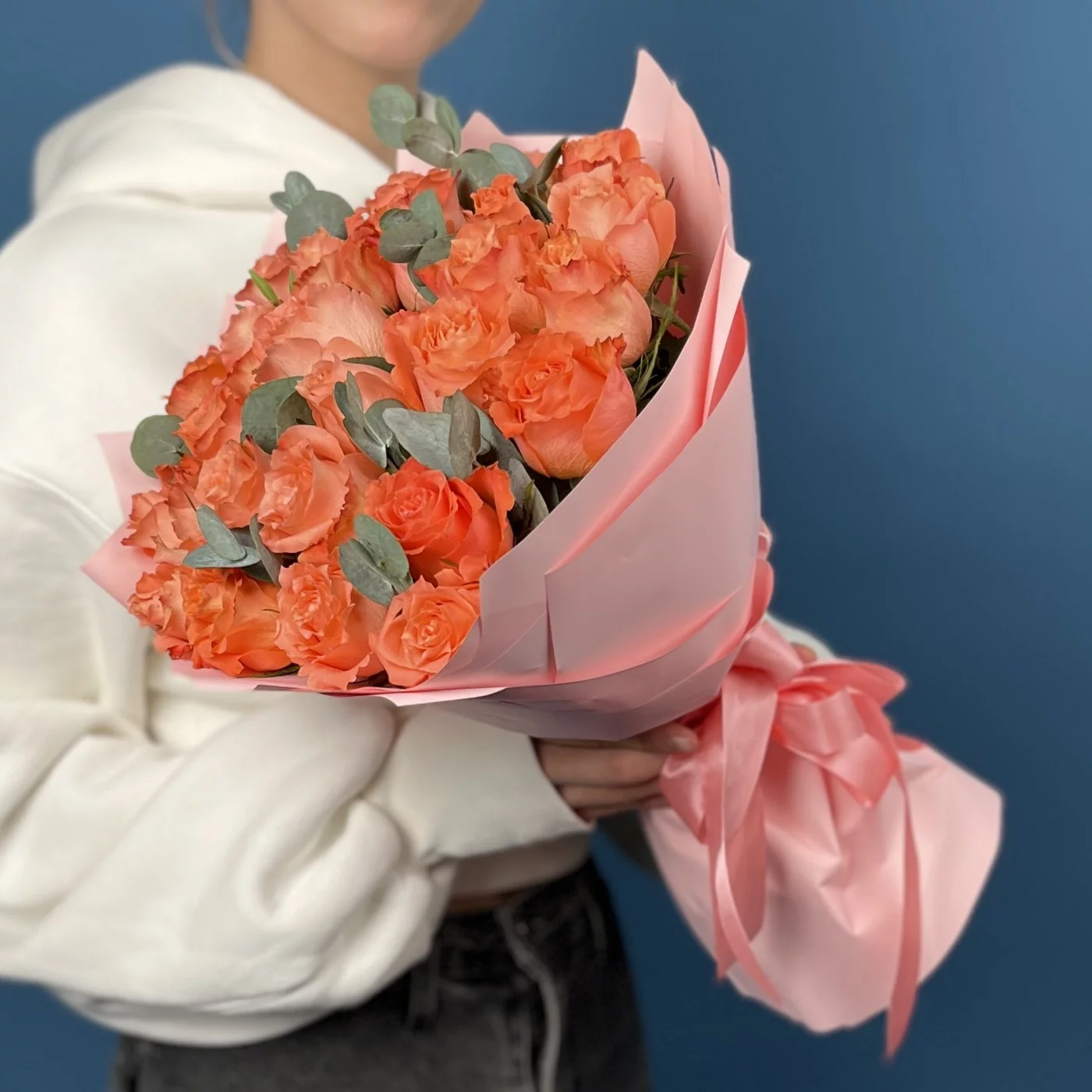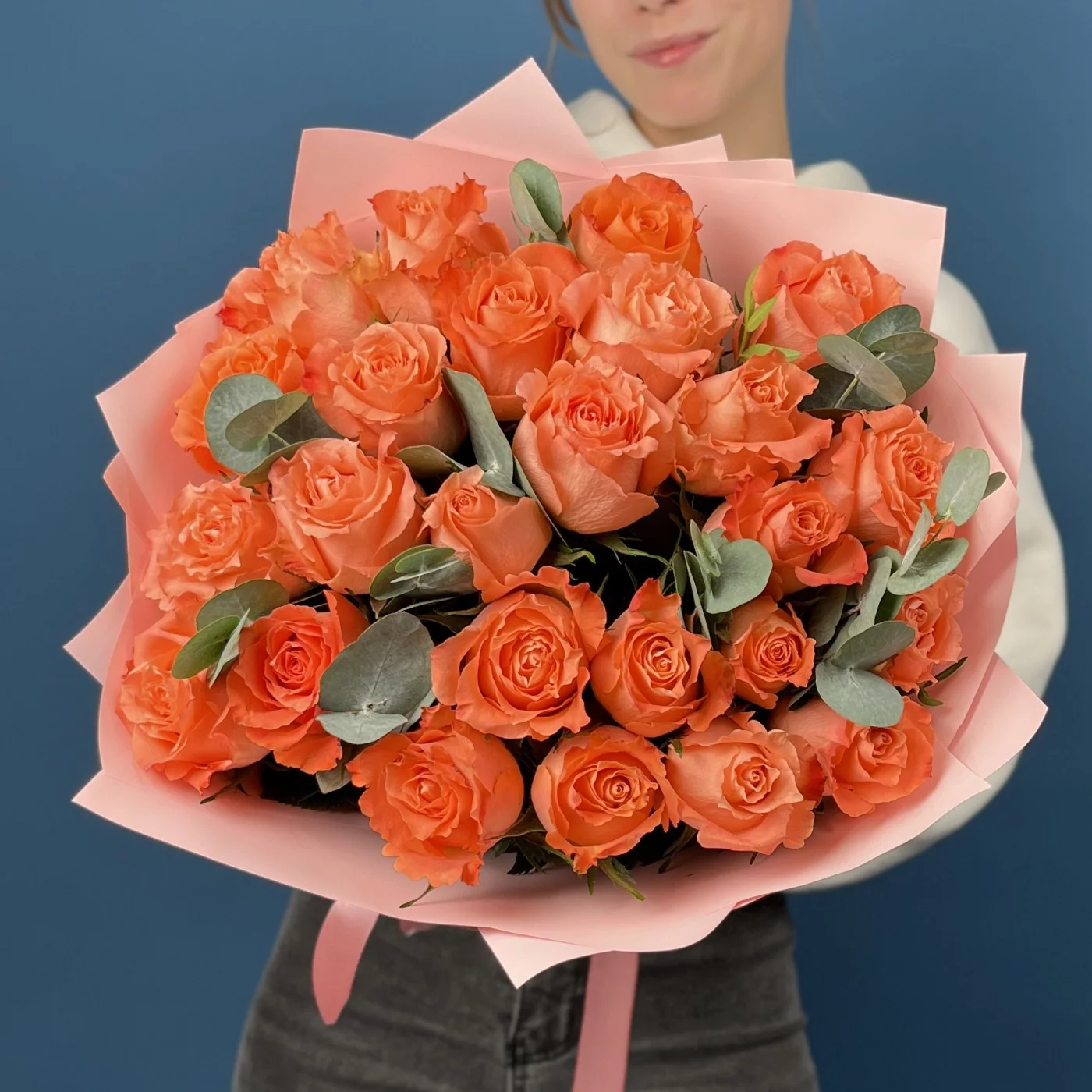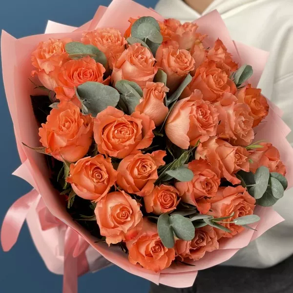 Стильная композиция из 25 коралловых роз сорта Юлечка высотой 40 см, дополненная нежными веточками эвкалипта. Эта свежая и яркая аранжировка наполнит ваш дом теплом и природной красотой. Идеально подходит для подарка или украшения интерьера в романтическом и современном стиле.