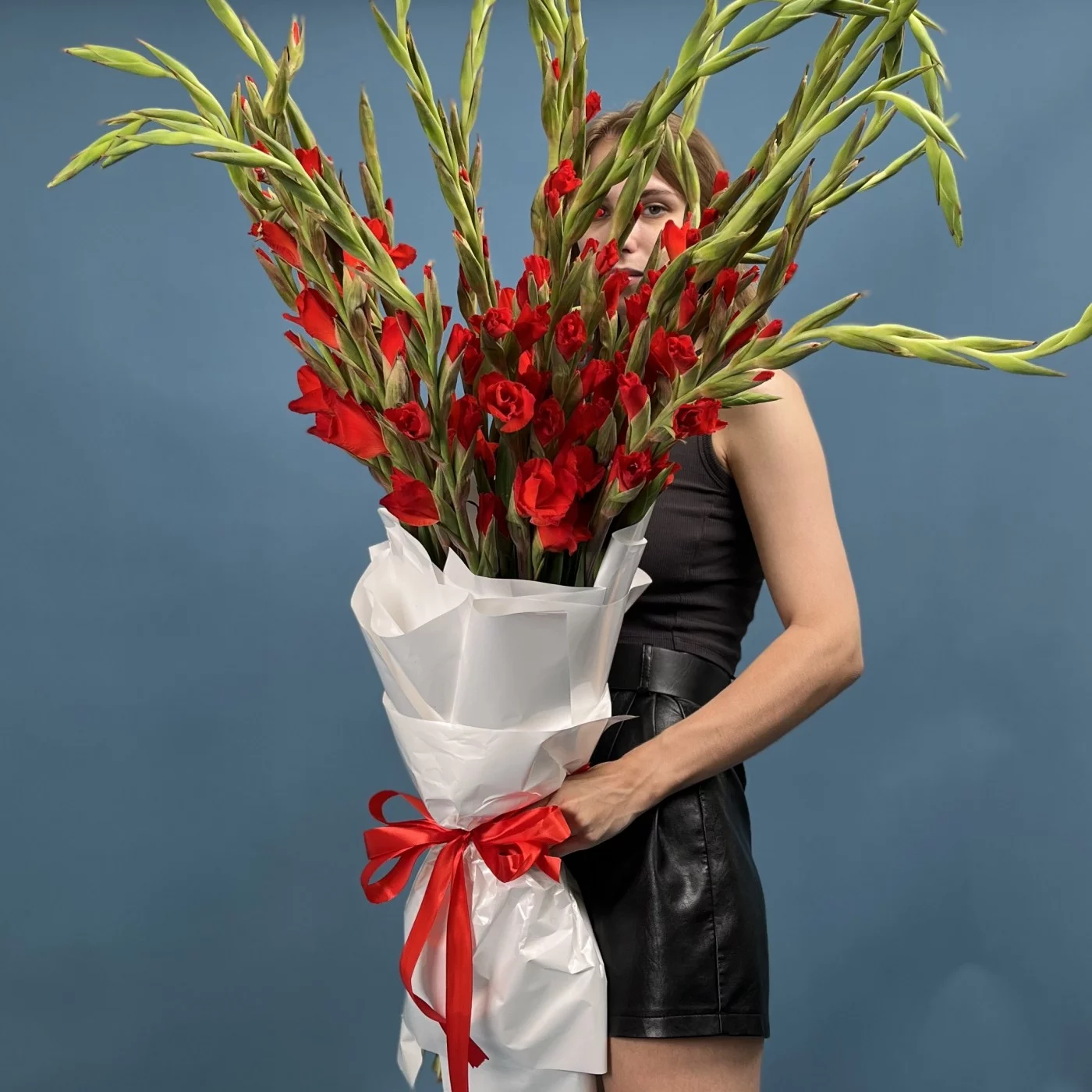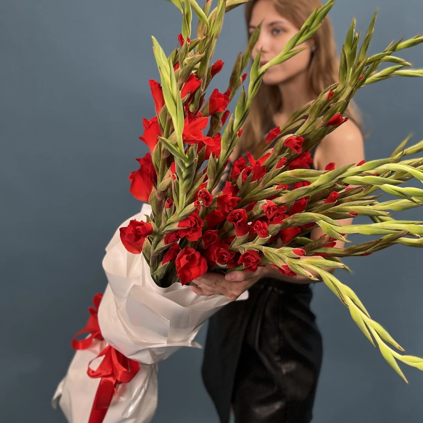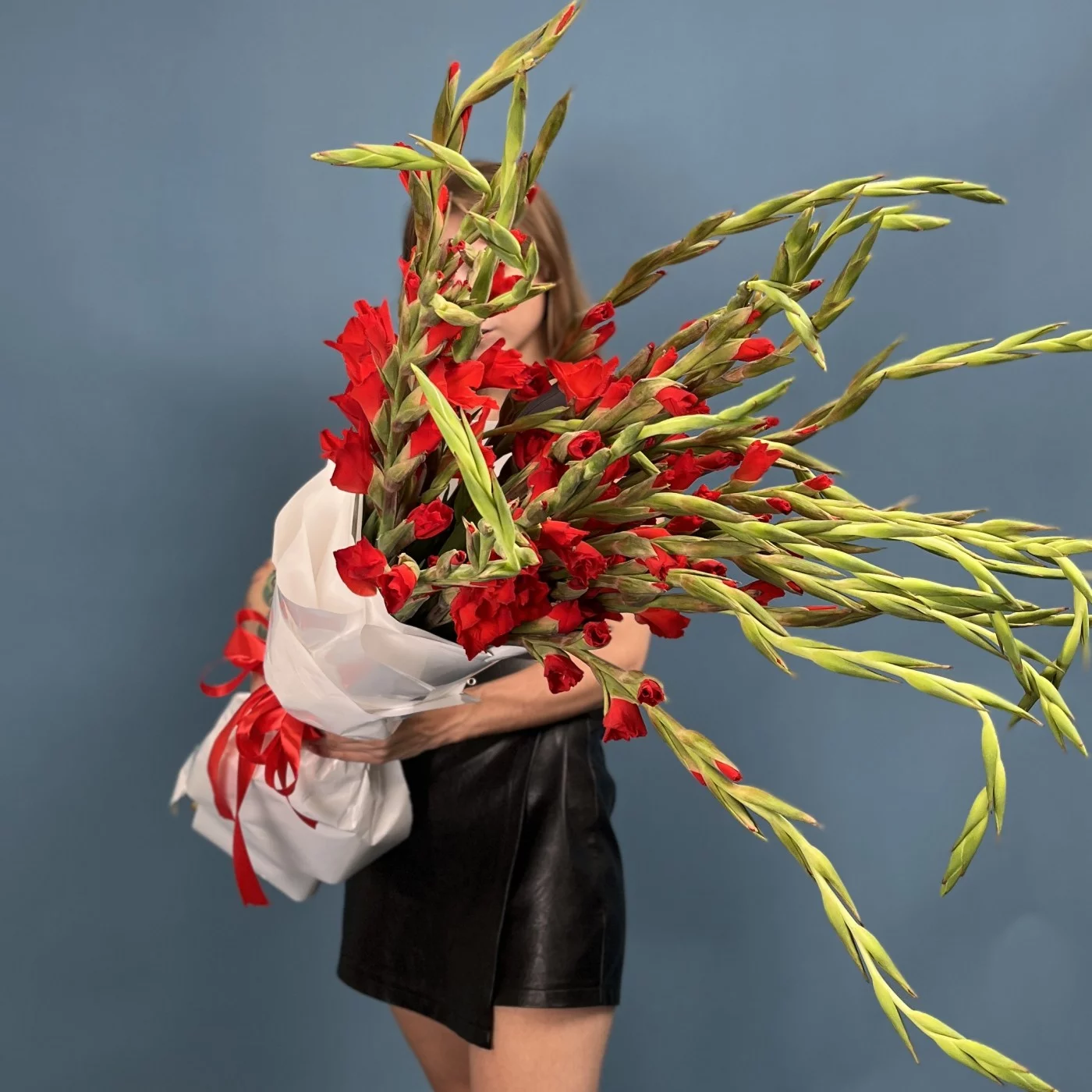 Пышный букет из 25 красных гладиолусов — это символ страсти, силы и элегантности.