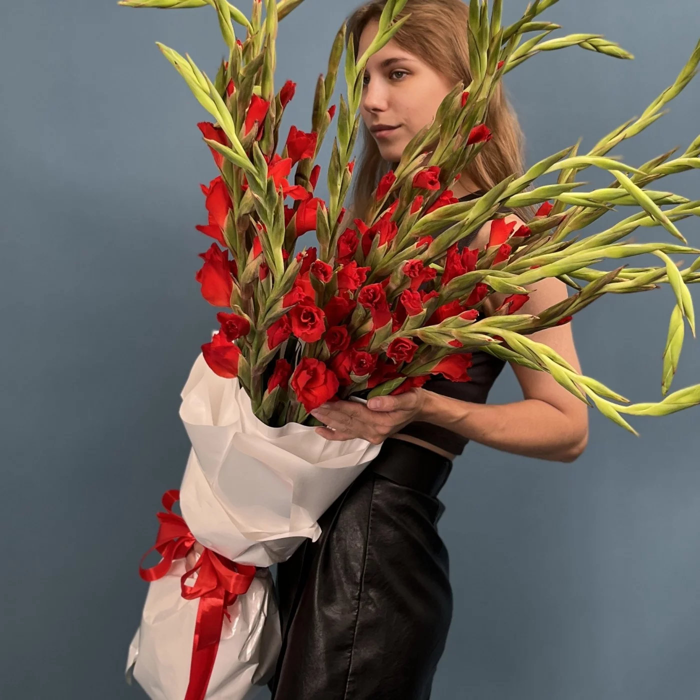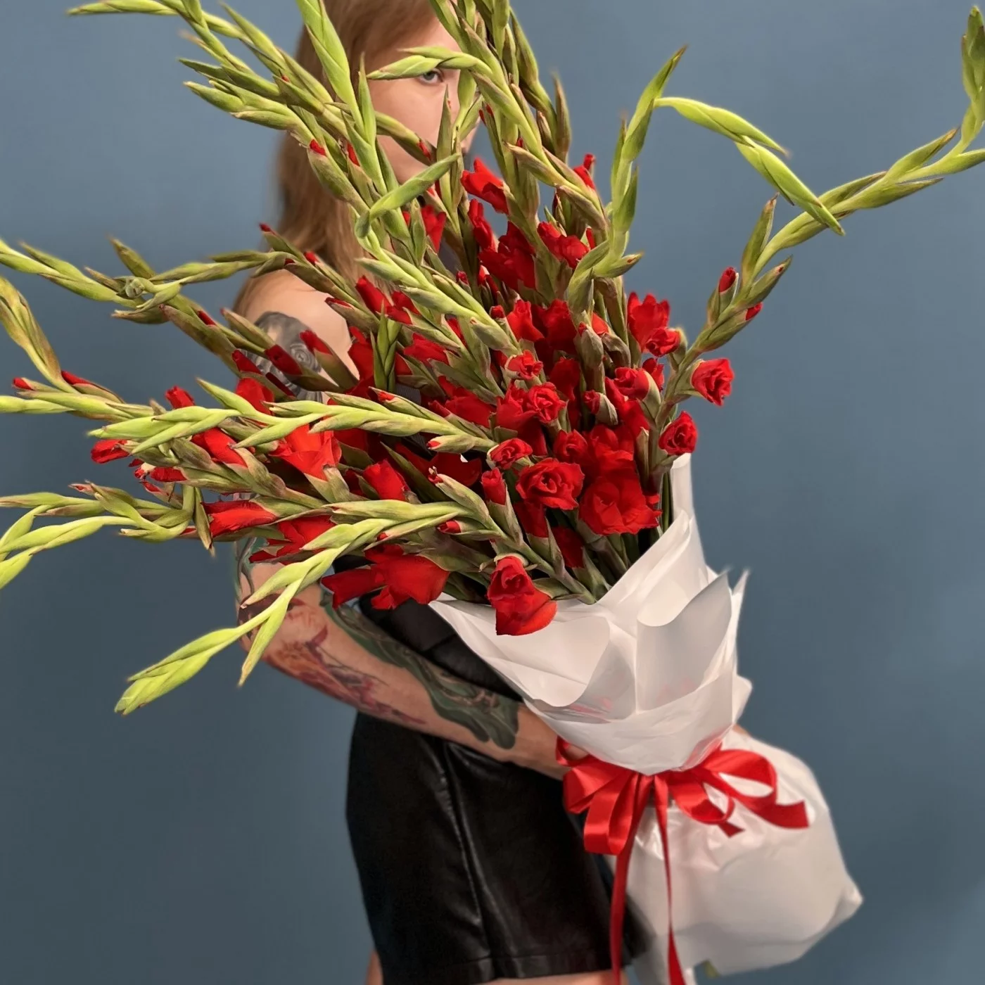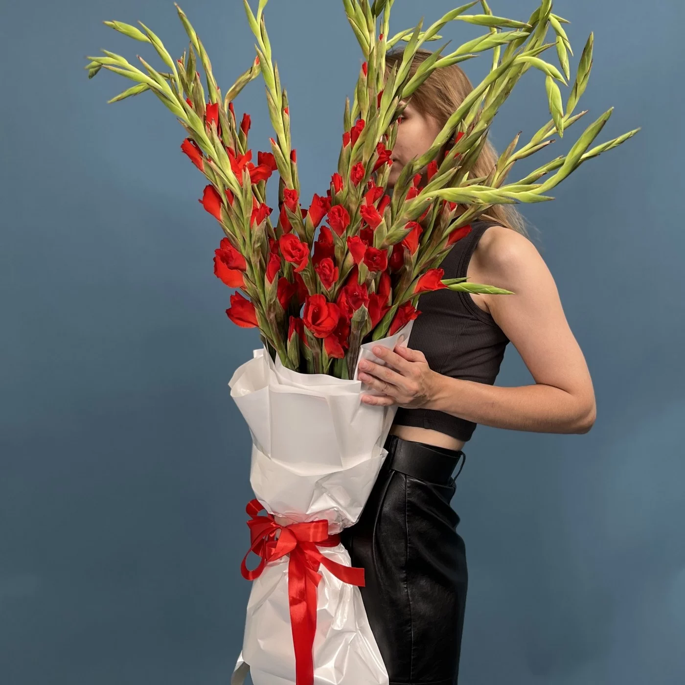 Пышный букет из 25 красных гладиолусов — это символ страсти, силы и элегантности.