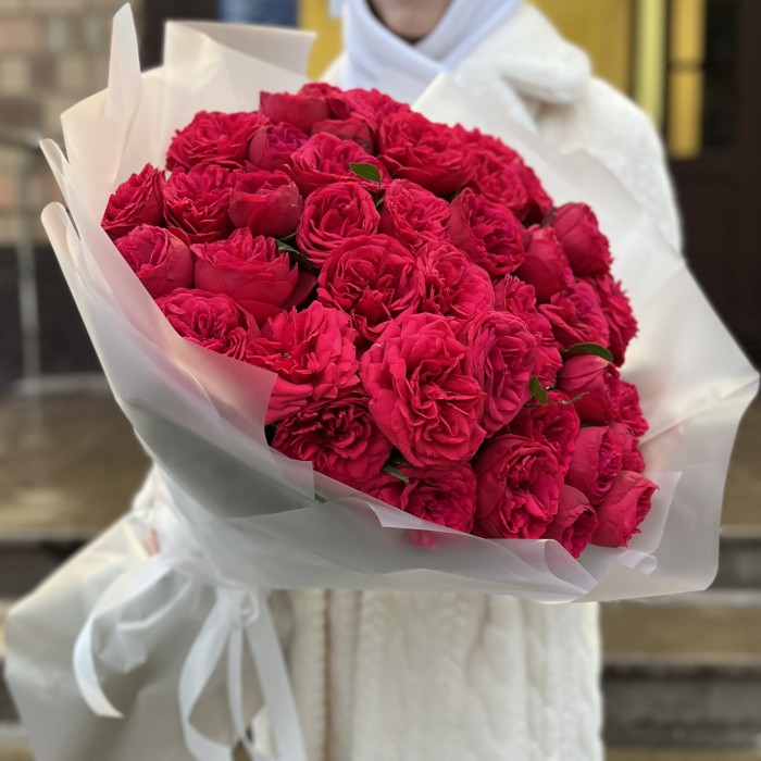 25 красных пионовидных кустовых роз Ред Пиано 70 см