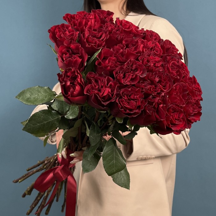 Букет из 25 красных пионовидных роз Хартс 70 см — это не только красивый подарок, но и способ создать незабываемые моменты. Пионовидные бутоны насыщено красного цвета оставят приятные впечатления от подарка