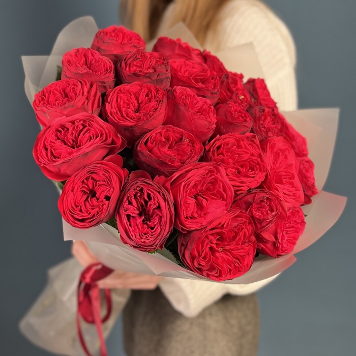 Букет из 25 красных пионовидных роз Ред Пиано длиной 60 см — это действительно впечатляющая композиция, которая способна произвести сильное впечатление. Эти розы славятся своим насыщенным цветом, крупными бутонами и нежной текстурой, что делает их идеальными для любого важного события.