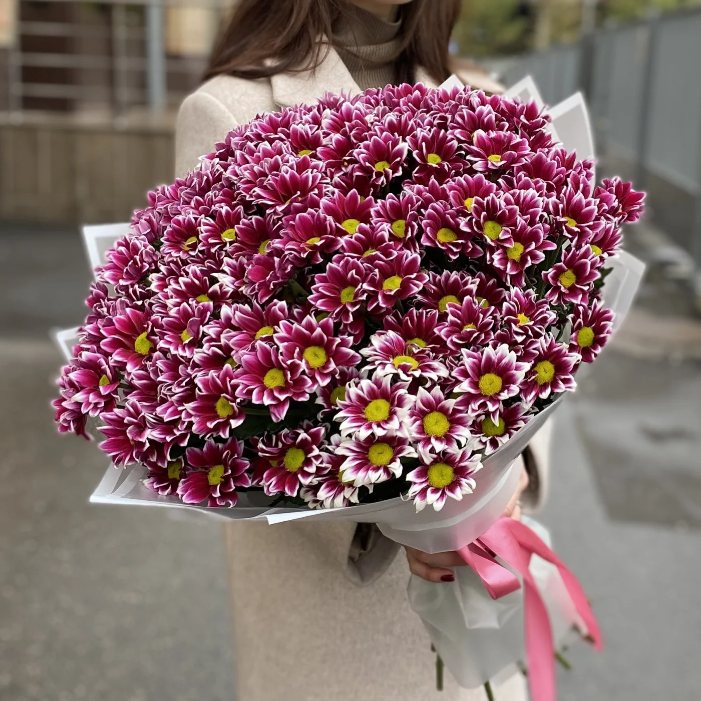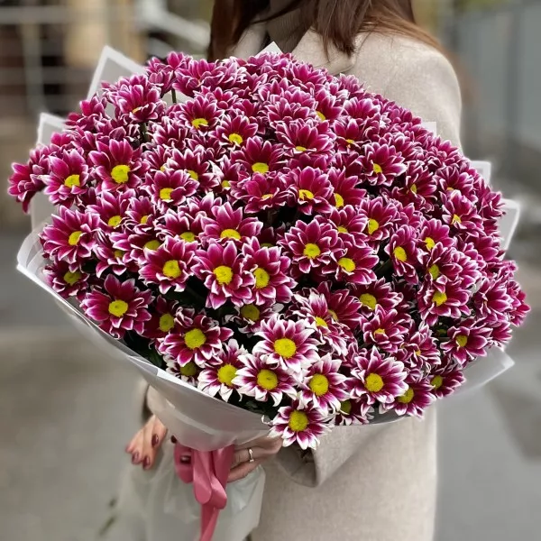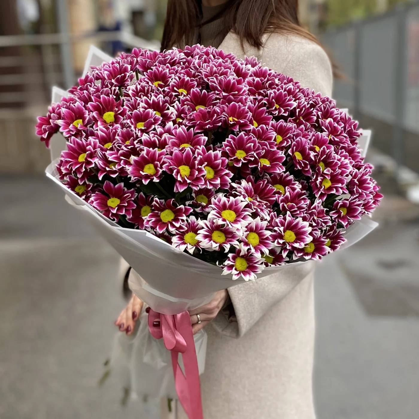 Букет из 25 кустовых хризантем сорта Хайдар Пинк — это элегантное и стильное решение для любого повода.