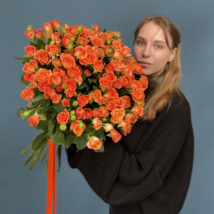 Букет из 25 кустовых оранжевых роз сорта Чарминг Бейби высотой 50 см — это роскошная и выразительная композиция, которая привлекает внимание своей яркостью и насыщенностью.