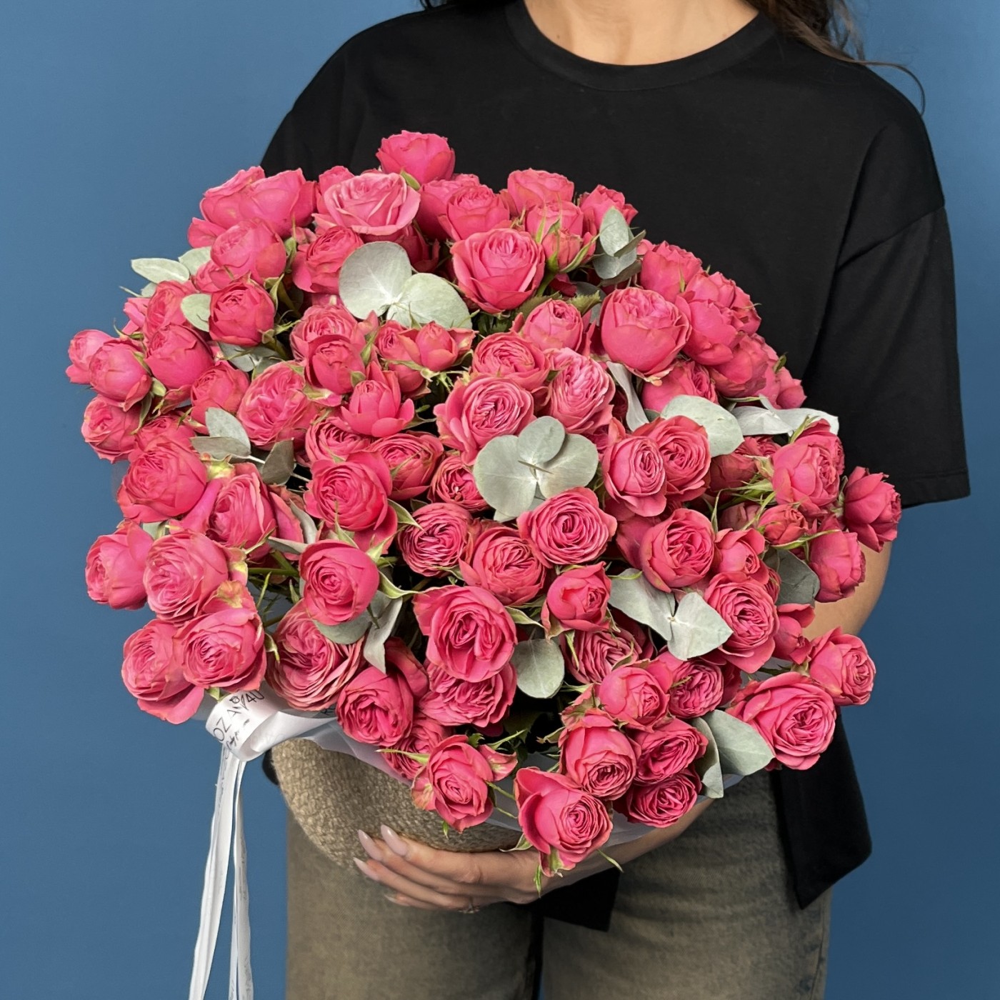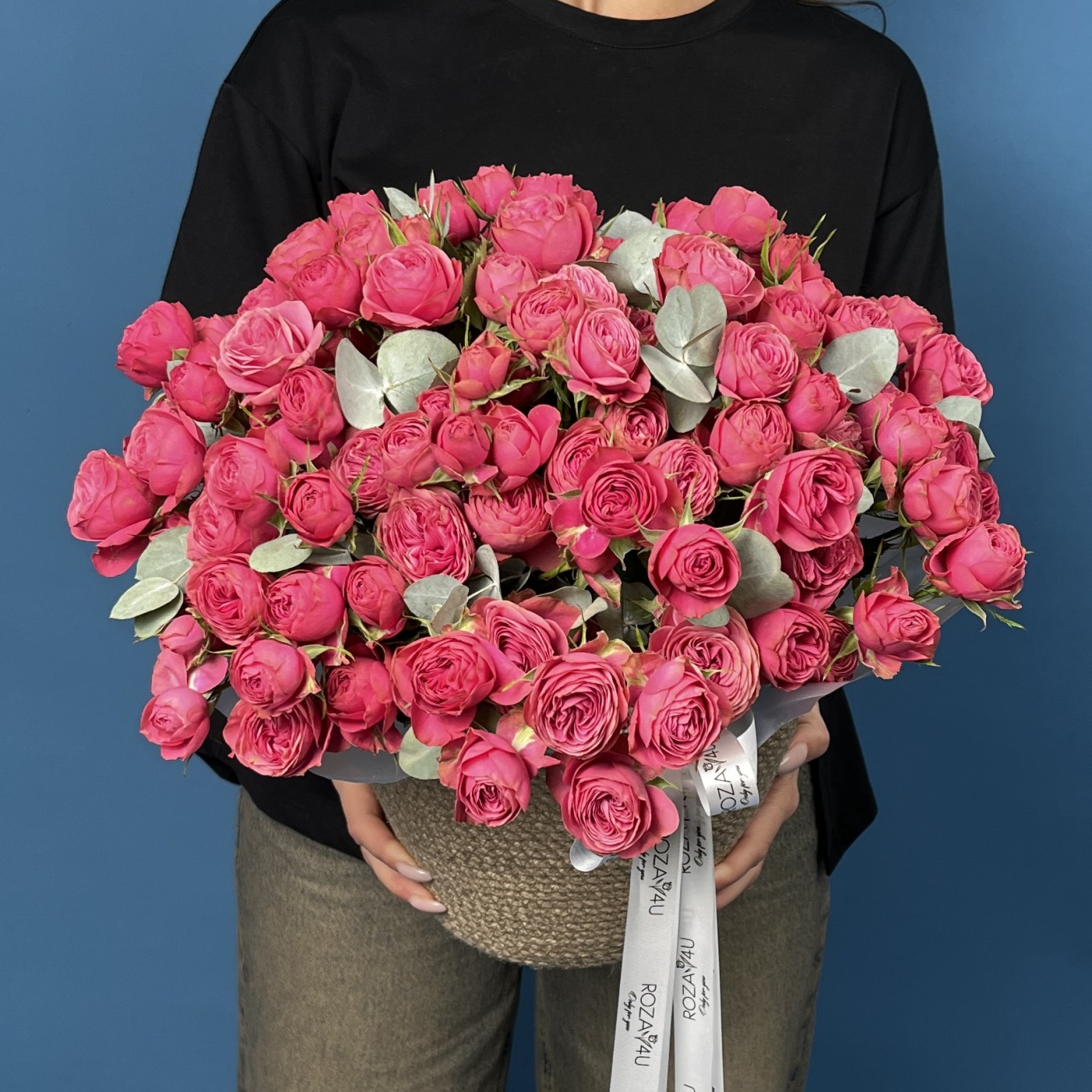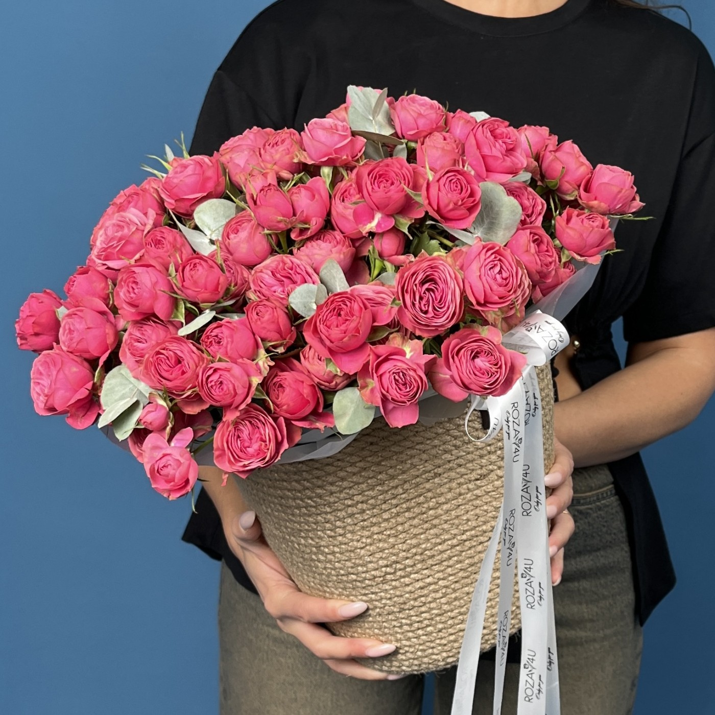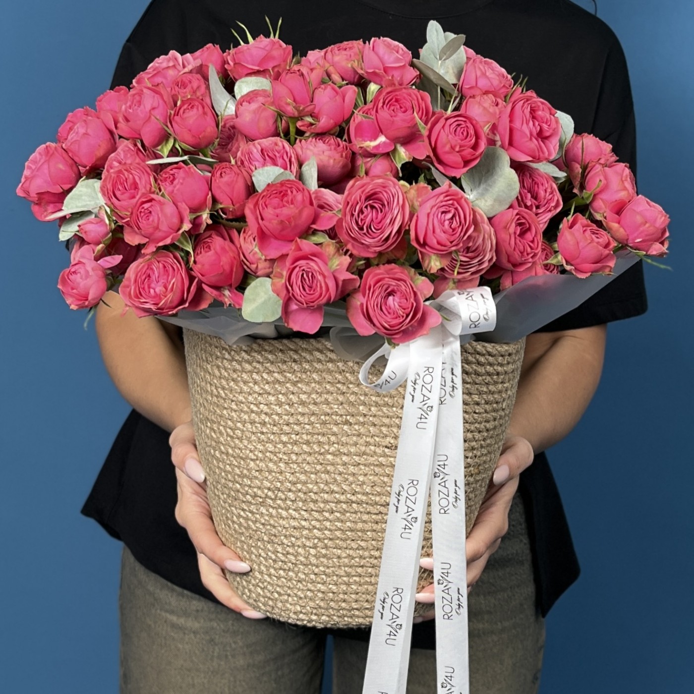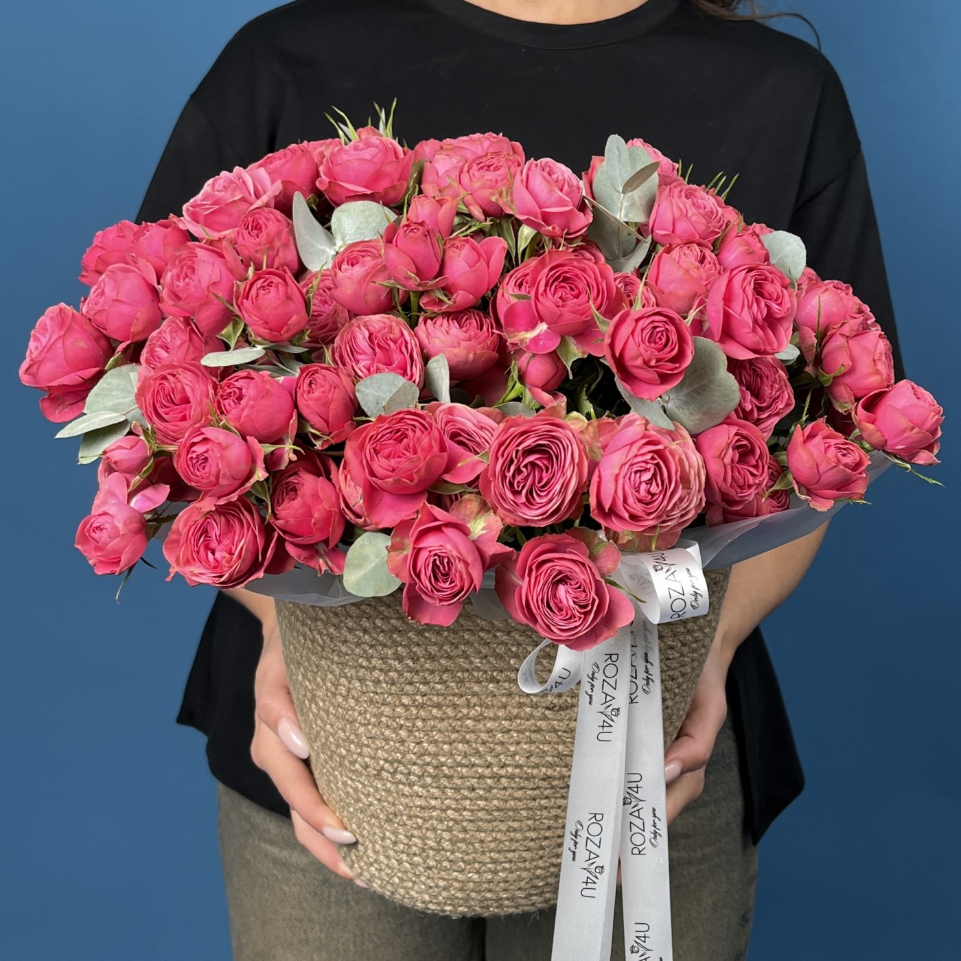 Красивое оформление из 25 кустовых пионовидных малиновых роз Гранд Трендсеттер, аккуратно расположенных в стильном кашпо. Яркие насыщенные оттенки и пышная форма роз создают изысканную и объемную композицию, идеально подходящую для украшения интерьера или приятного подарка. Такая аранжировка подчеркнет торжественность момента и принесет радость своим насыщенным цветом и элегантностью.