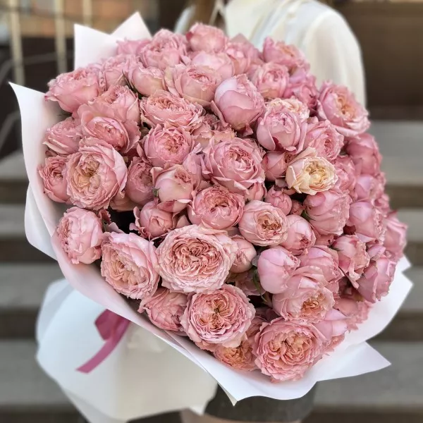 Букет из 25 кустовых пионовидных персиковых роз Джульетта — это великолепный способ выразить свои чувства и создать атмосферу праздника.