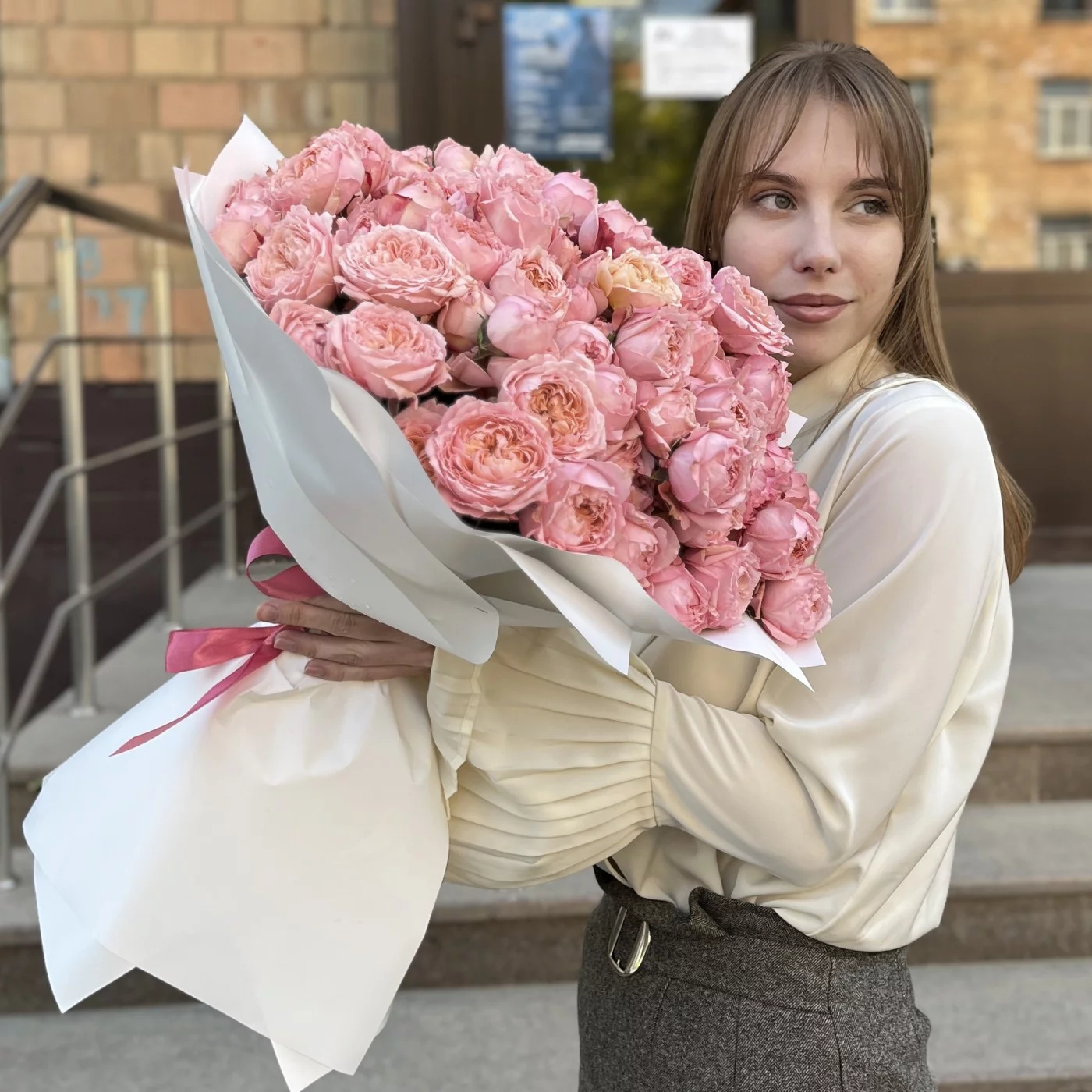 Букет из 25 кустовых пионовидных персиковых роз Джульетта длиной 50 см — это великолепное и элегантное решение для любого торжества или особого случая.