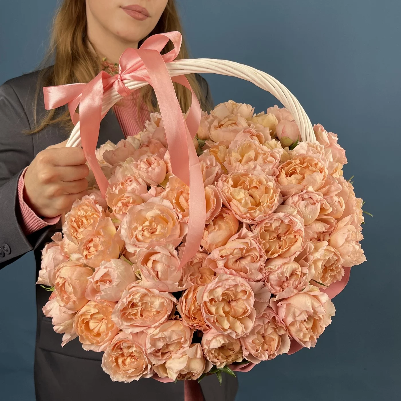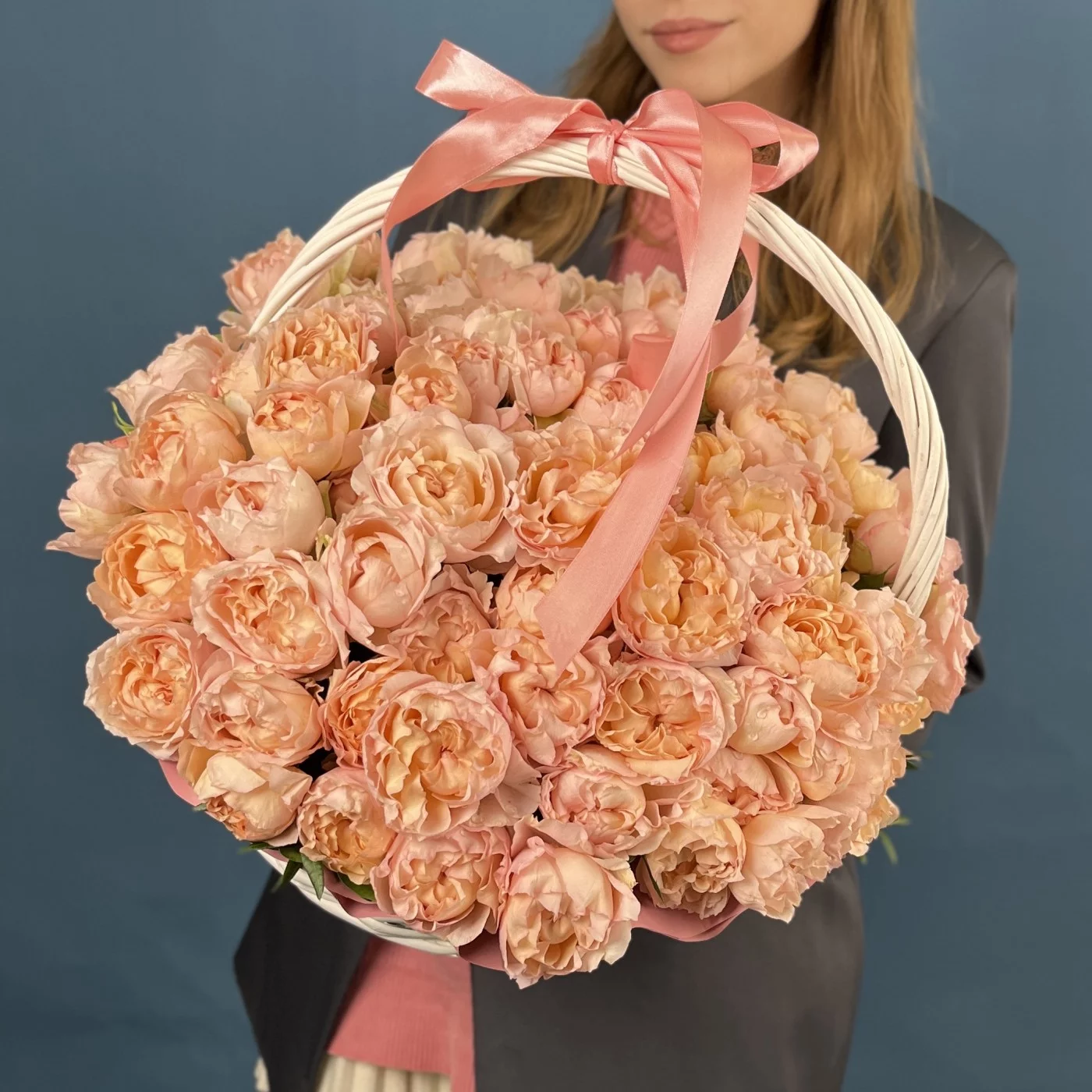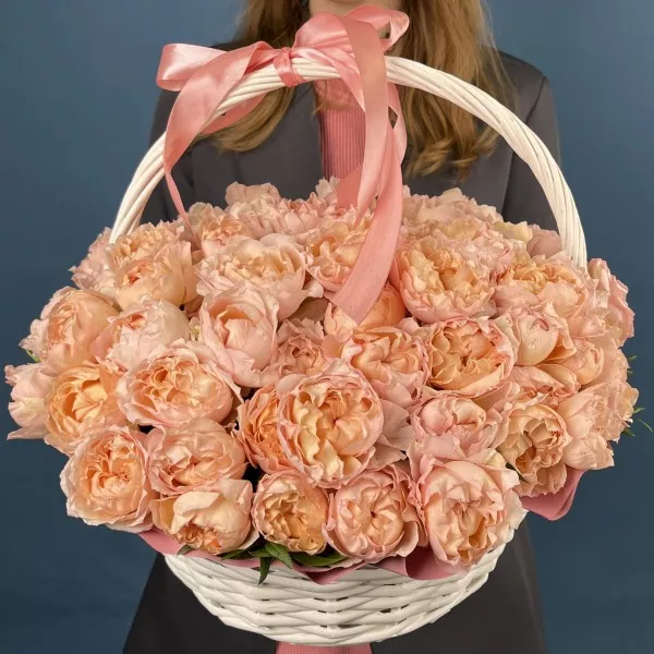 25 кустовых пионовидных роз Джульетта Хани в корзине
