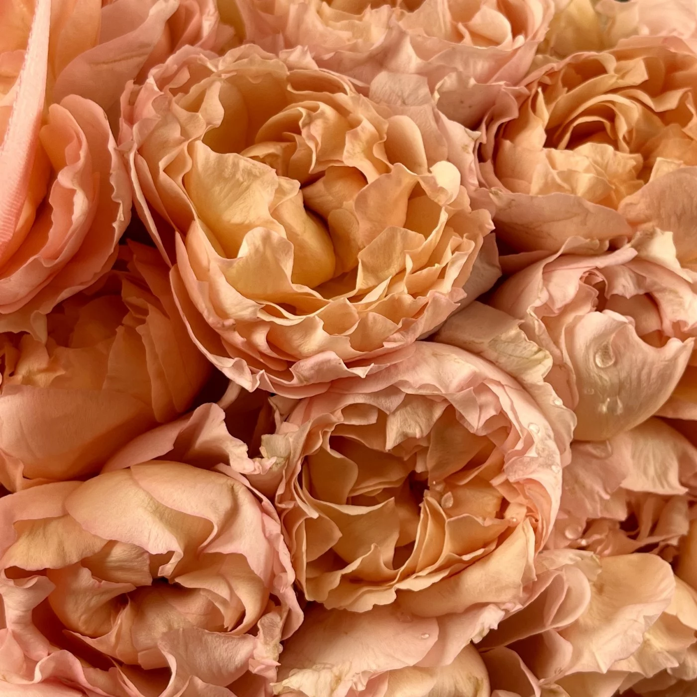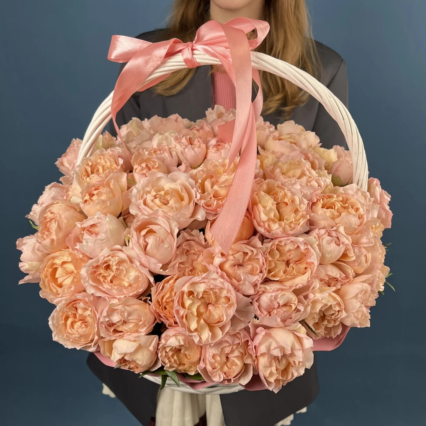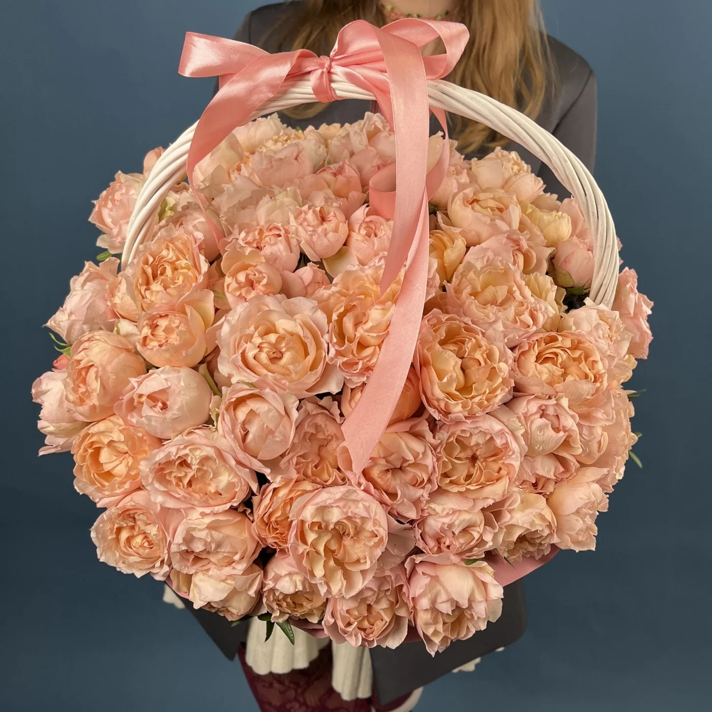 25 кустовых пионовидных роз Джульетта Хани в корзине