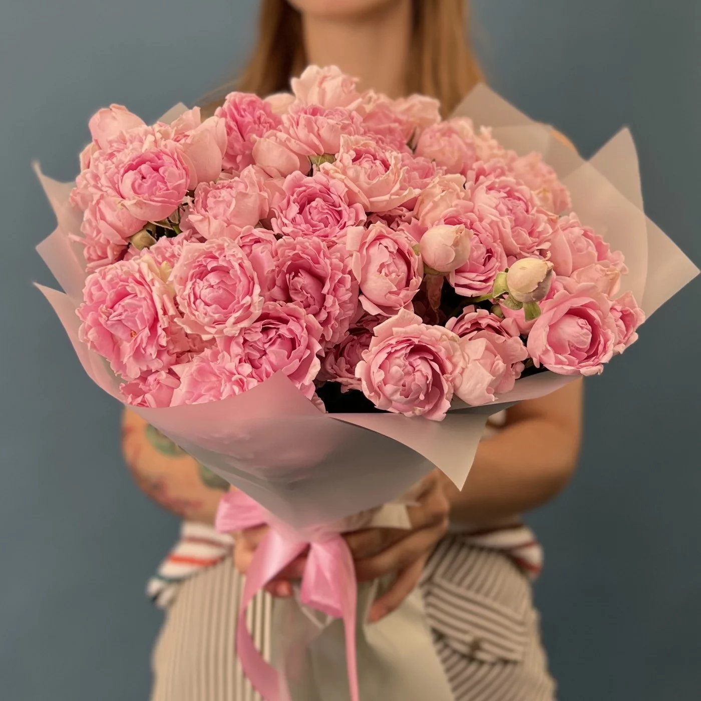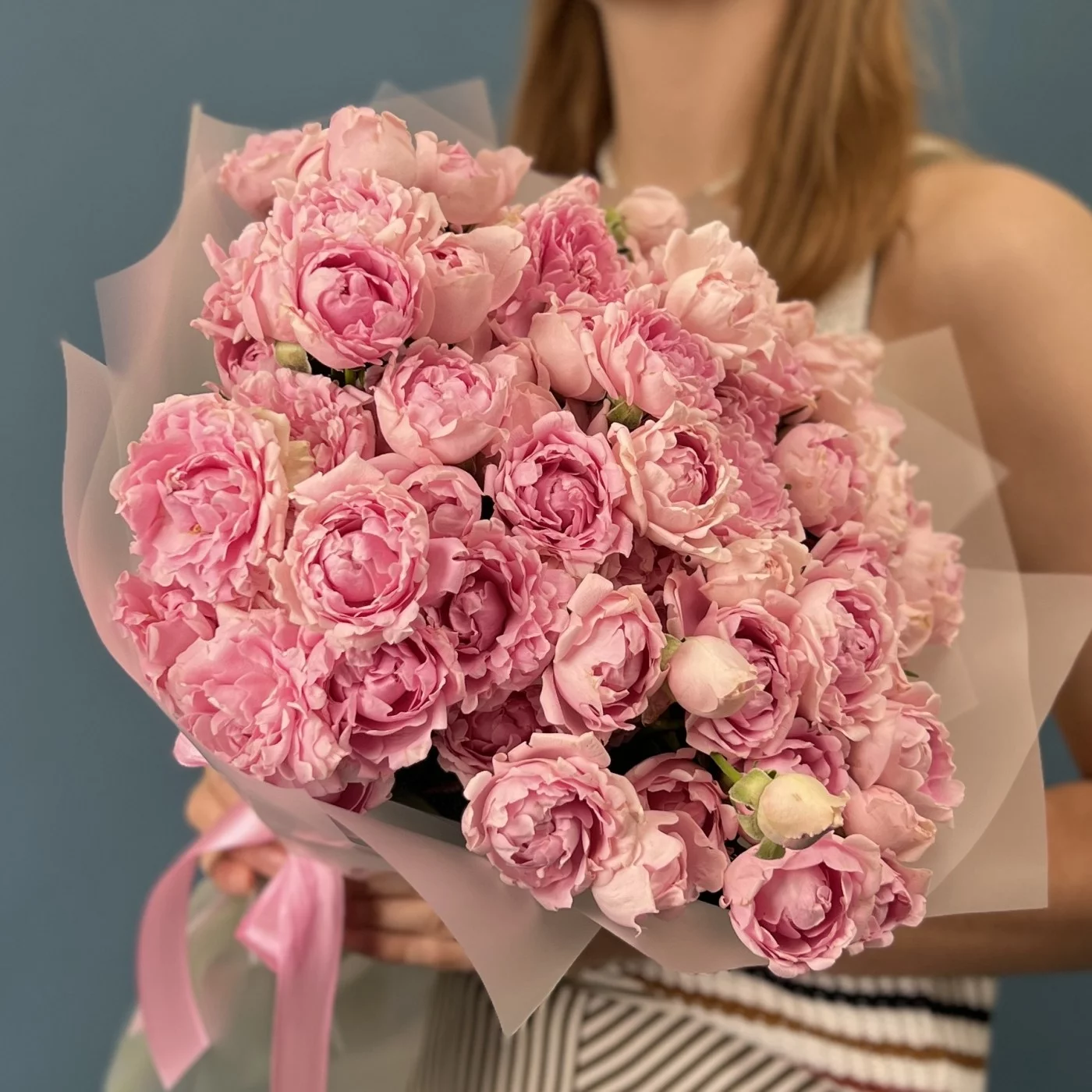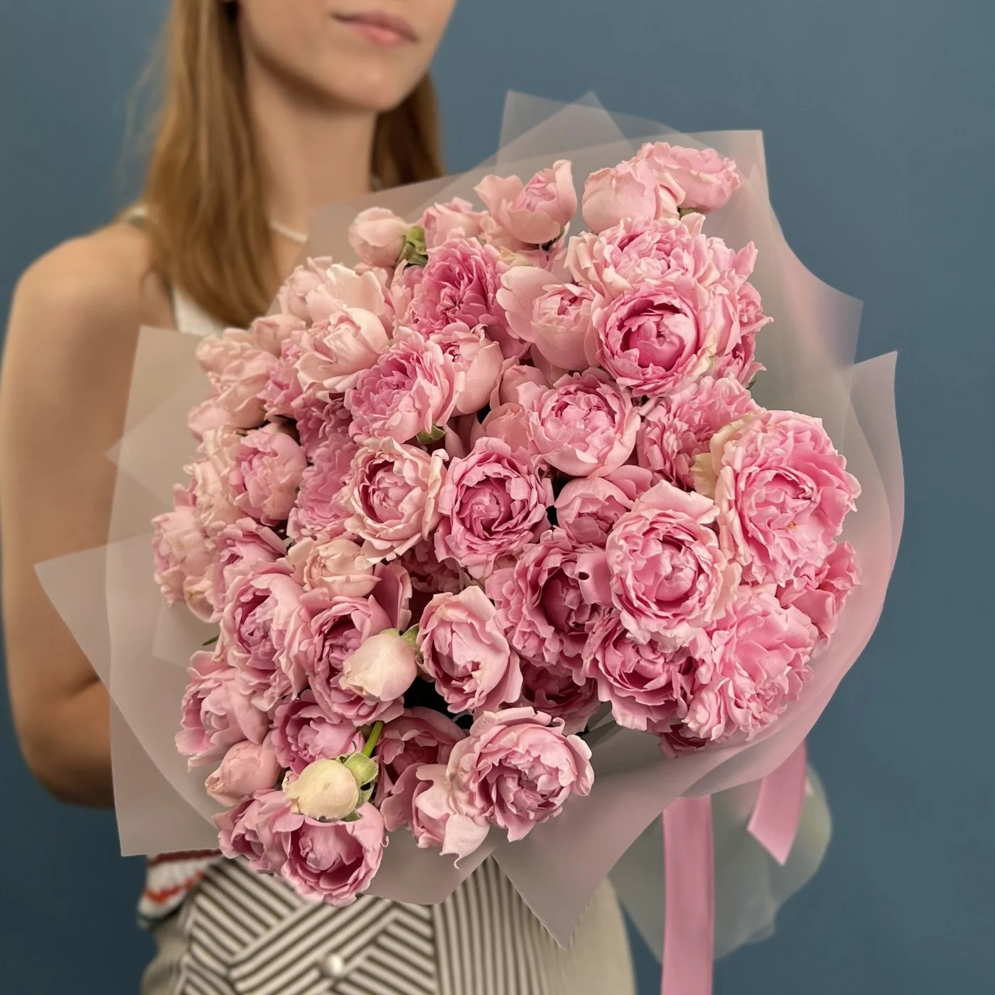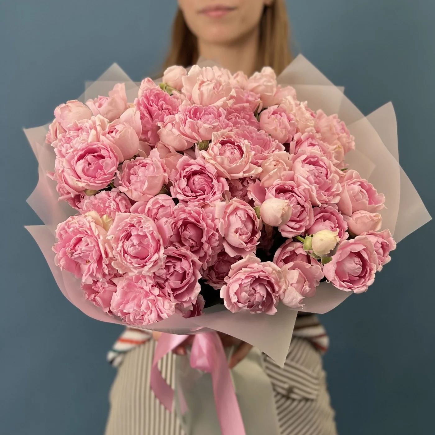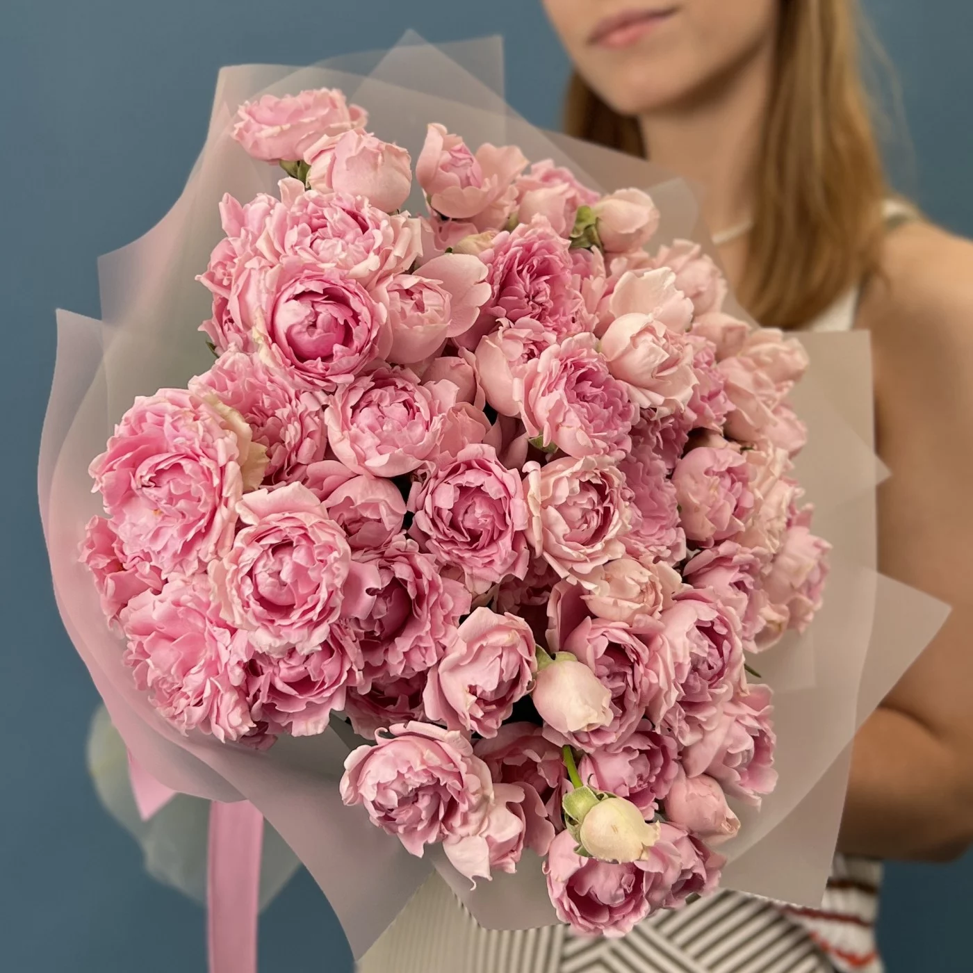 Букет из 25 кустовых пионовидных роз сорта Кэнди Флоу в изысканном сиреневом оттенке длиной 40 см — это поистине впечатляющее воплощение элегантности и утончённой красоты. Обильные пышные пионовидные бутоны с бархатистыми лепестками раскрываются в воздушные, объемные цветы, наполняя композицию насыщенным сиреневым сиянием и изысканной гармонией.