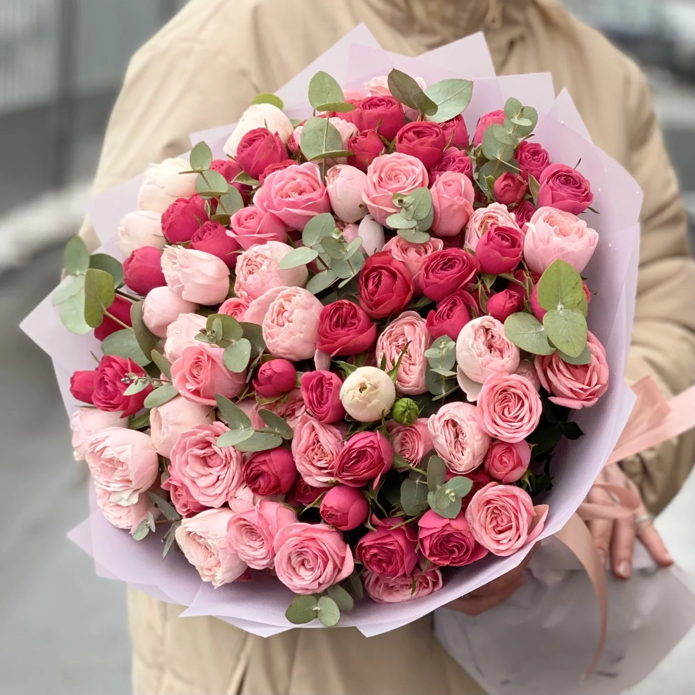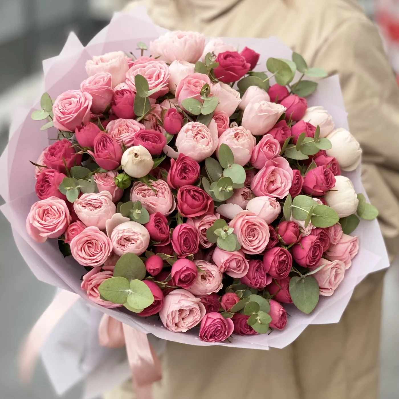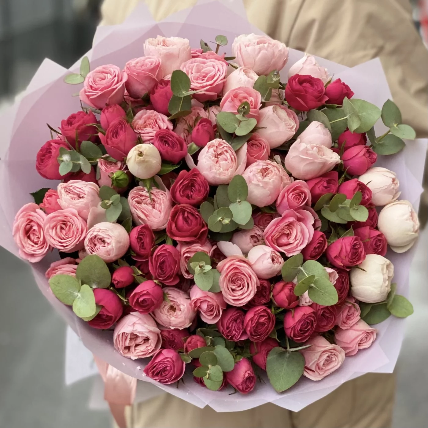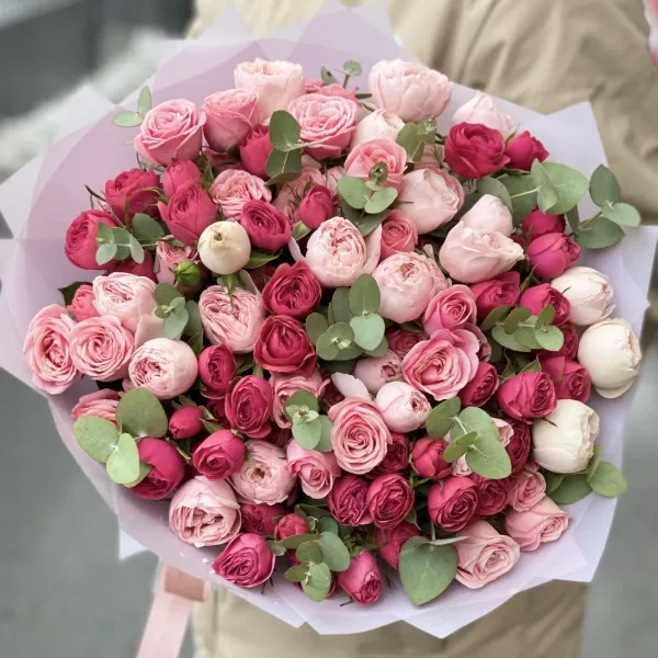 Нежные и вдохновляющие пионовидные кустовые розы с эвкалиптом. Популярные сорта в сочетании друг с другом выглядят как выверено подобранный художником натюрморт.