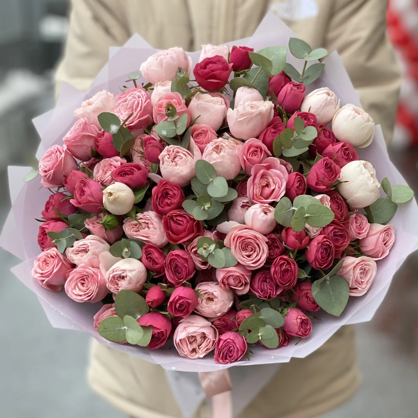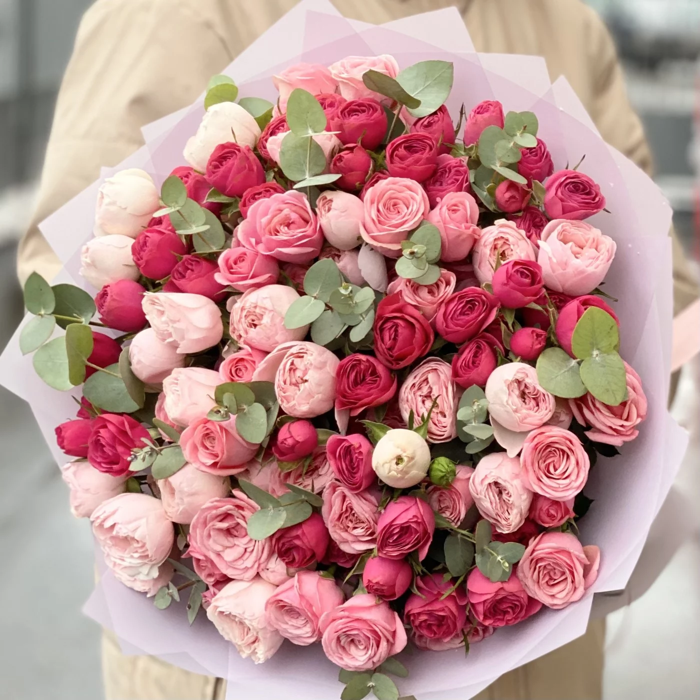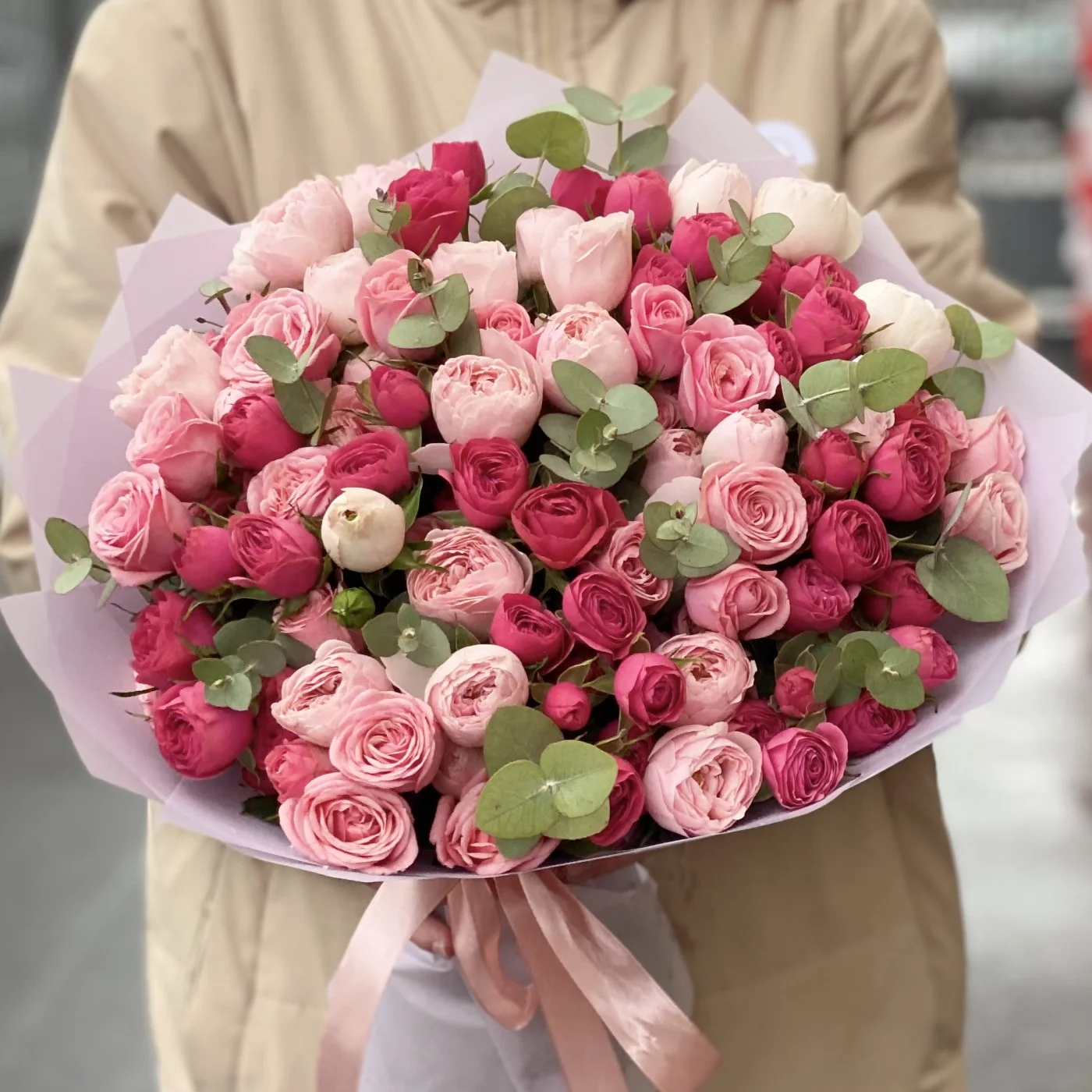 Нежные и вдохновляющие пионовидные кустовые розы с эвкалиптом. Популярные сорта в сочетании друг с другом выглядят как выверено подобранный художником натюрморт.