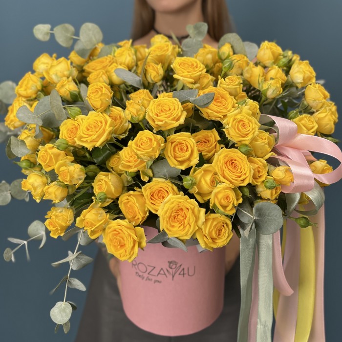 25 кустовых роз Еллоу Бейби в коробке — это яркий и эффектный букет, наполненный солнечным настроением и теплом.