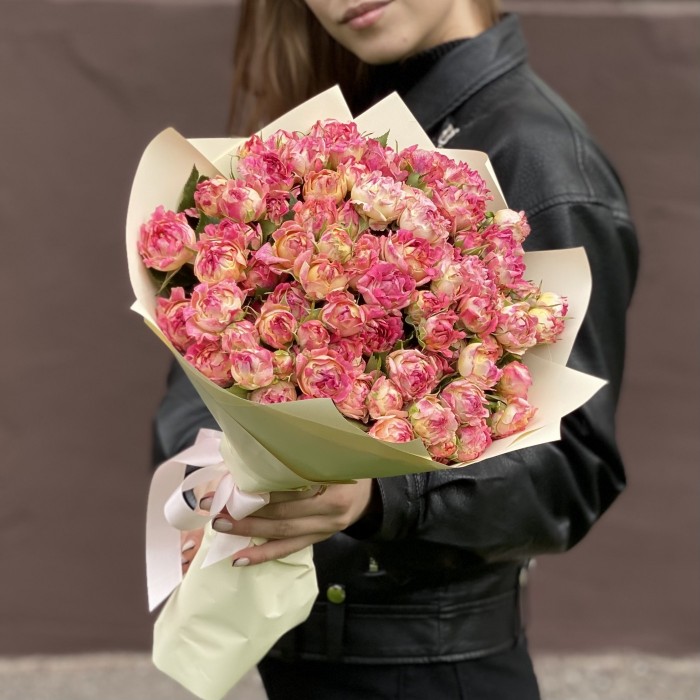 Букет из 25 кустовых роз сорта Лотус в стильной корейской упаковке.Букеты из таких цветов получаются пышными, яркими и выразительными, поэтому они презентабельно смотрятся в любой ситуации.Их дарят на торжество или в знак любви, используют для украшения банкетных залов, ресторанов или кафе, а также декорирования фотозон.
