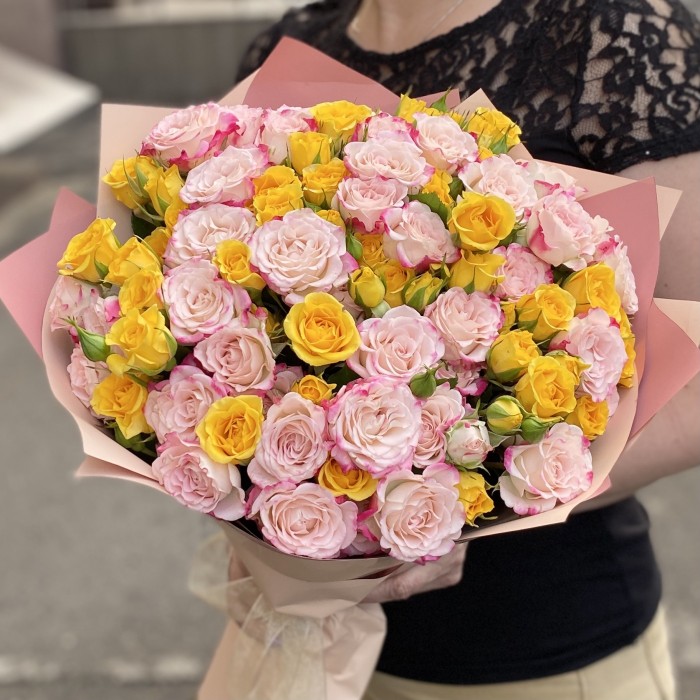 25 нежных кустовых роз разных сортов - прекрасный подарок подруге или коллеге в день рождения!