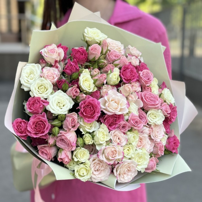 25 нежных кустовых роз разных сортов - прекрасный подарок подруге или коллеге в день рождения!