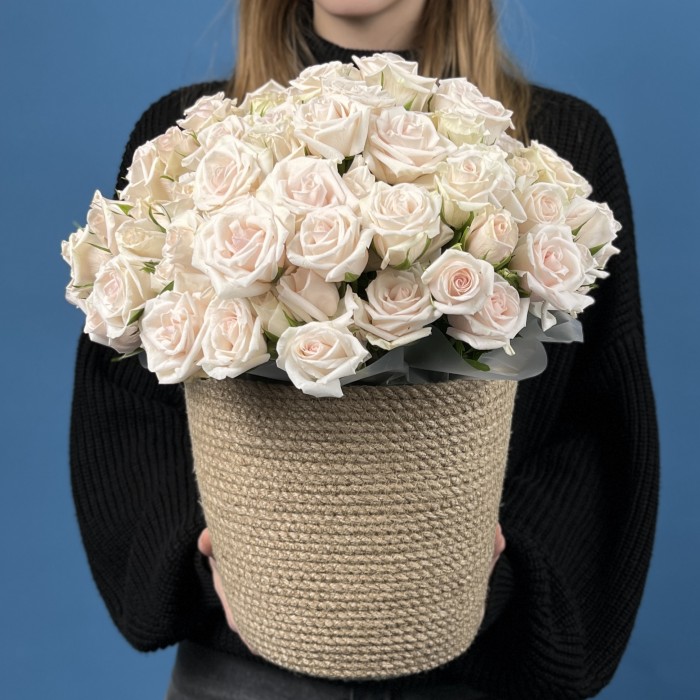 Композиция из 25 кустовых роз Роял Порцелина в кашпо — элегантное сочетание утончённости и гармонии. Нежно-кремовые бутоны с мягким розовым оттенком создают атмосферу спокойствия и изысканности. Стильное кашпо подчёркивает благородный характер цветов, превращая композицию в утончённый акцент для любого интерьера.