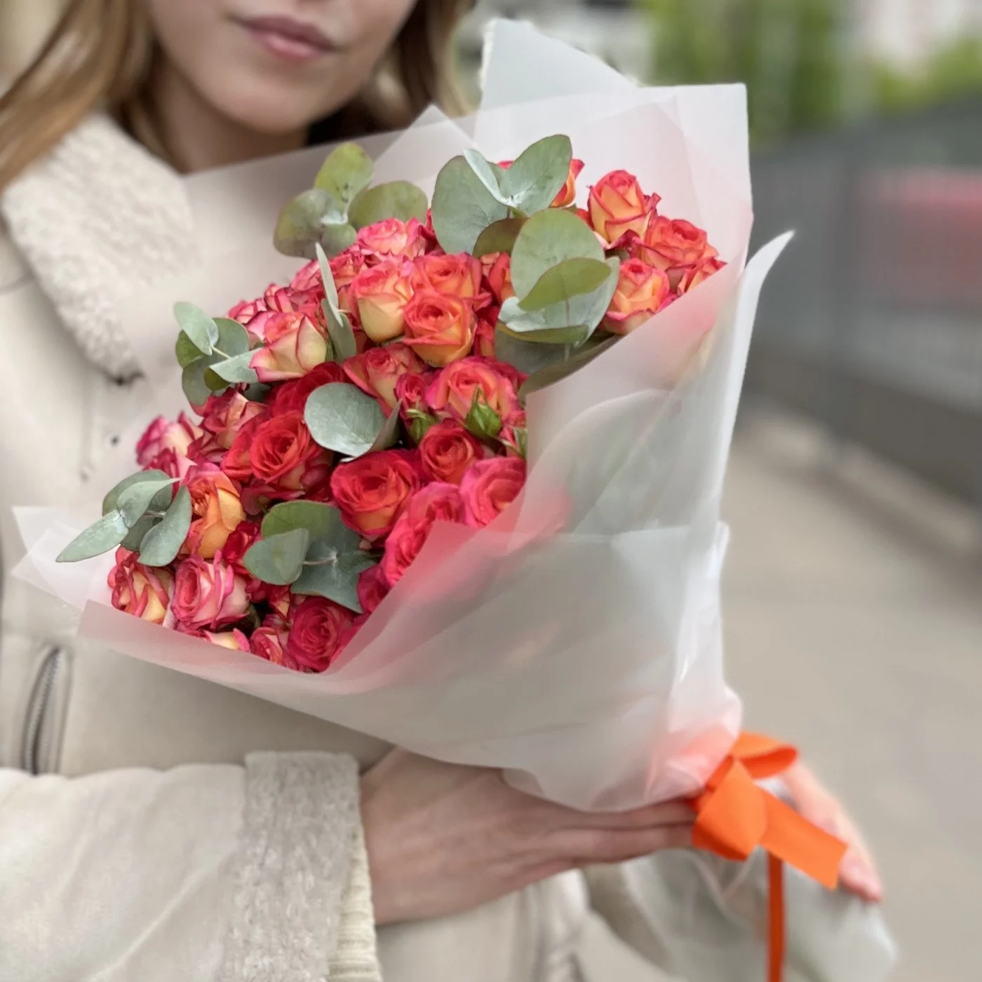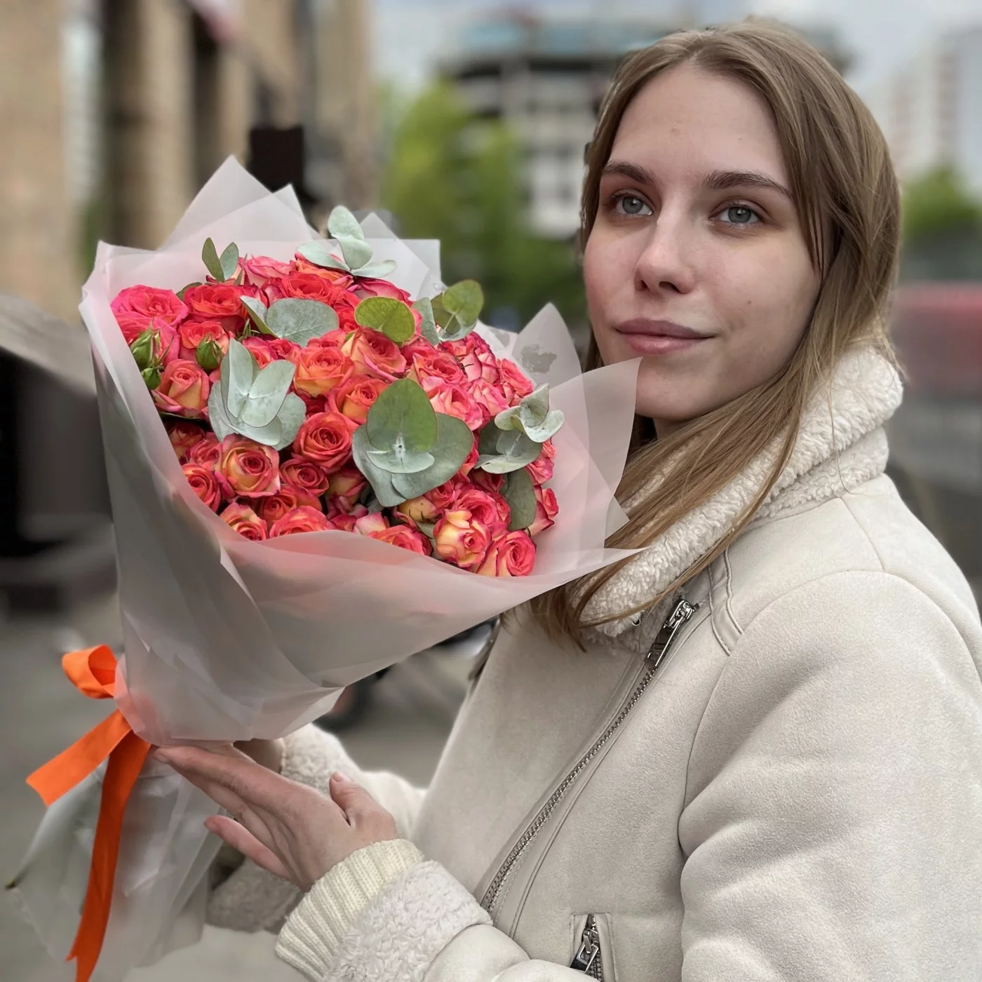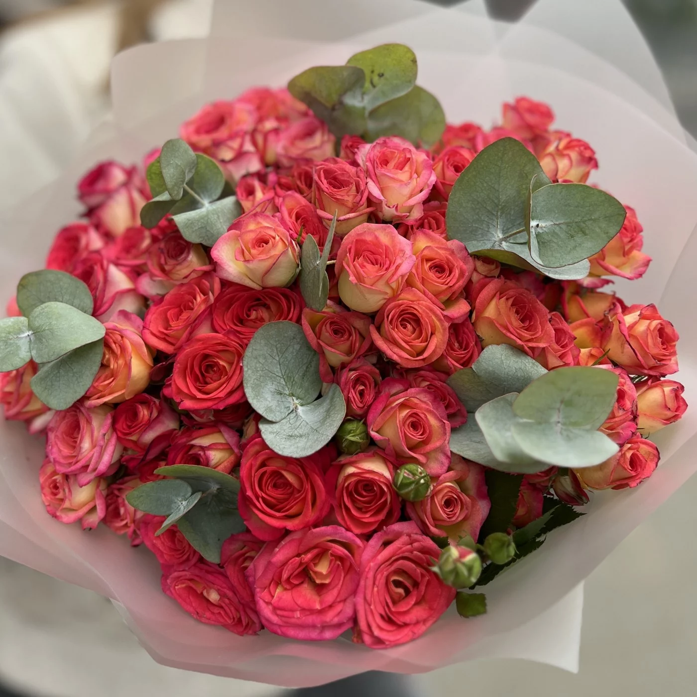25 кустовых роз Саммер Дэнс с эвкалиптом
