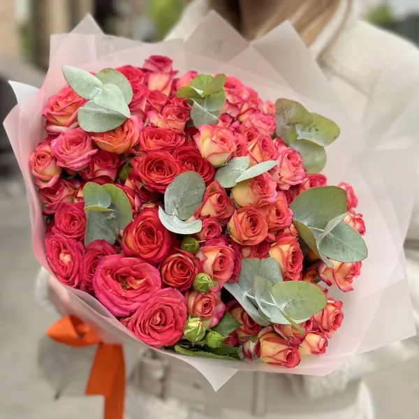 Этот изысканный букет состоит из 25 кустовых роз сорта "Саммер Денс" в сочетании с нежными веточками эвкалипта. Яркие, насыщенно-розовые цветы создают атмосферу тепла, радости и весеннего настроения, а аромат эвкалипта добавляет свежести и легкости композиции. Такой букет станет прекрасным подарком для выражения любви, благодарности или просто чтобы порадовать близких.