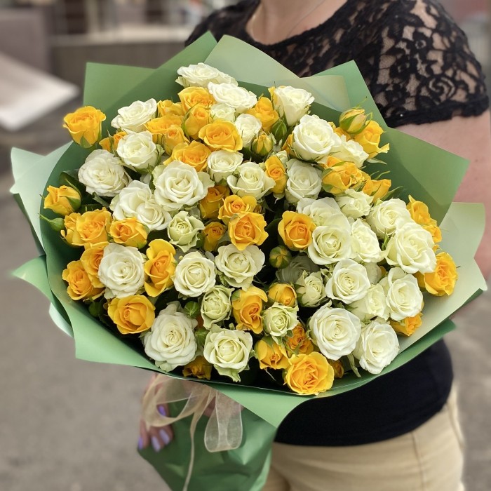 Роза кустовая желтая - 13 шт, роза кустовая белая - 12 шт, упаковка.