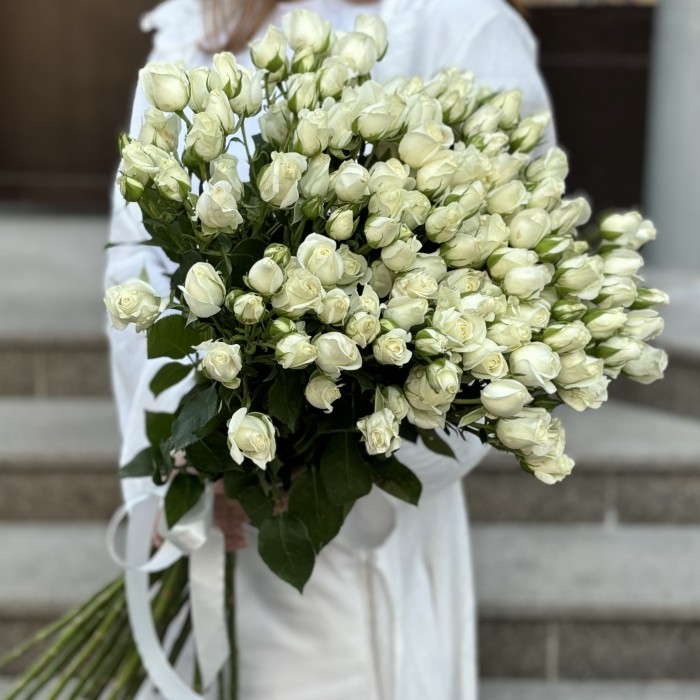 Стильный букет из 25 кустовых белых роз сорта Сноу Бабл — это настоящий шедевр флористики, который станет прекрасным подарком на любое торжество. Эти розы известны своими нежными, бархатистыми лепестками и элегантным белоснежным оттенком. Каждая роза в букете символизирует чистоту и искренность, создавая гармоничную и утонченную композицию, которая привлекает внимание своей изысканностью.