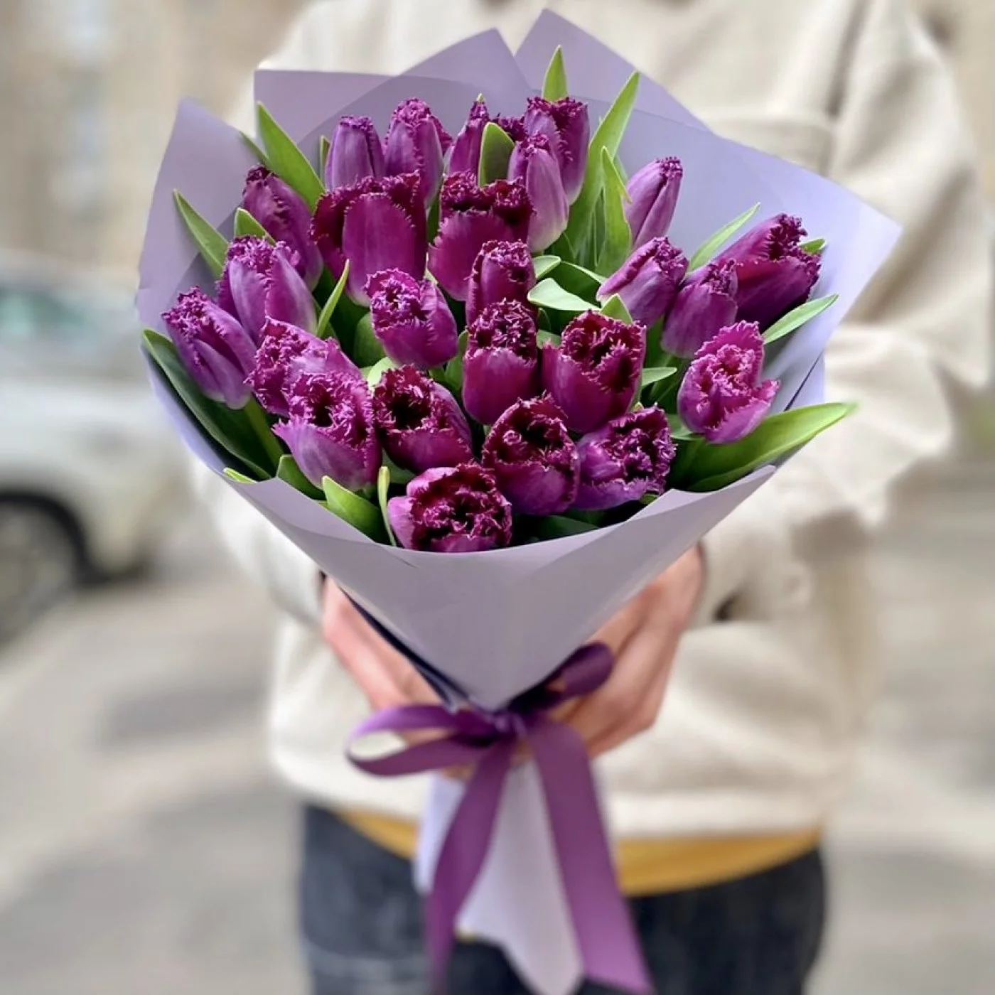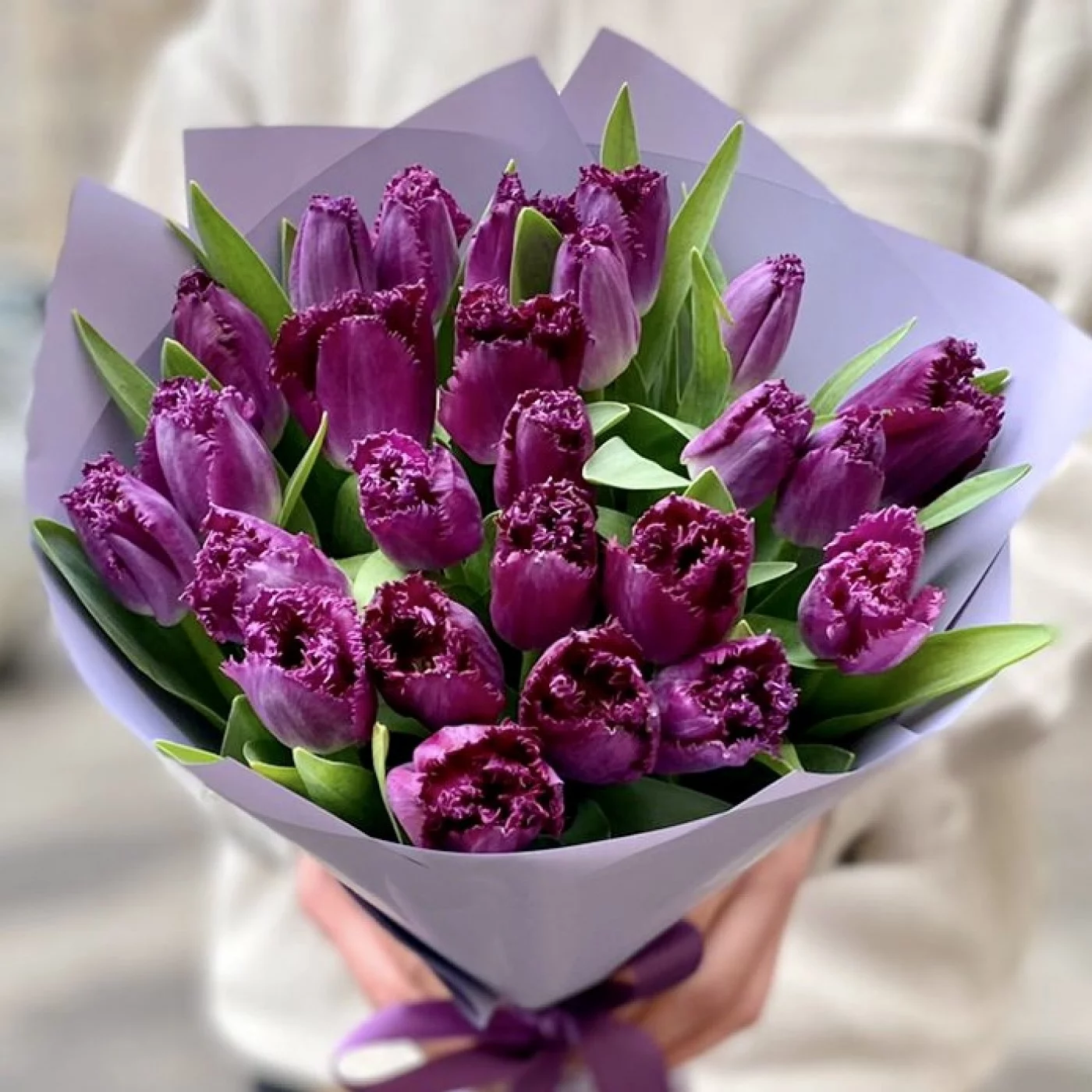 Тюльпаны насыщенного фиолетового цвета с бахромой на кончиках в упаковке в тон – весенний букет-комплимент на любое событие.